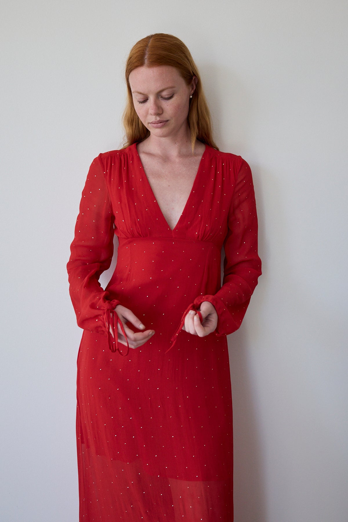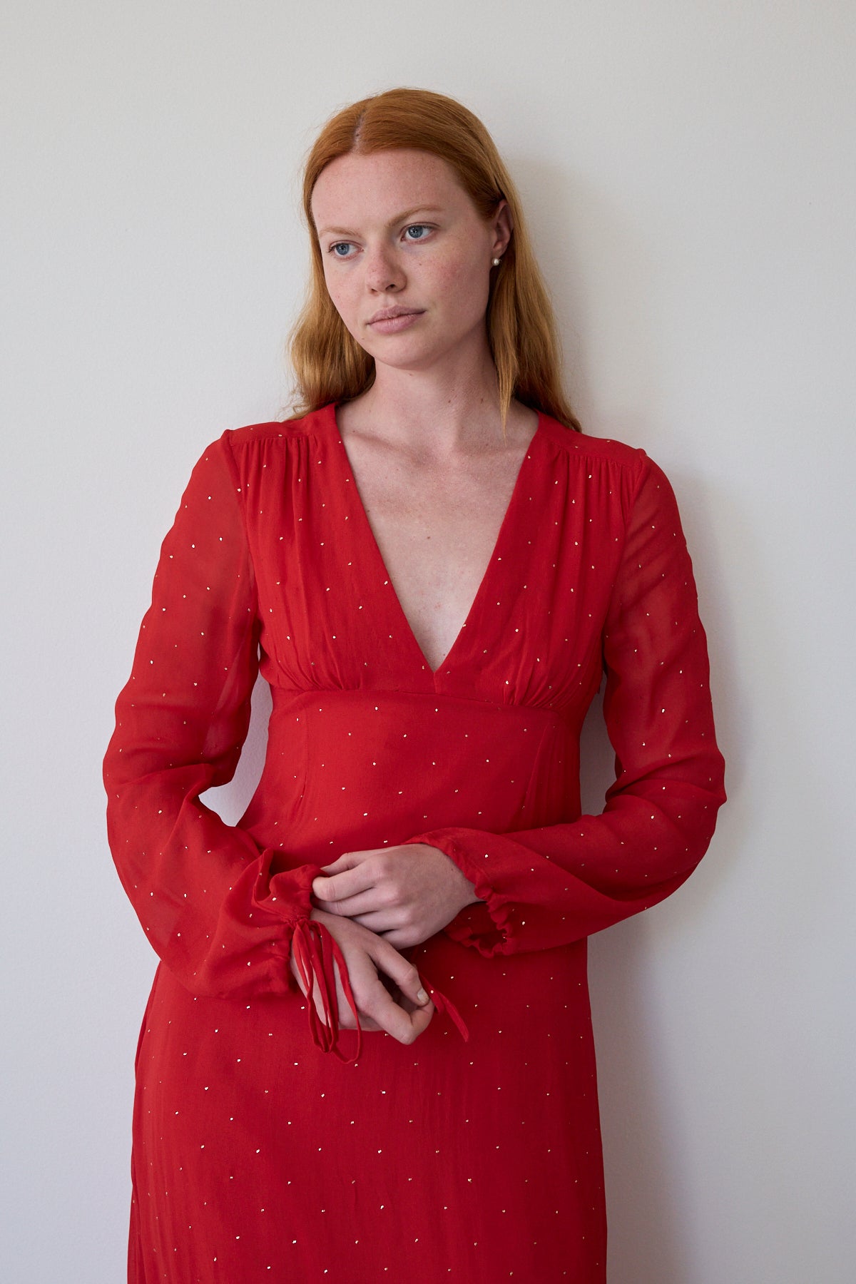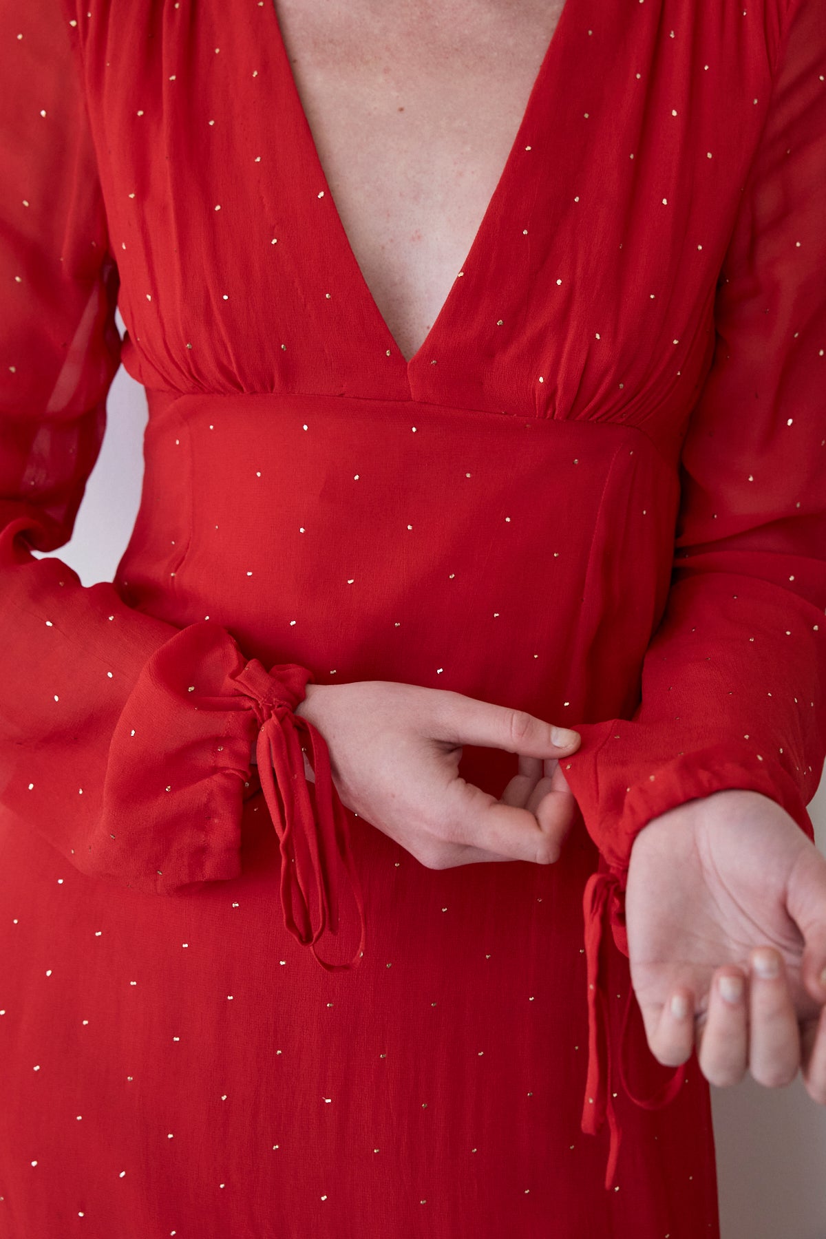 A maxi length dress featuring mukeish hand embroidery silver stars through. A front V neck with ruching detail on shoulders and below waist seam. Bodice fully lined in voile. Ties for fastening and adjusting sleeve length on cuff. Side zipper. Side pockets.