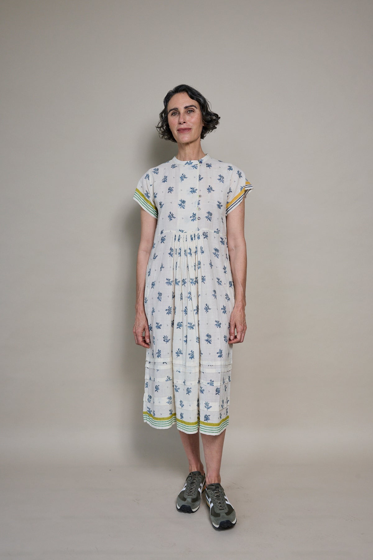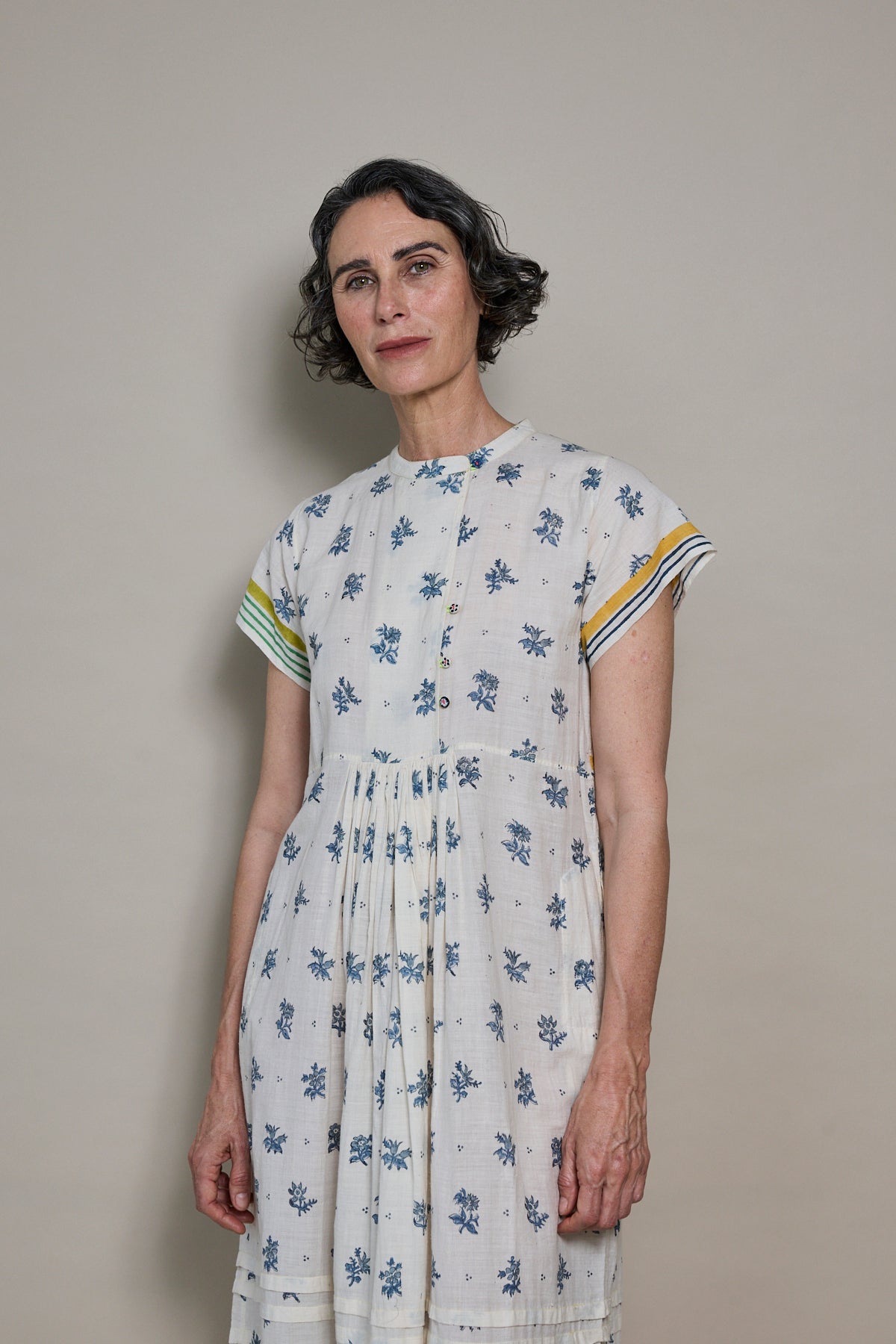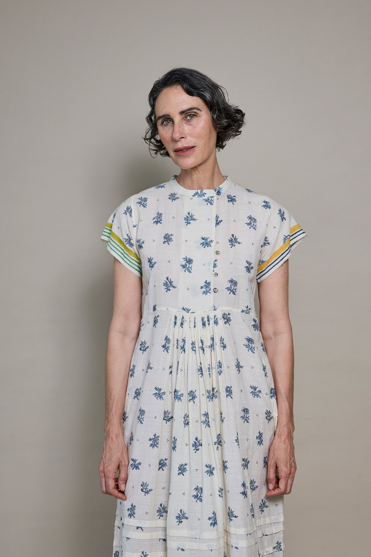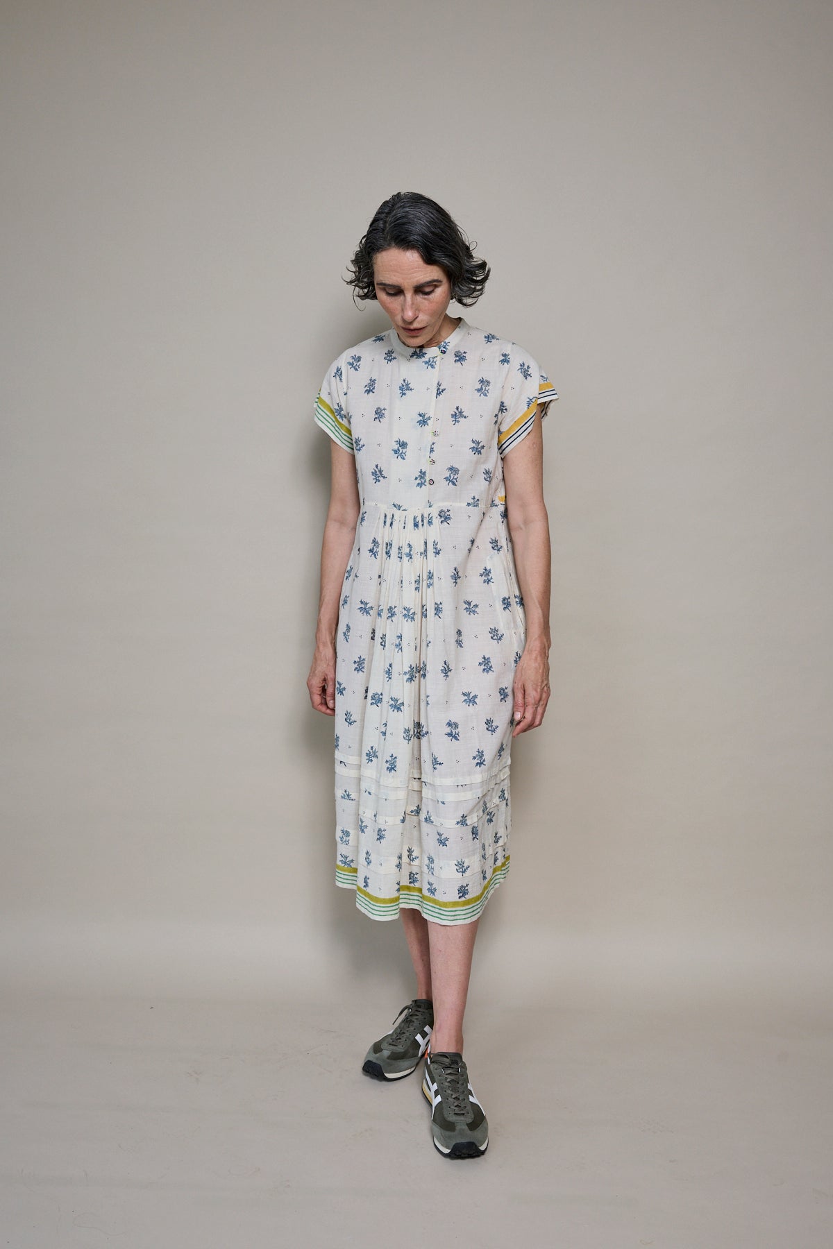 A short sleeved handwoven cotton dress. Features floral hand blockprint design through the dress in contrast indigo. High neck with front bodice and triple button and loop closure. Handmade and painted individual button detail. Ruching below yoke on front and back. Pleats above hemline. Olive green and yellow selvedge along hemline and sleeves. Side slit pockets.