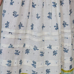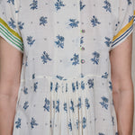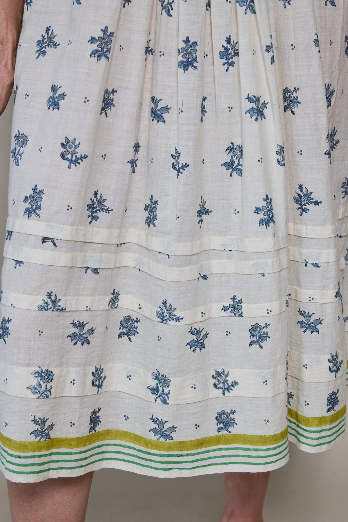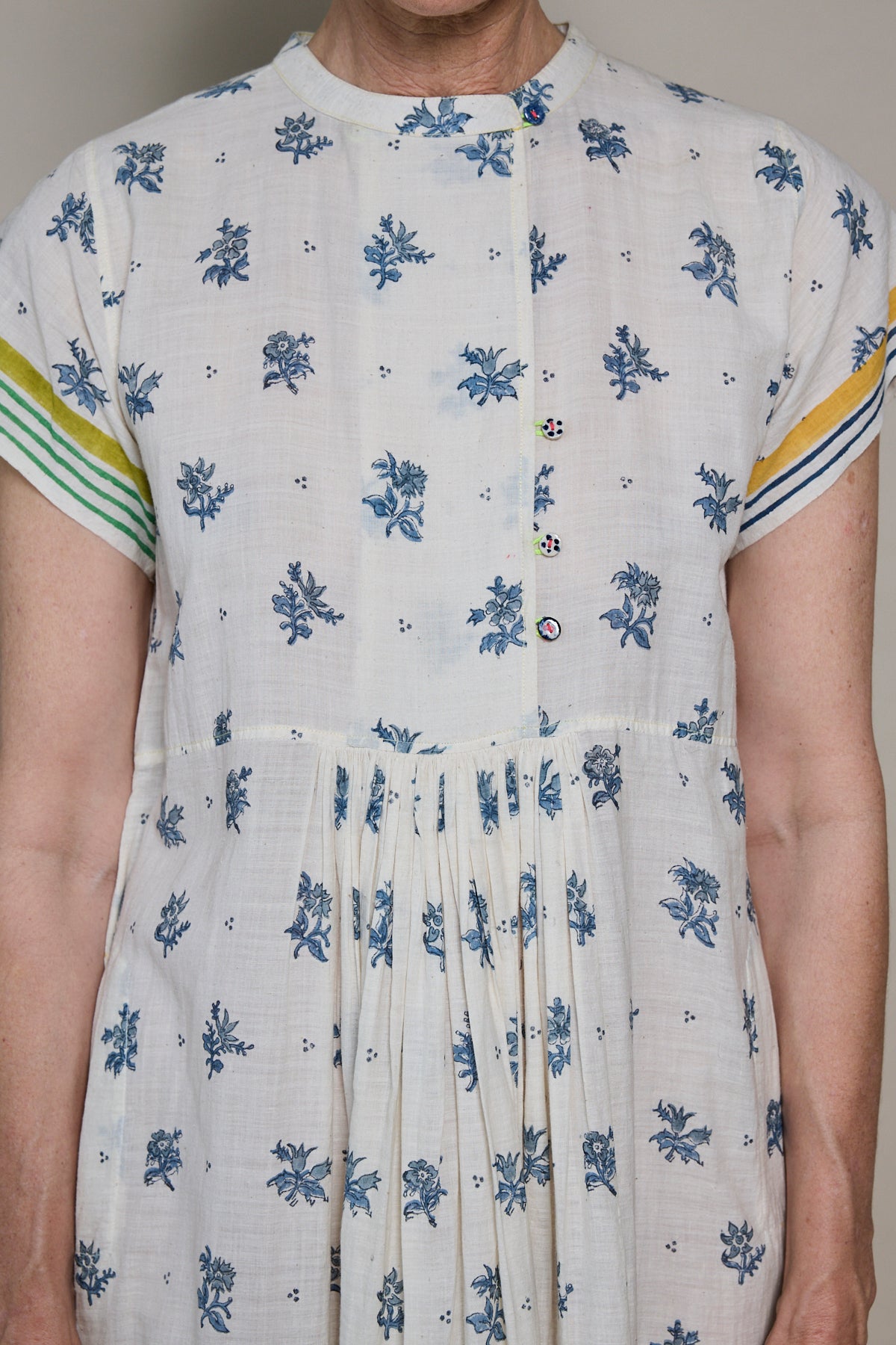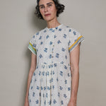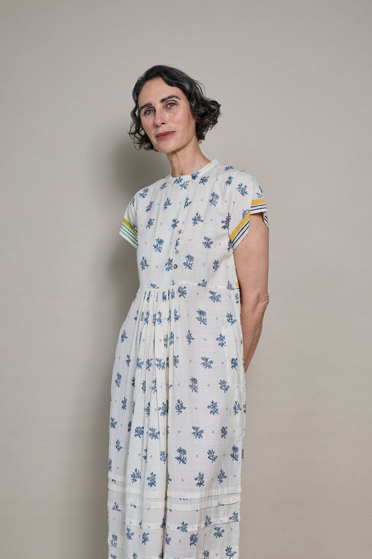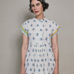 A short sleeved handwoven cotton dress. Features floral hand blockprint design through the dress in contrast indigo. High neck with front bodice and triple button and loop closure. Handmade and painted individual button detail. Ruching below yoke on front and back. Pleats above hemline. Olive green and yellow selvedge along hemline and sleeves. Side slit pockets.