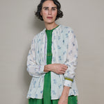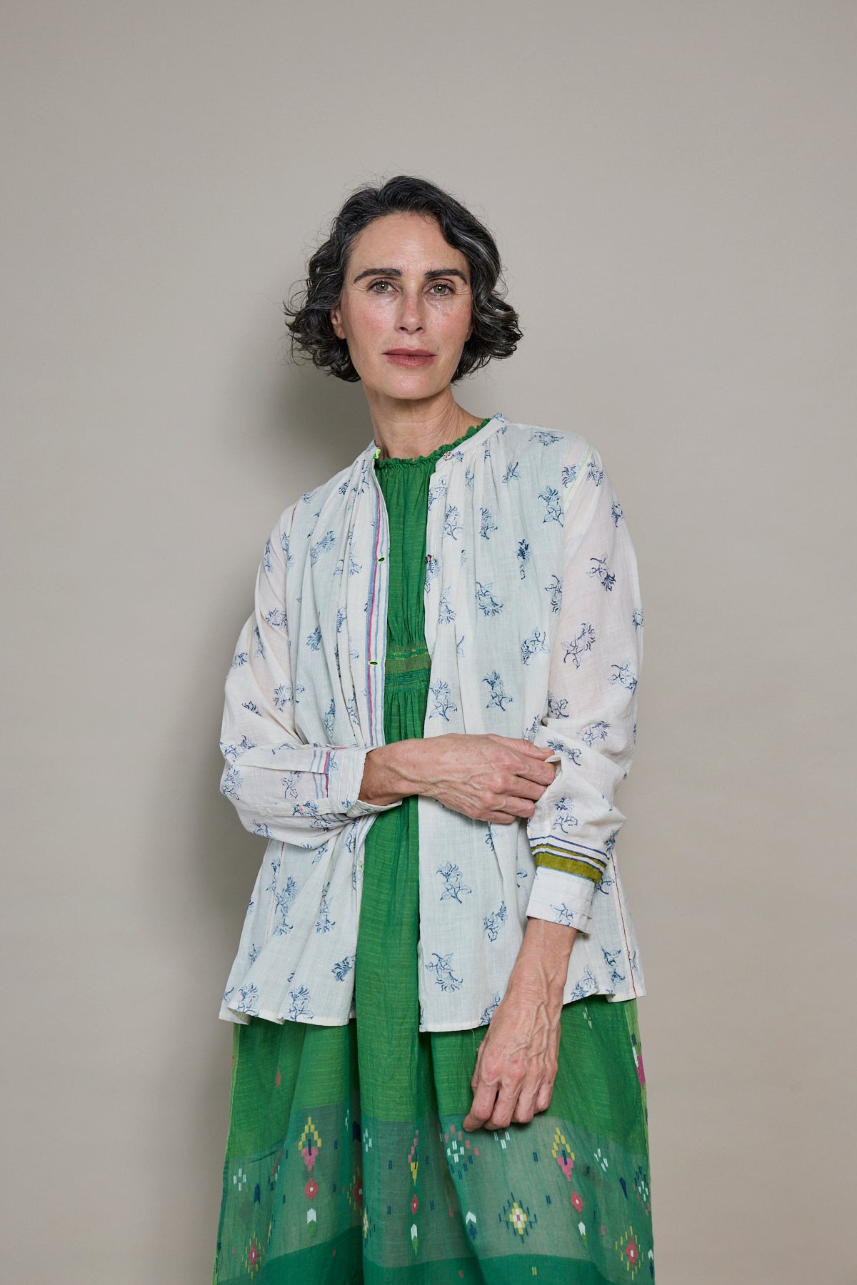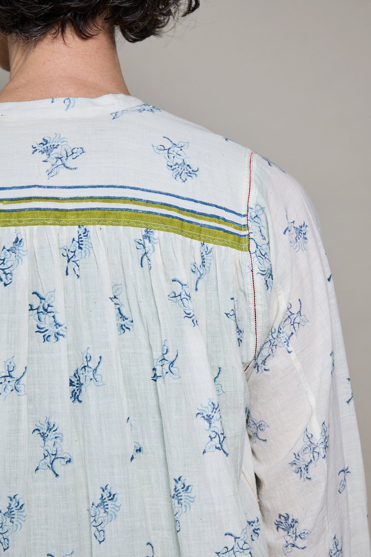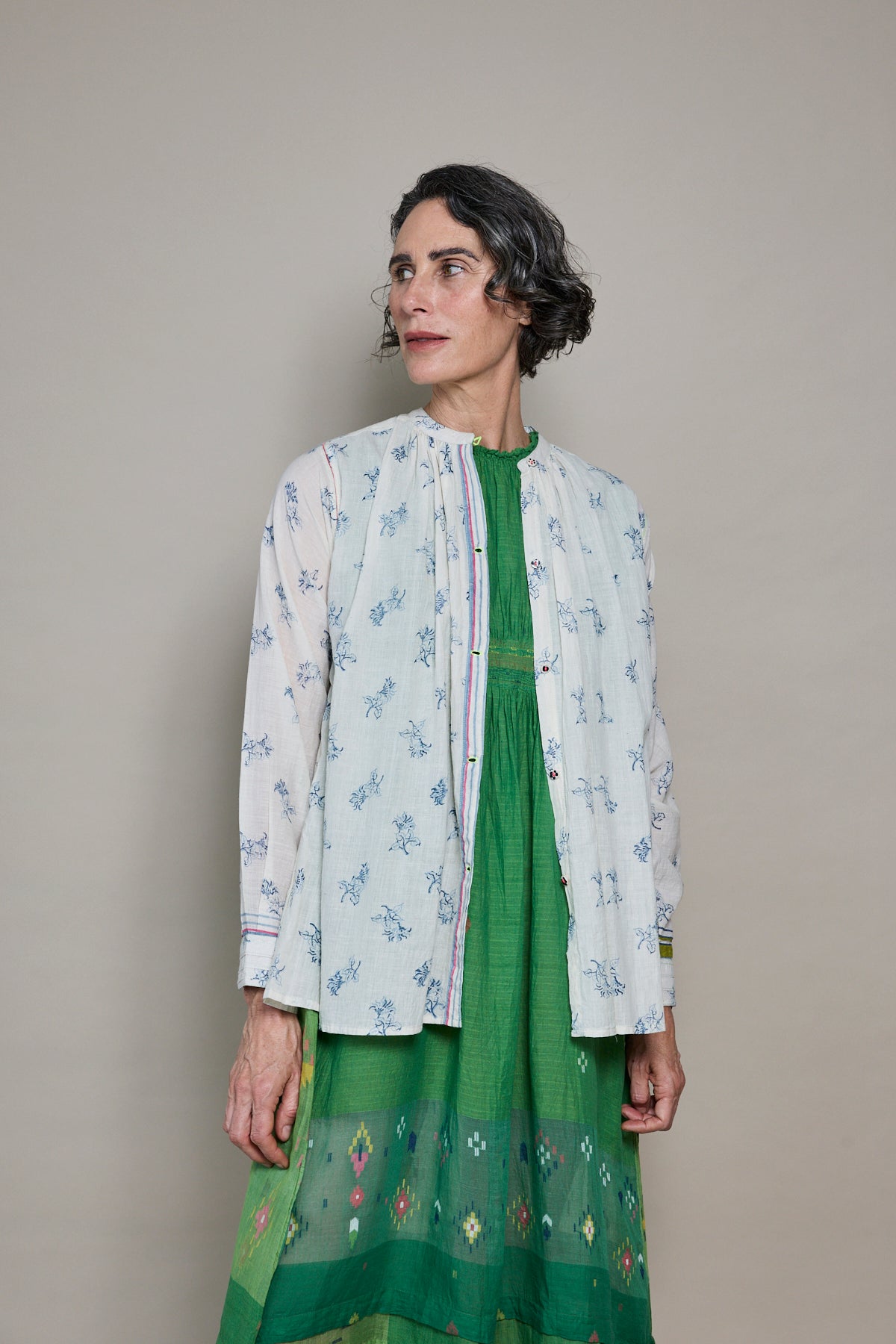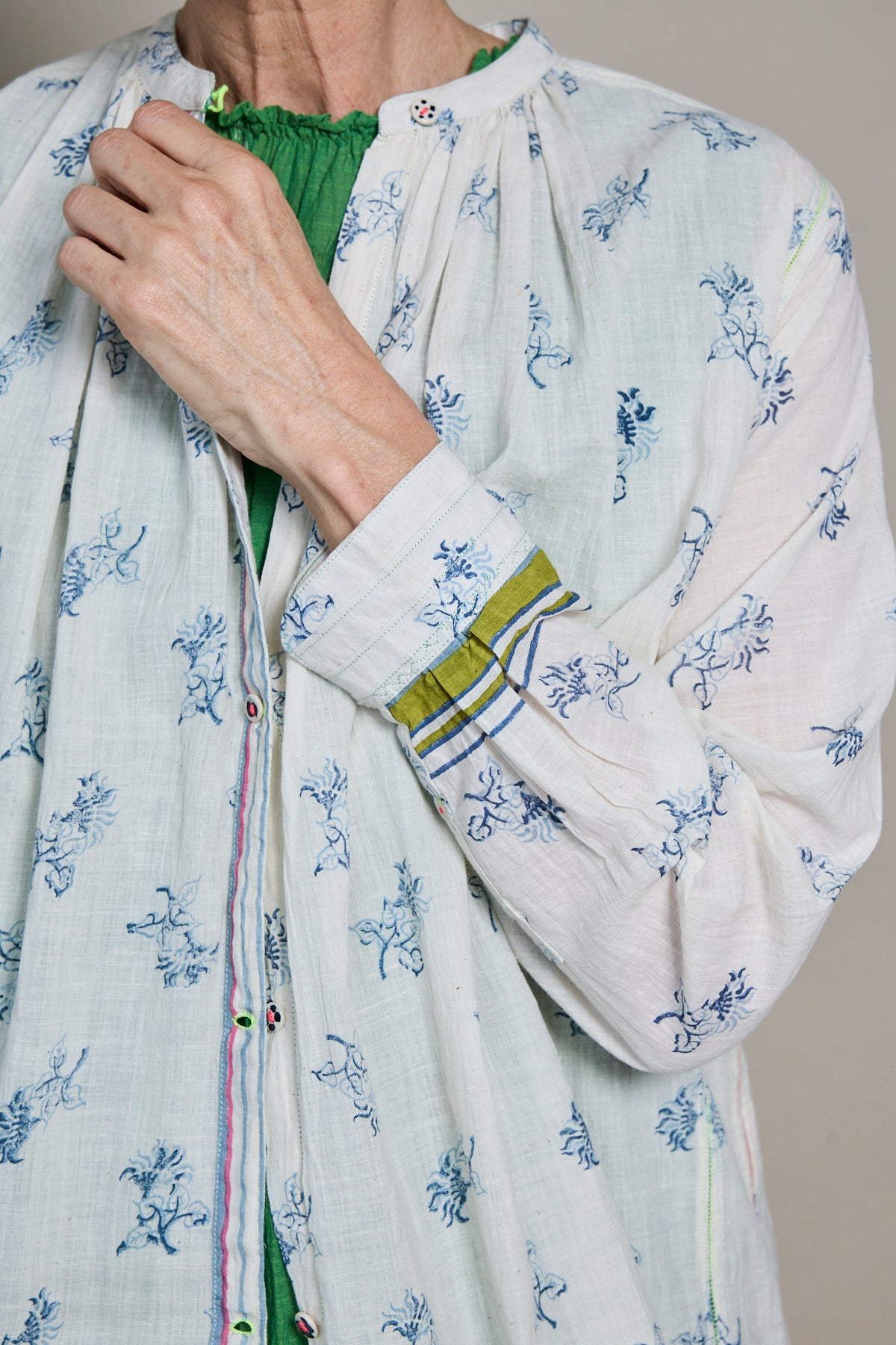 A long sleeved shirt handwoven in 100% cotton. Features a high neck and a button down front with floral indigo blockprint throughout. Individual buttons handmade in different unique patterns. Stripe detail in red and blue along front closure and cuffs. Pleats throughout the shirt.