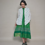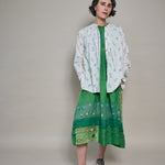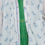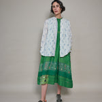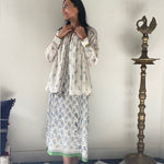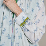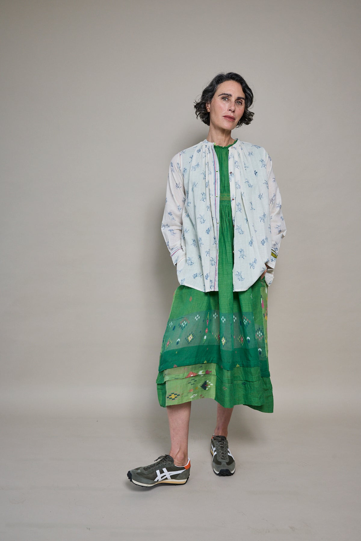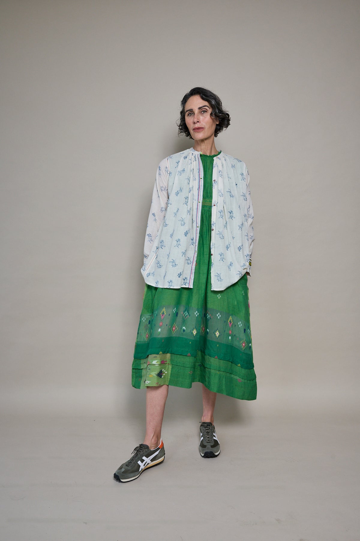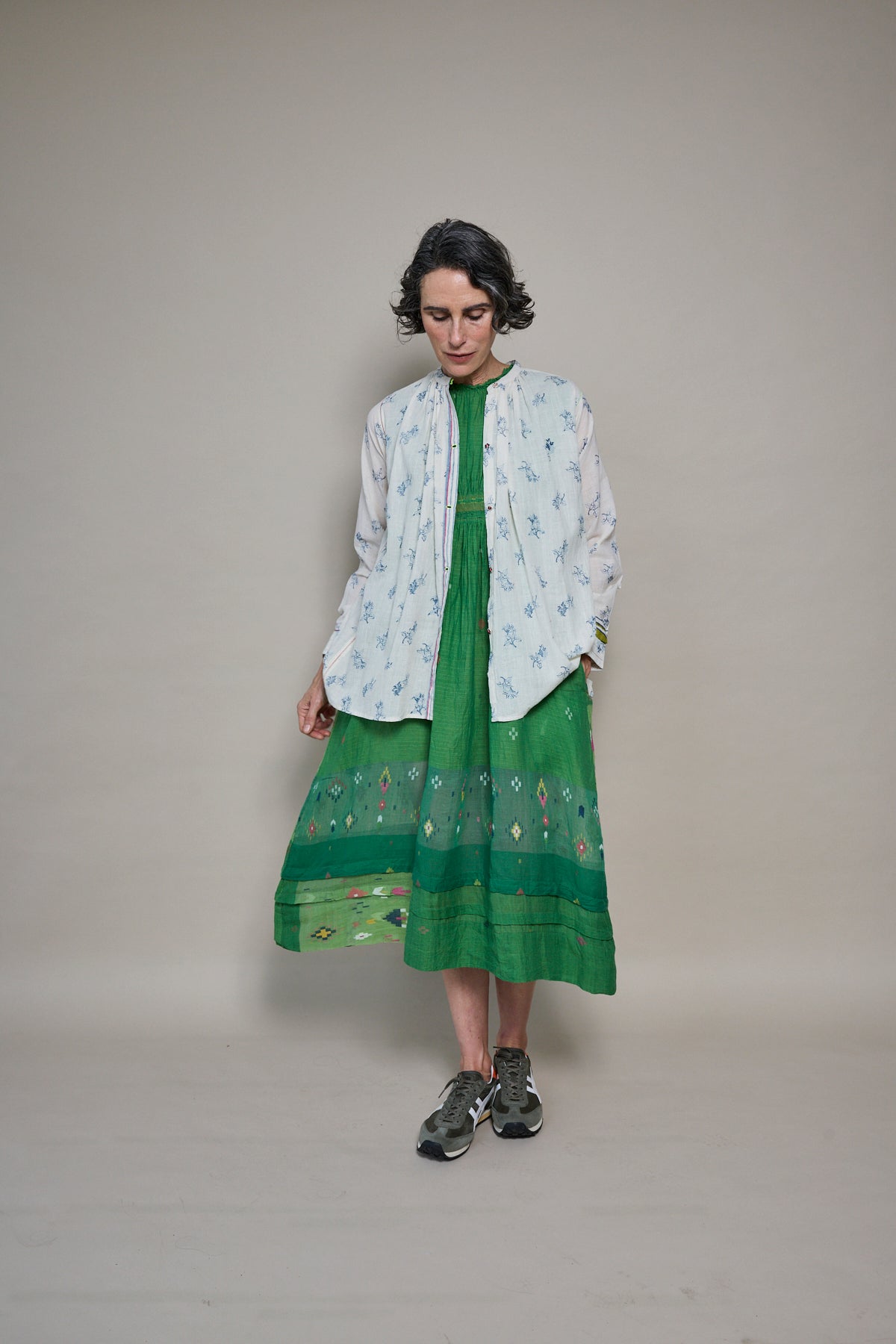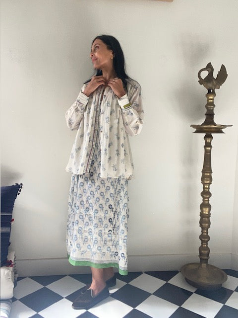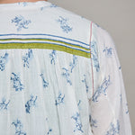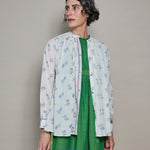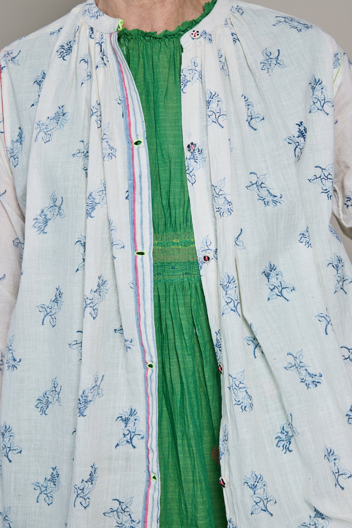 A long sleeved shirt handwoven in 100% cotton. Features a high neck and a button down front with floral indigo blockprint throughout. Individual buttons handmade in different unique patterns. Stripe detail in red and blue along front closure and cuffs. Pleats throughout the shirt.