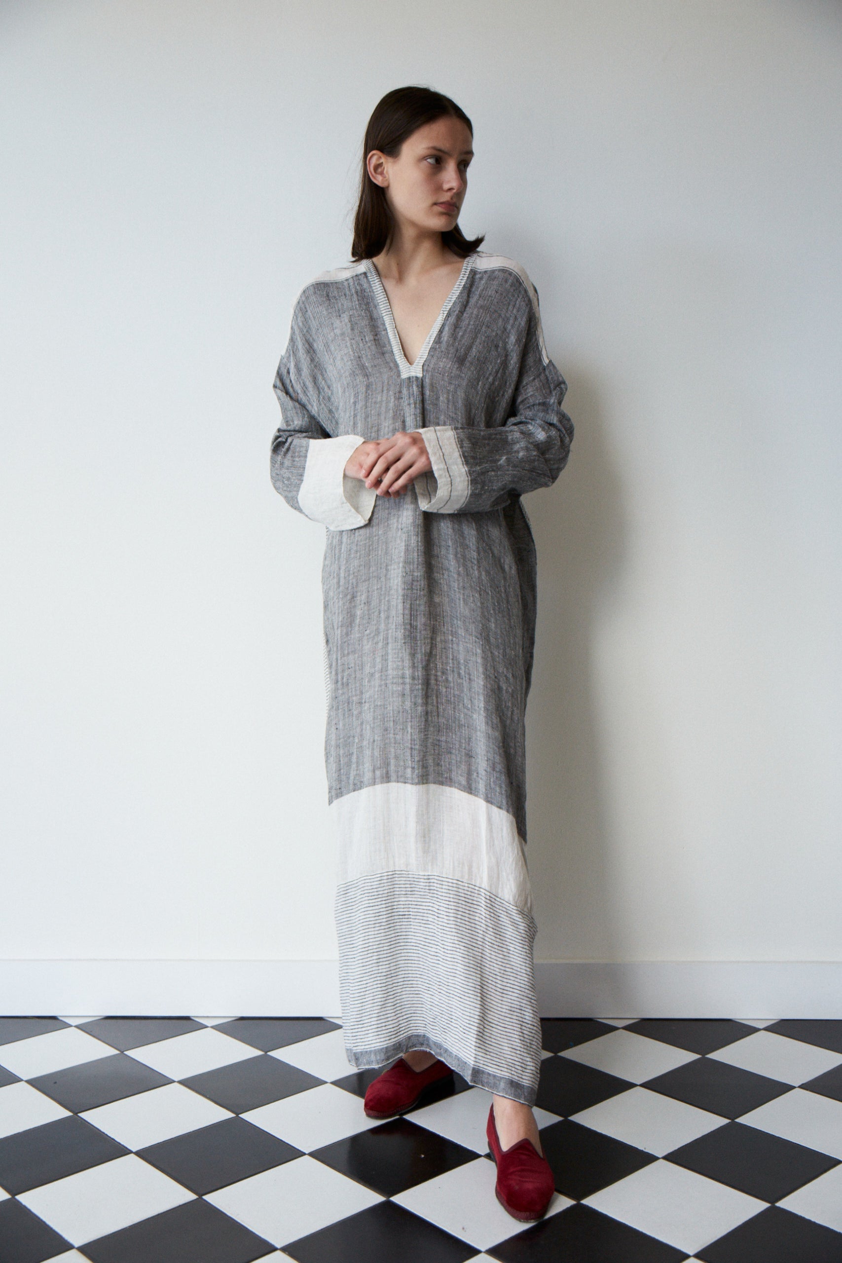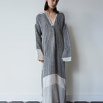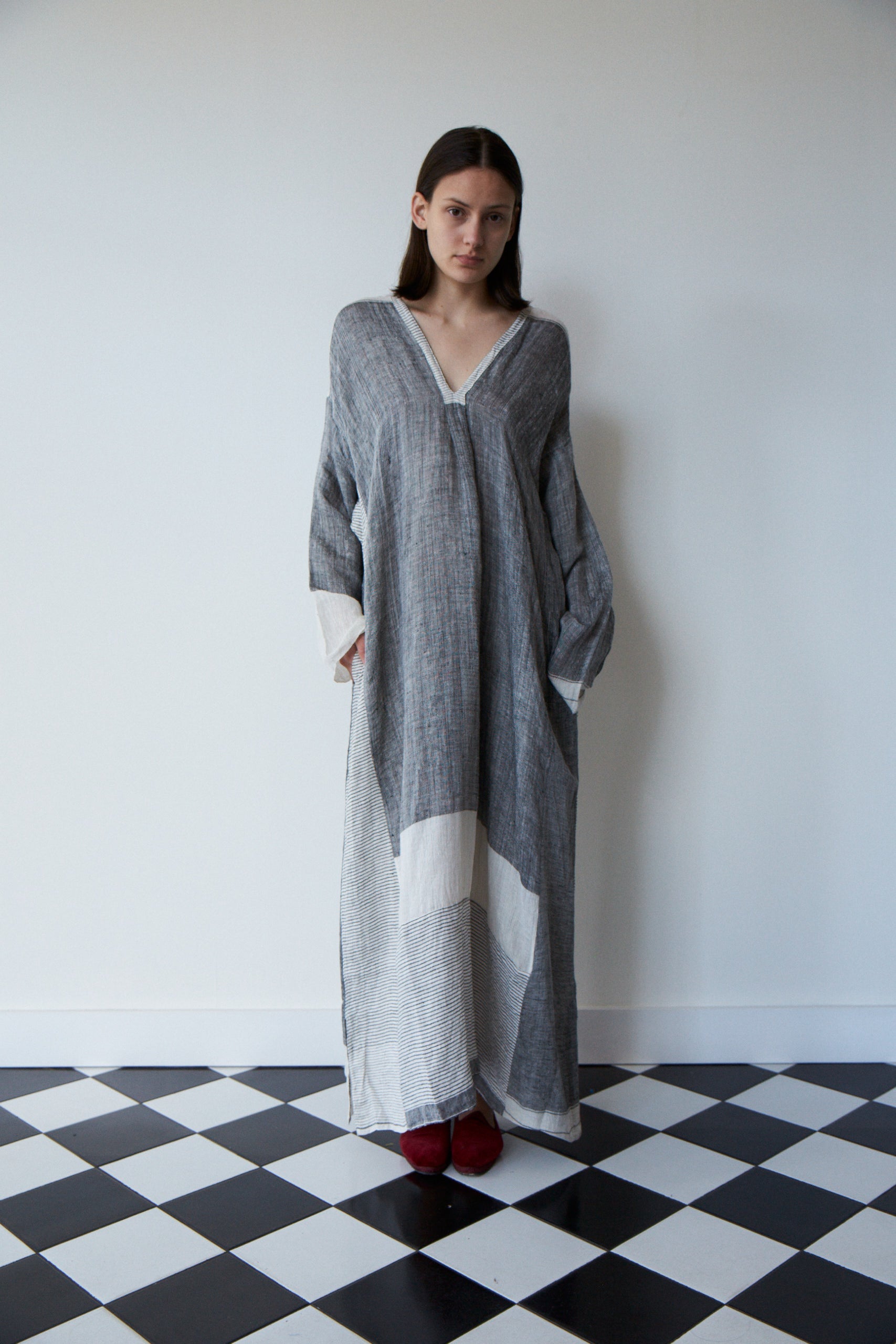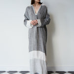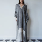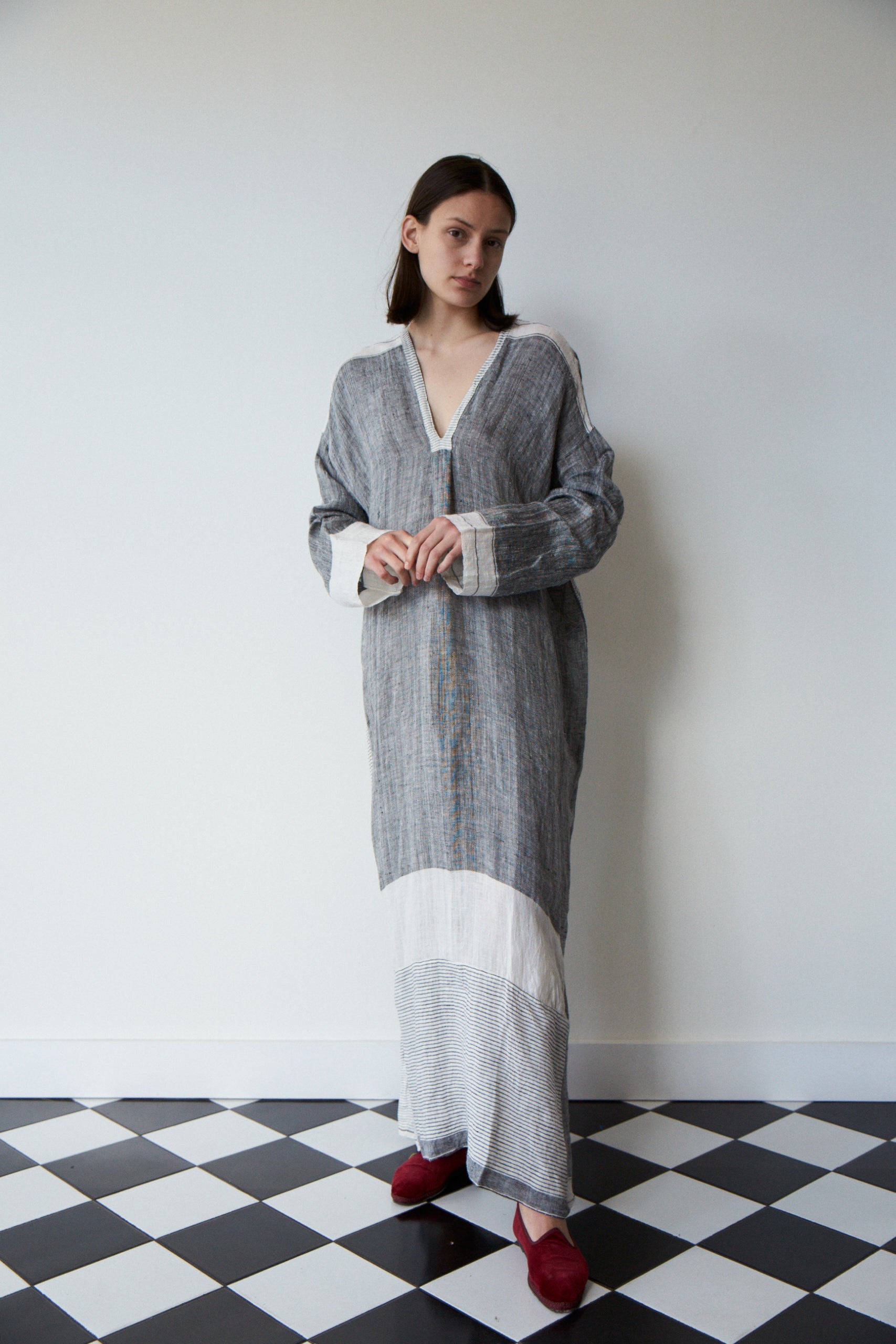 A delicate caftan style dress. Features a v-neck in the front and back with multiple panels of handwoven grey and white pure linen. Long sleeves with side pockets and small side slits in hemline. Maxi length. Slightly sheer finish and relaxed, oversized style.