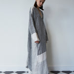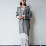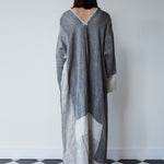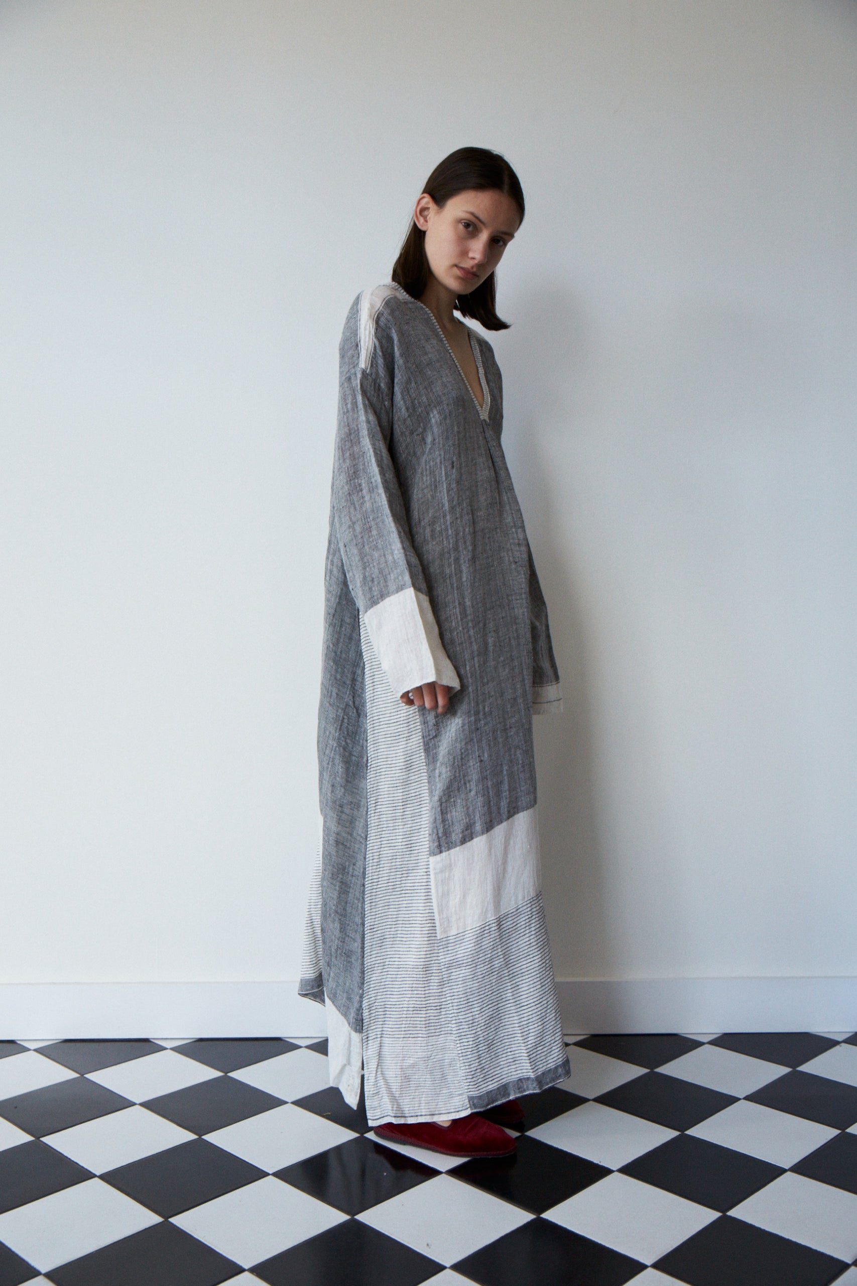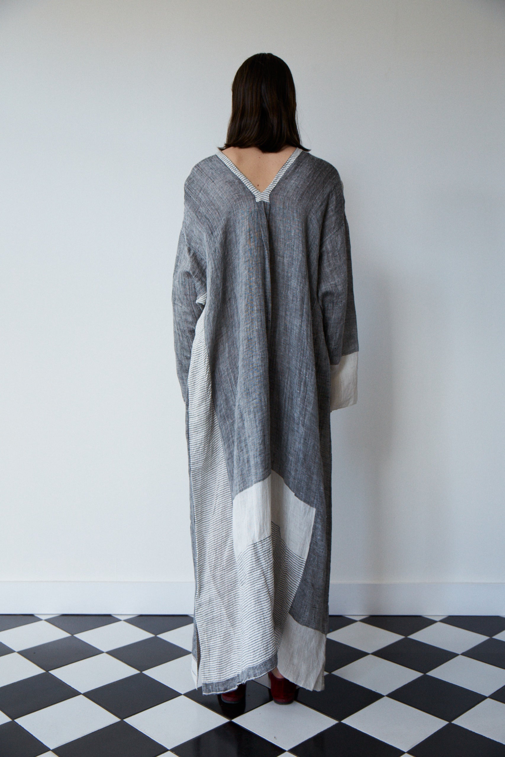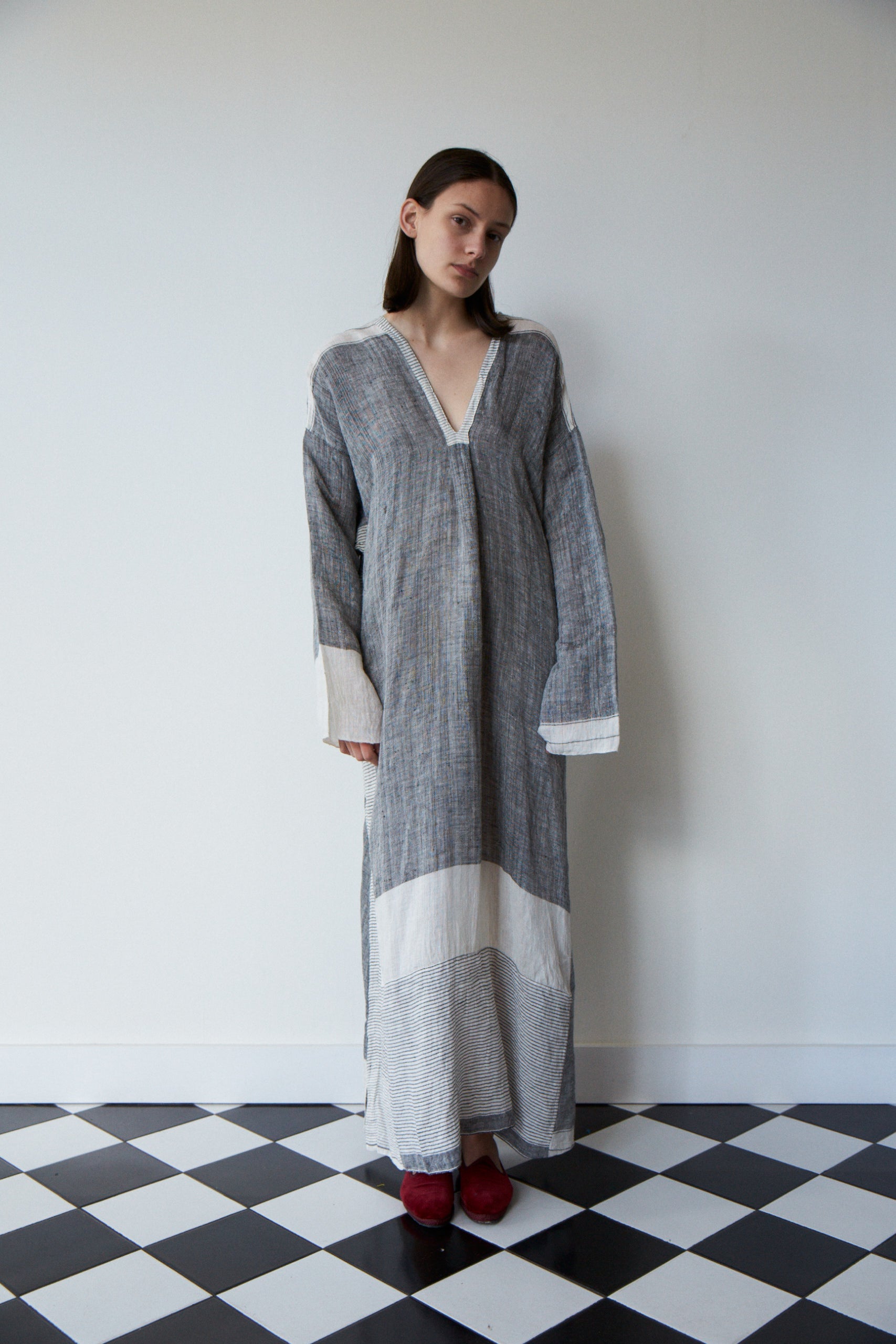 A delicate caftan style dress. Features a v-neck in the front and back with multiple panels of handwoven grey and white pure linen. Long sleeves with side pockets and small side slits in hemline. Maxi length. Slightly sheer finish and relaxed, oversized style.