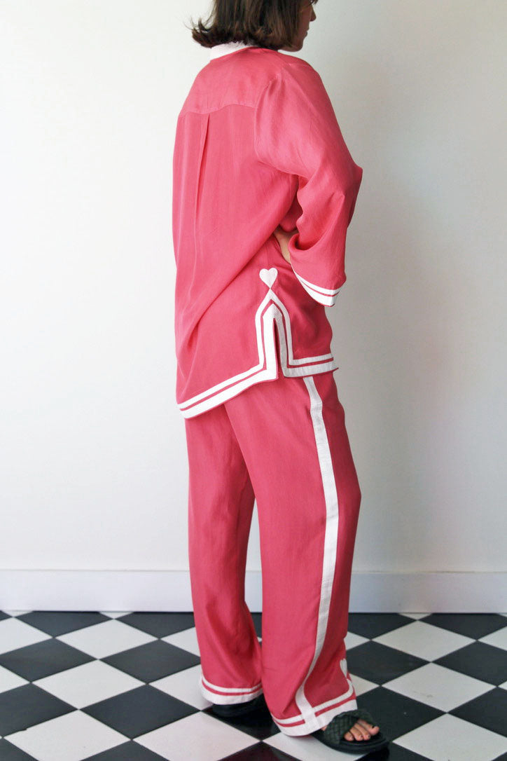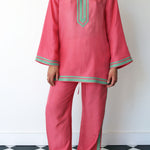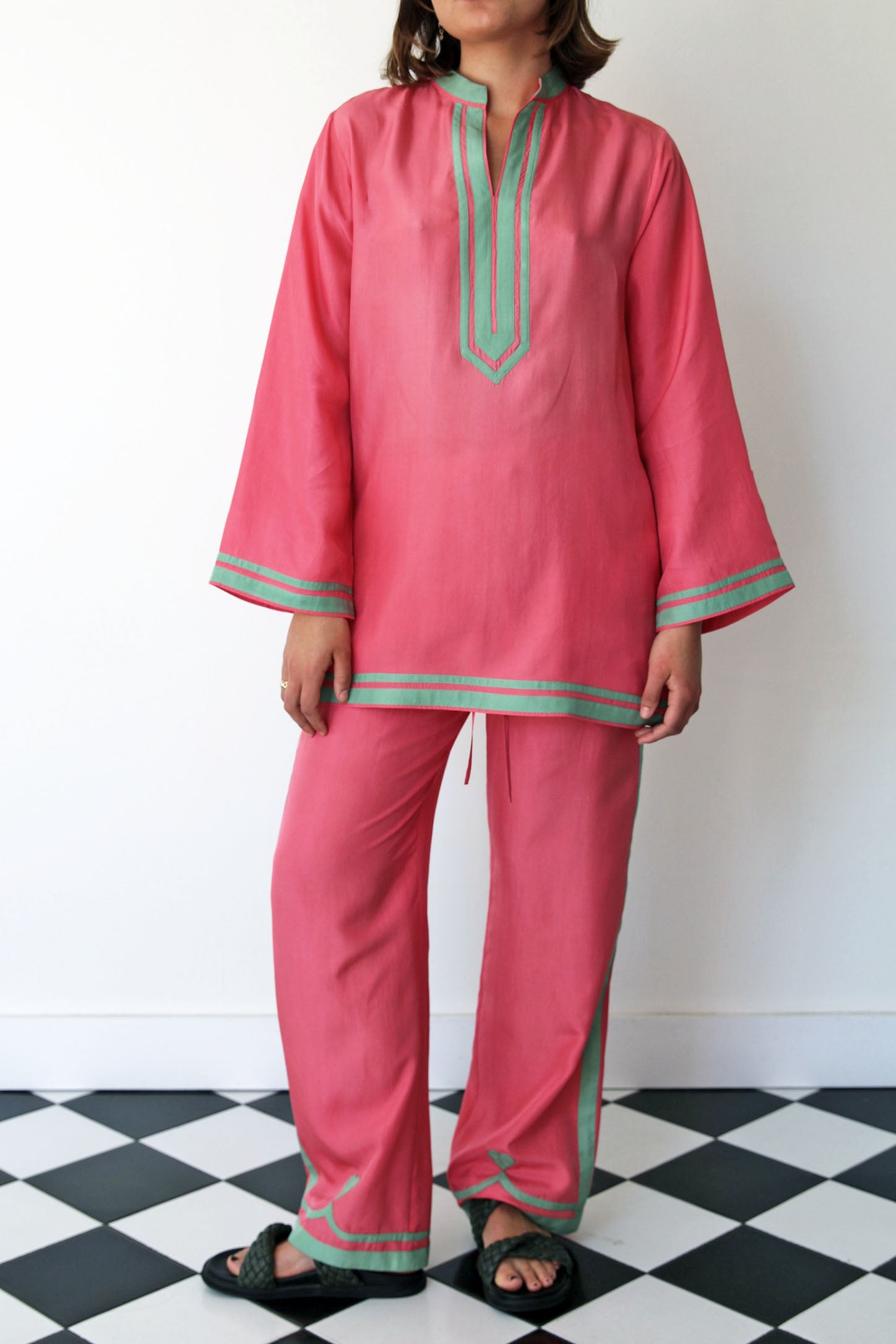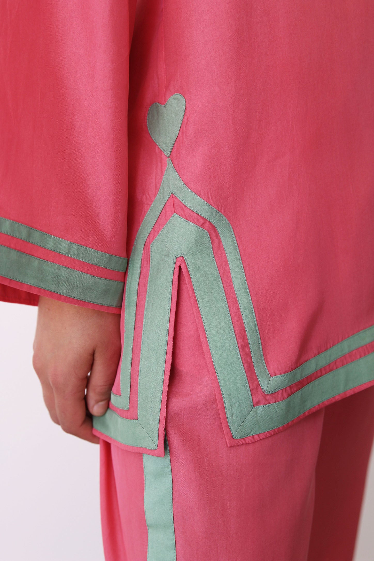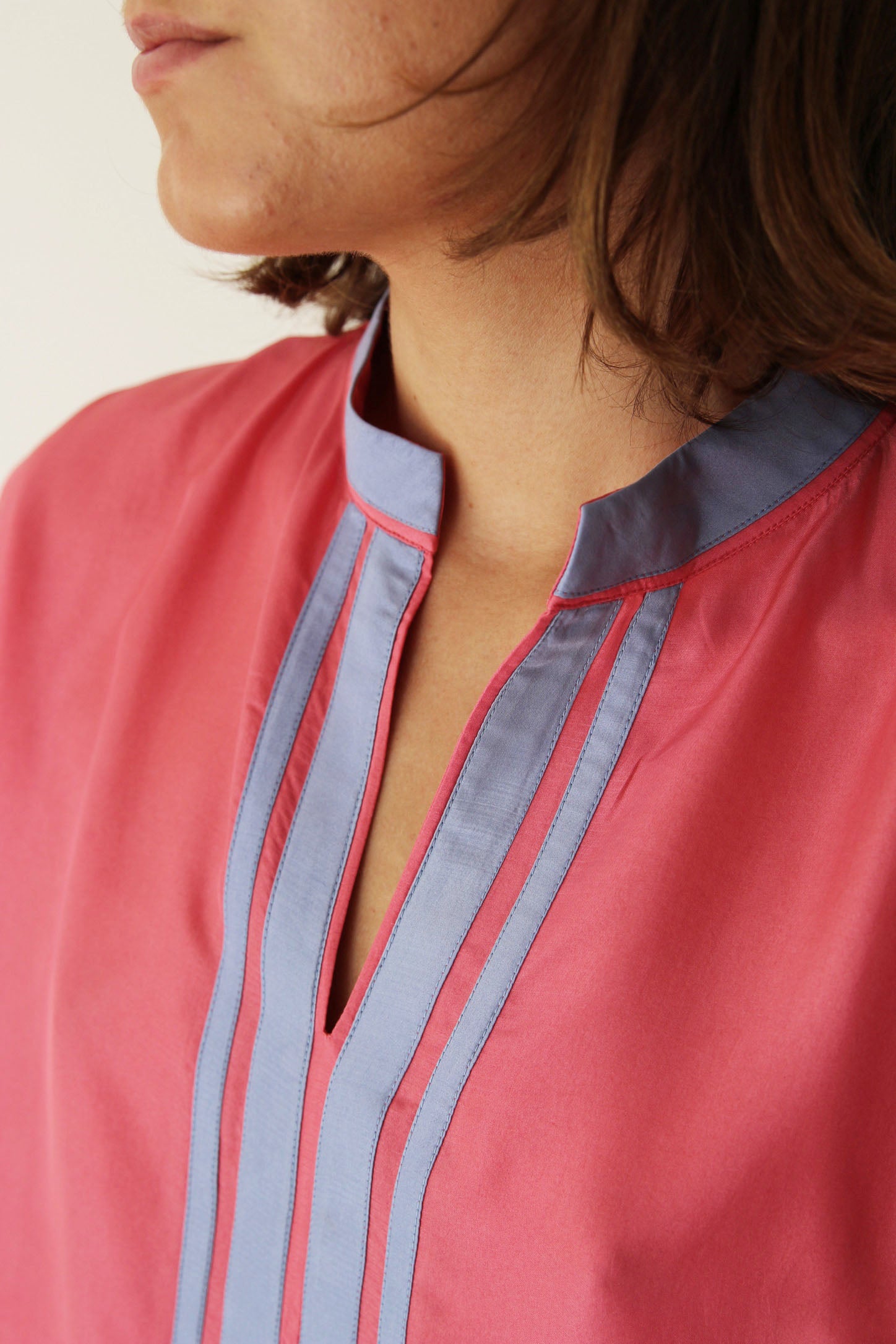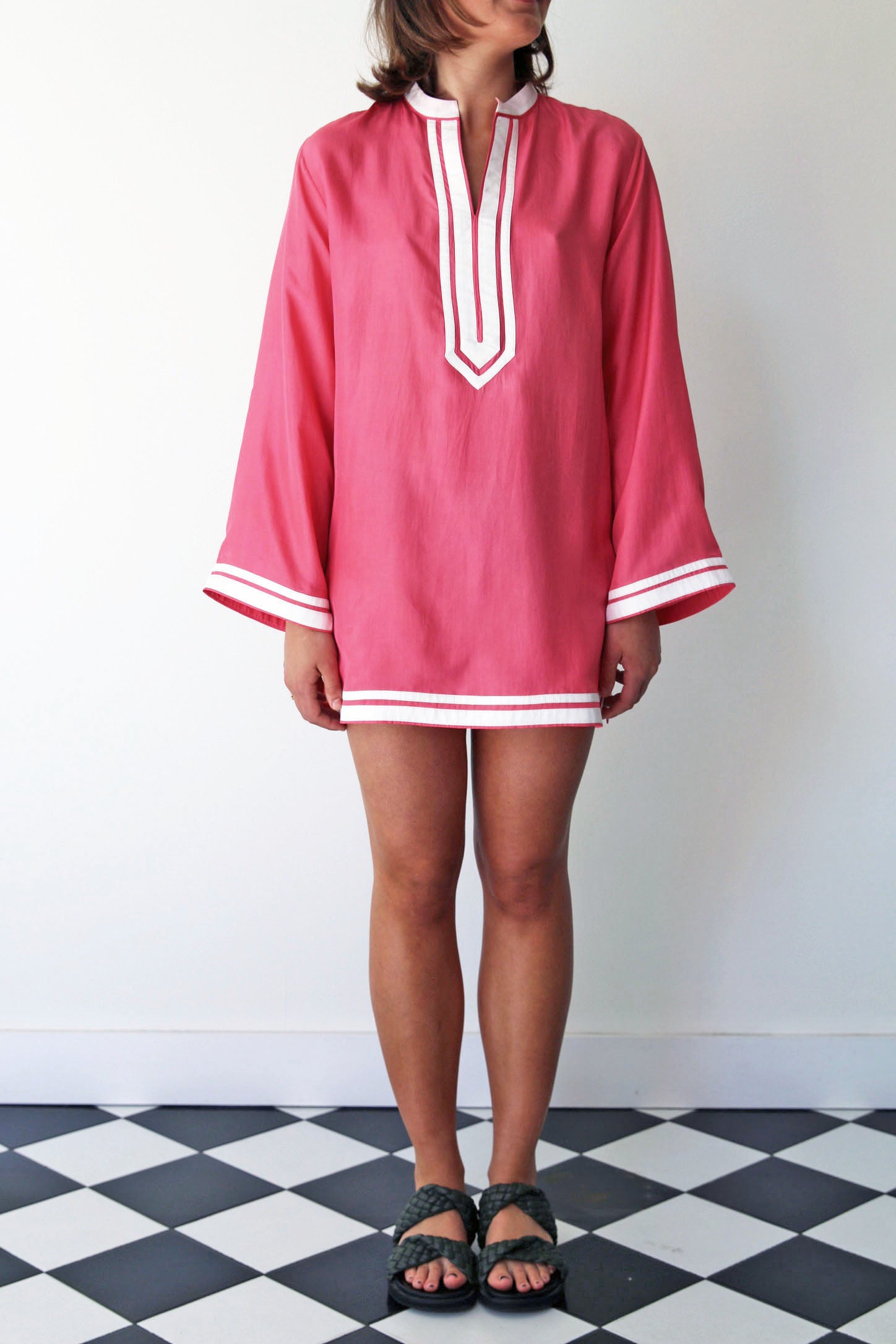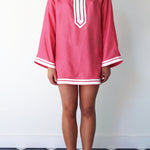 A mini tunic in 100% silk. Features a straight silhouette with high neck and long bell sleeves. Contrast silk trim detail along neck, sides and hem. White, blue or green trim options. Hand cut and stitched heart detail on sides. Side slits. Can be paired over pants or worn on it's own as a mini dress.