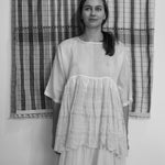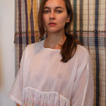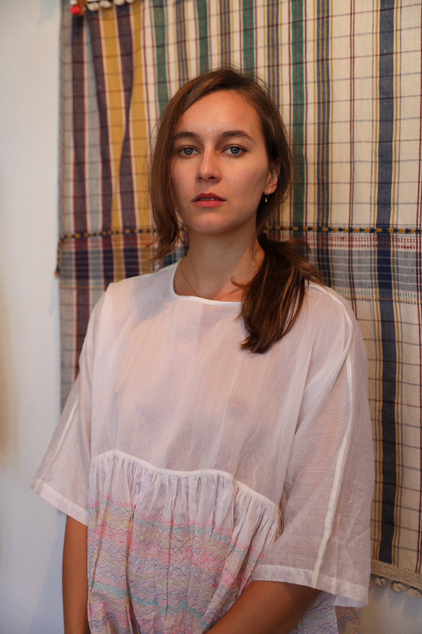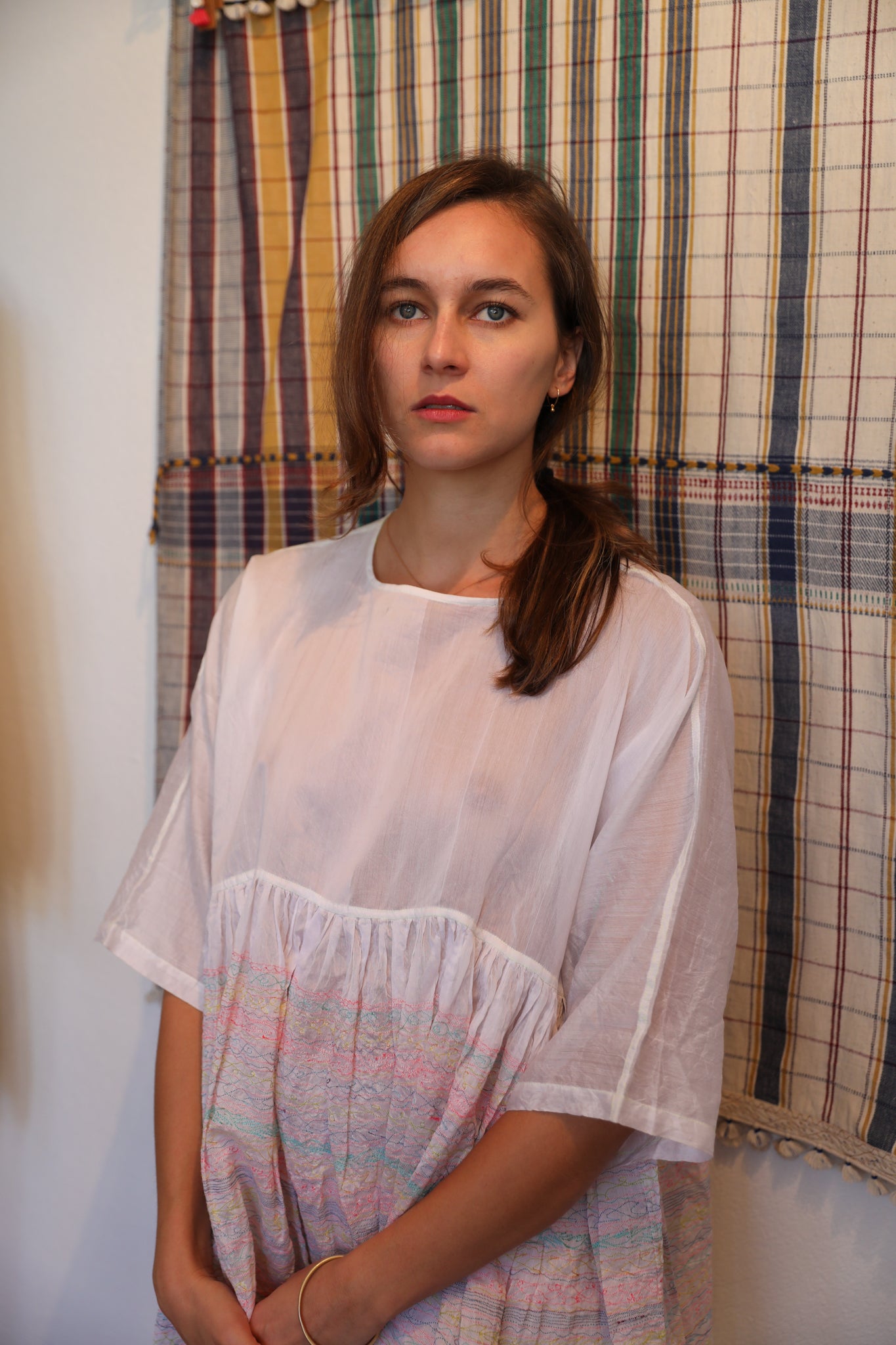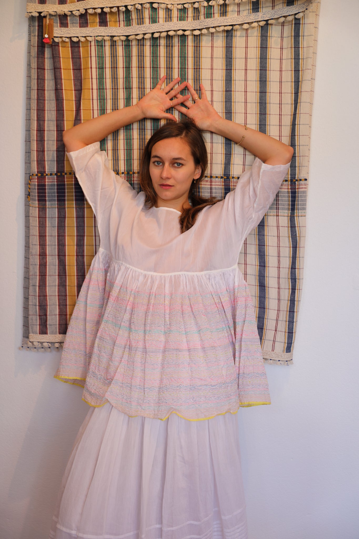A delicately handwoven 50% cotton & 50% silk mid sleeved blouse. High round neck with single side button fastening on shoulder. Features contrast highlight multicolor patterned stitch on the bottom half. Babydoll style with pleats. A sheer and delicate finish.