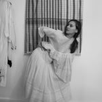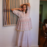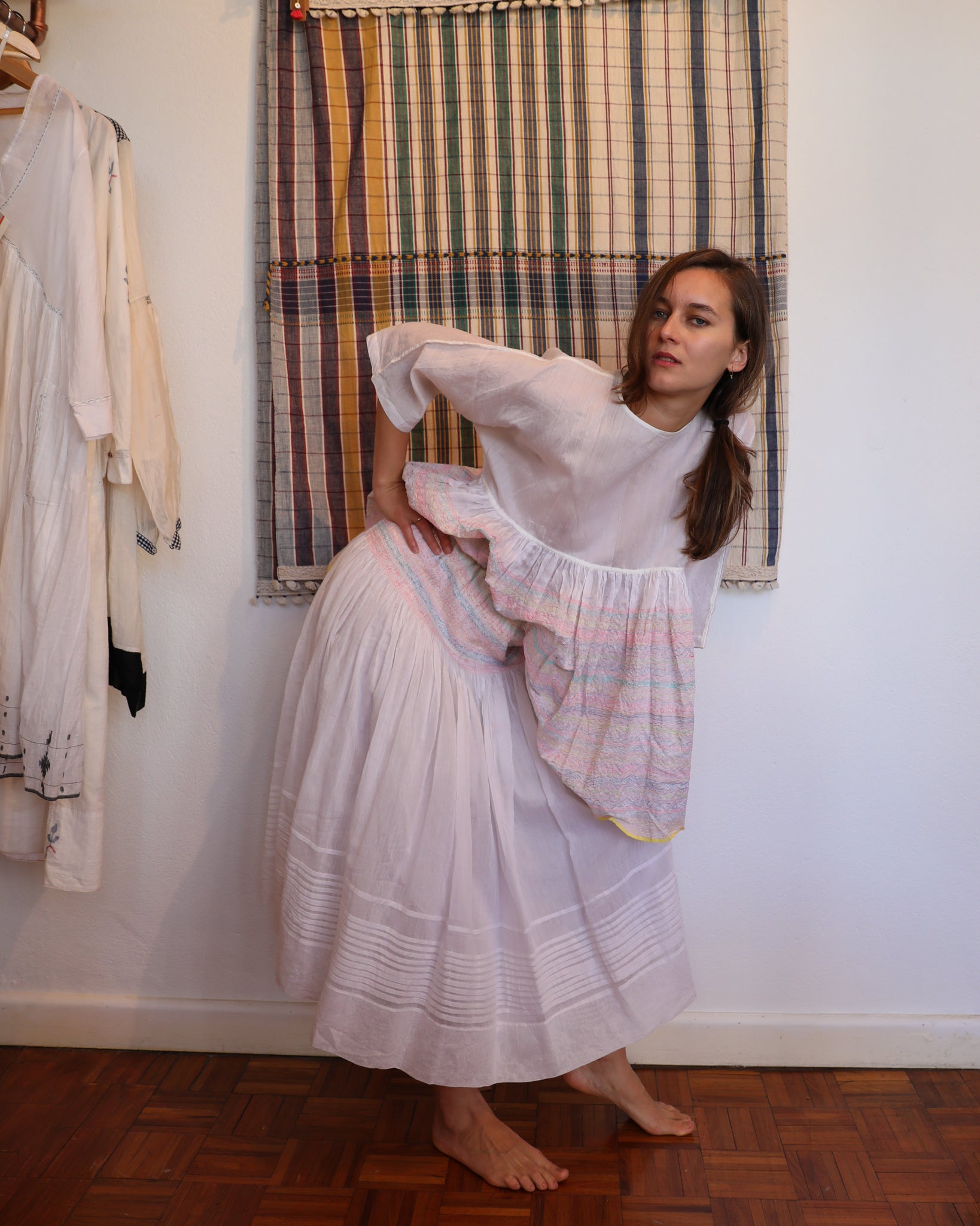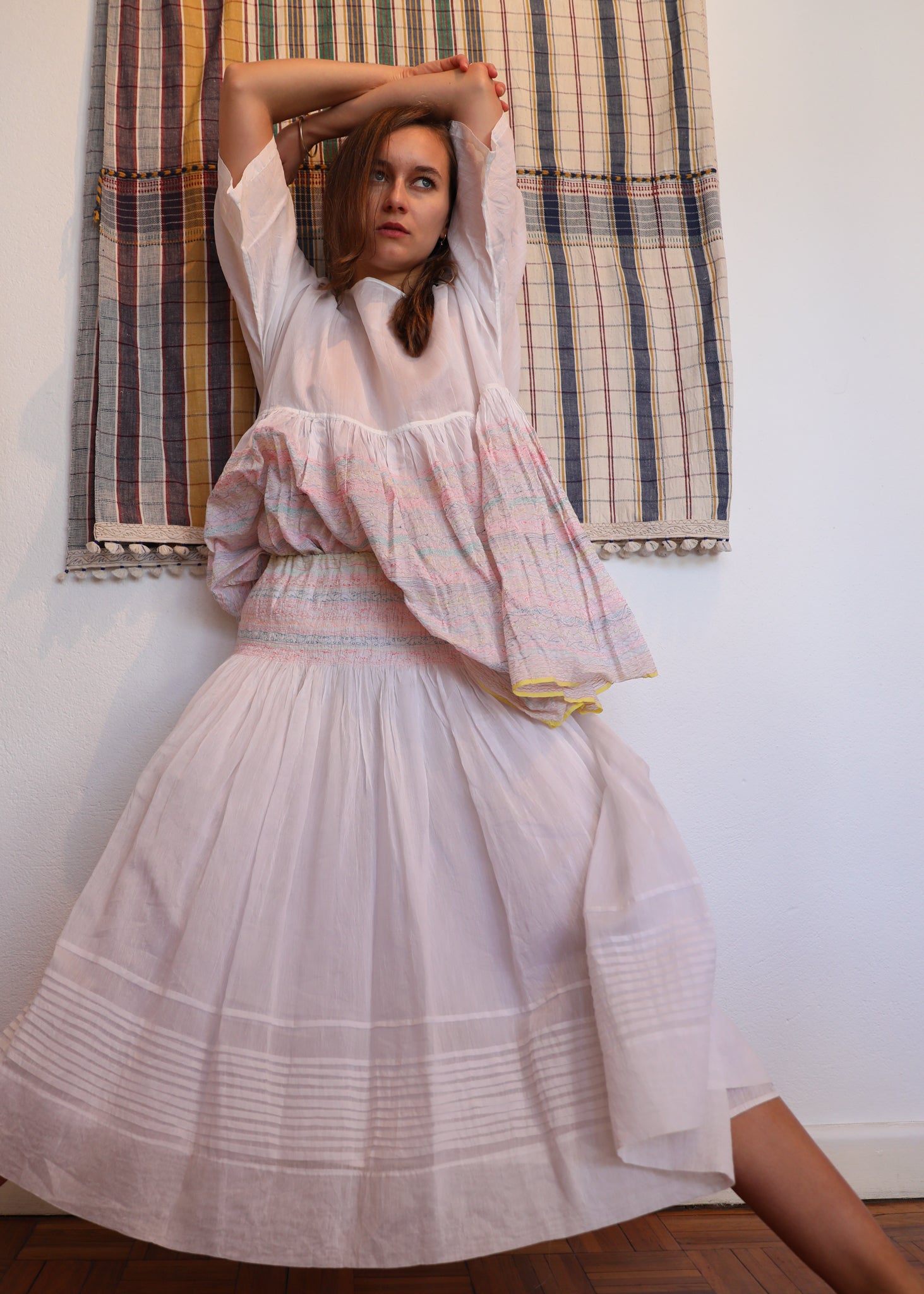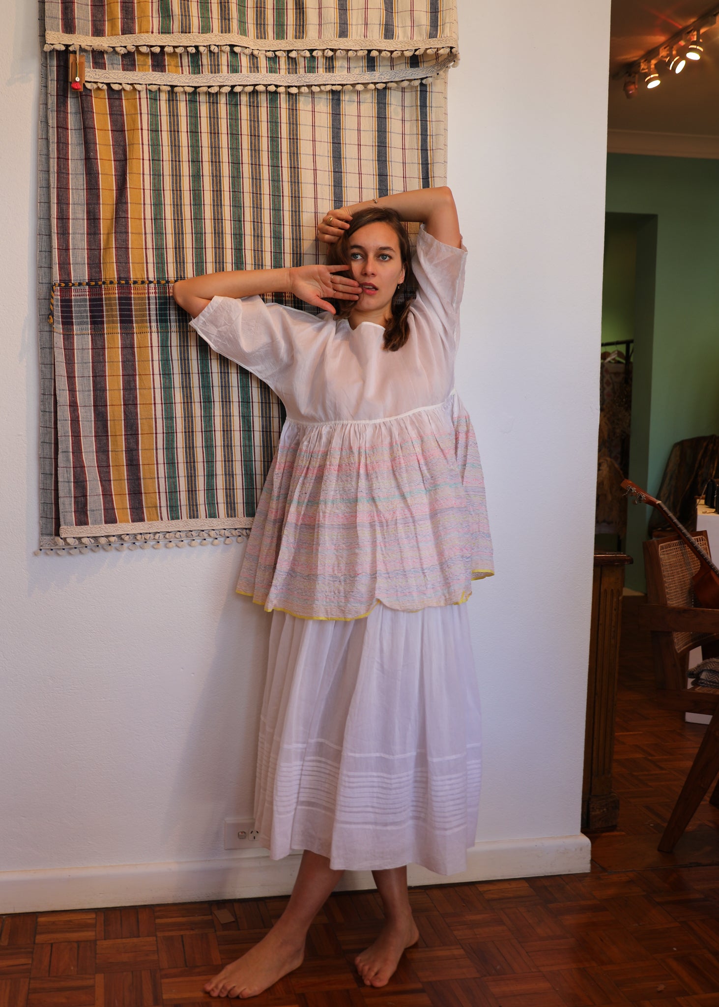 A delicately handwoven 50% cotton & 50% silk mid sleeved blouse. High round neck with single side button fastening on shoulder. Features contrast highlight multicolor patterned stitch on the bottom half. Babydoll style with pleats. A sheer and delicate finish.