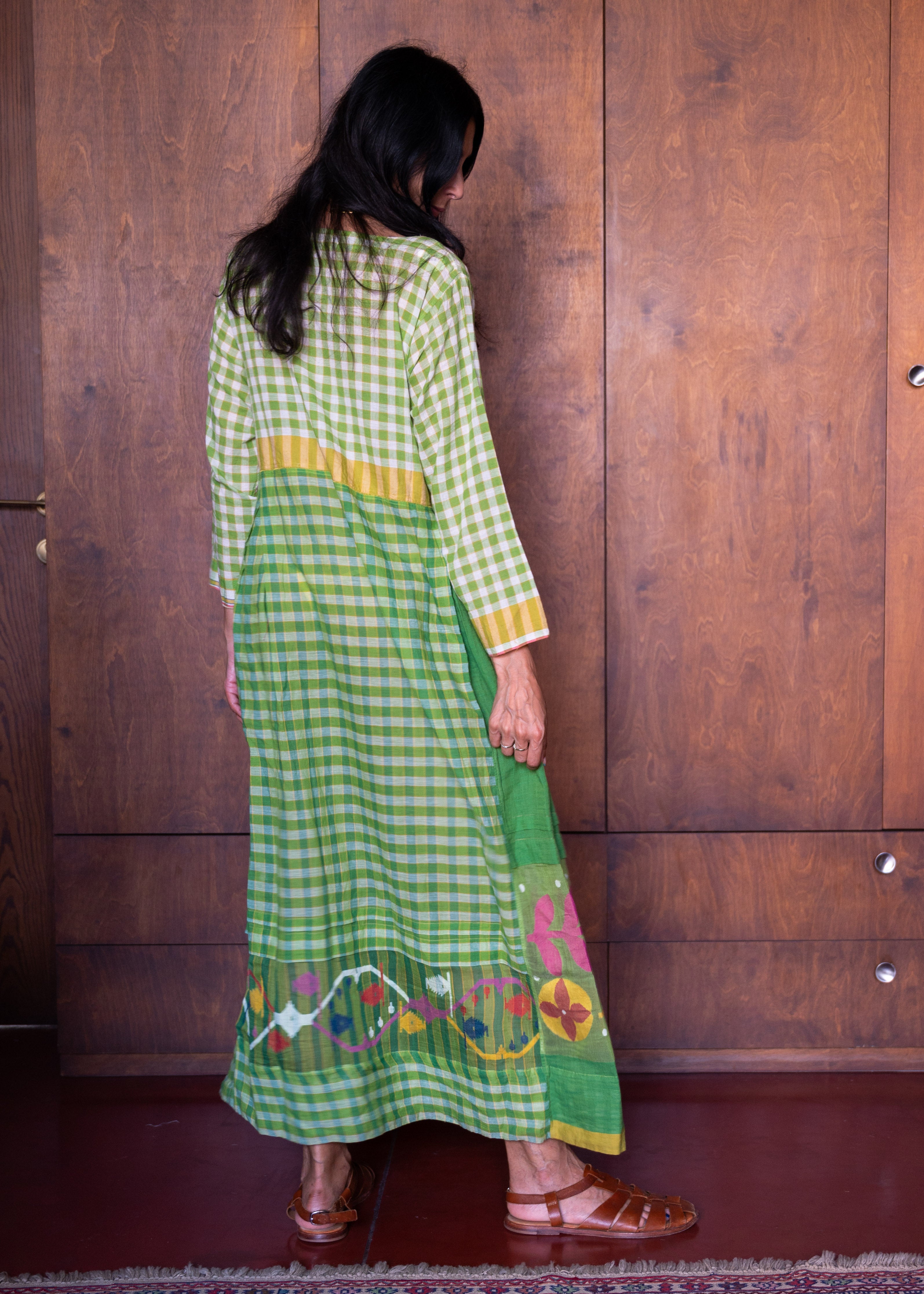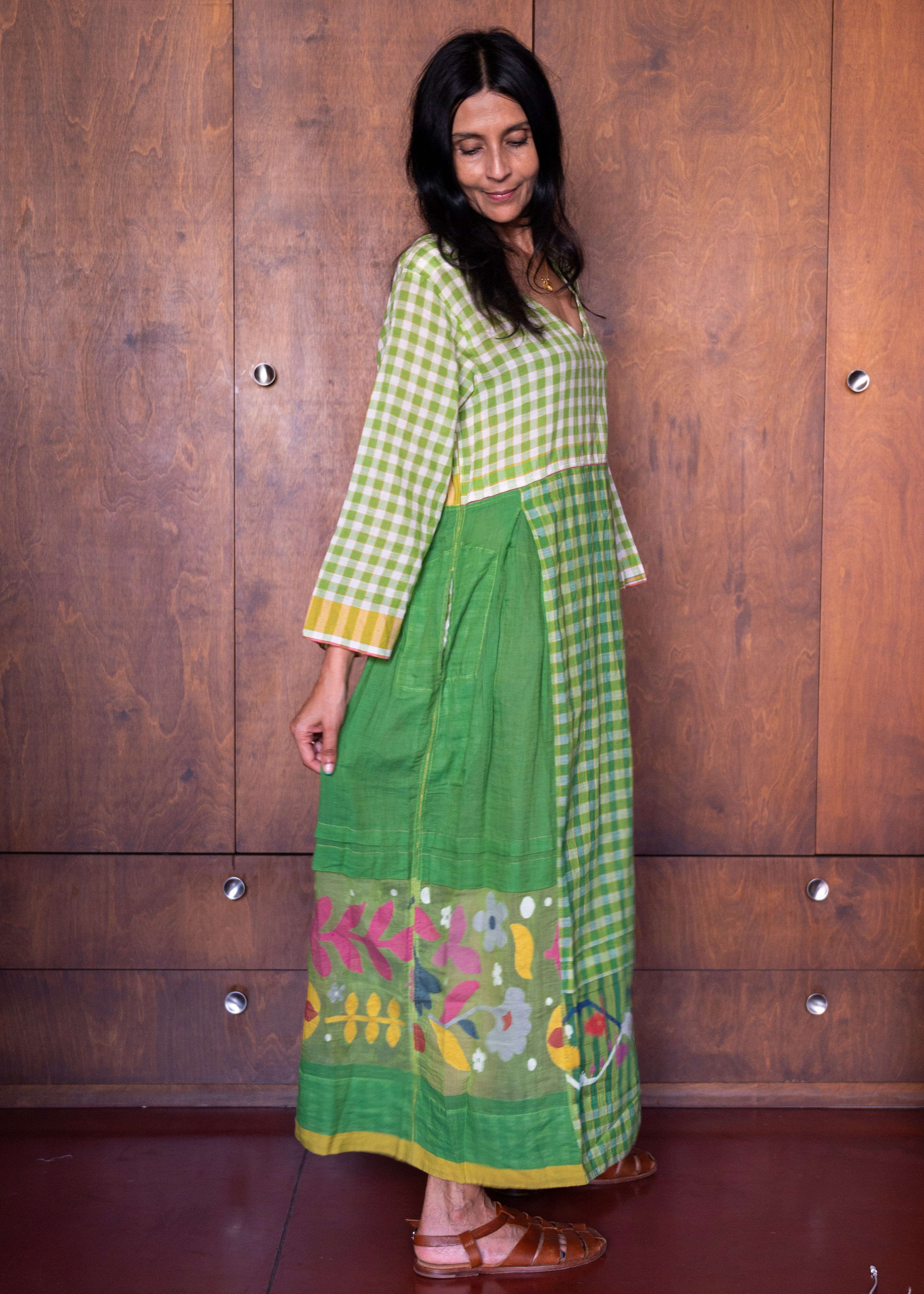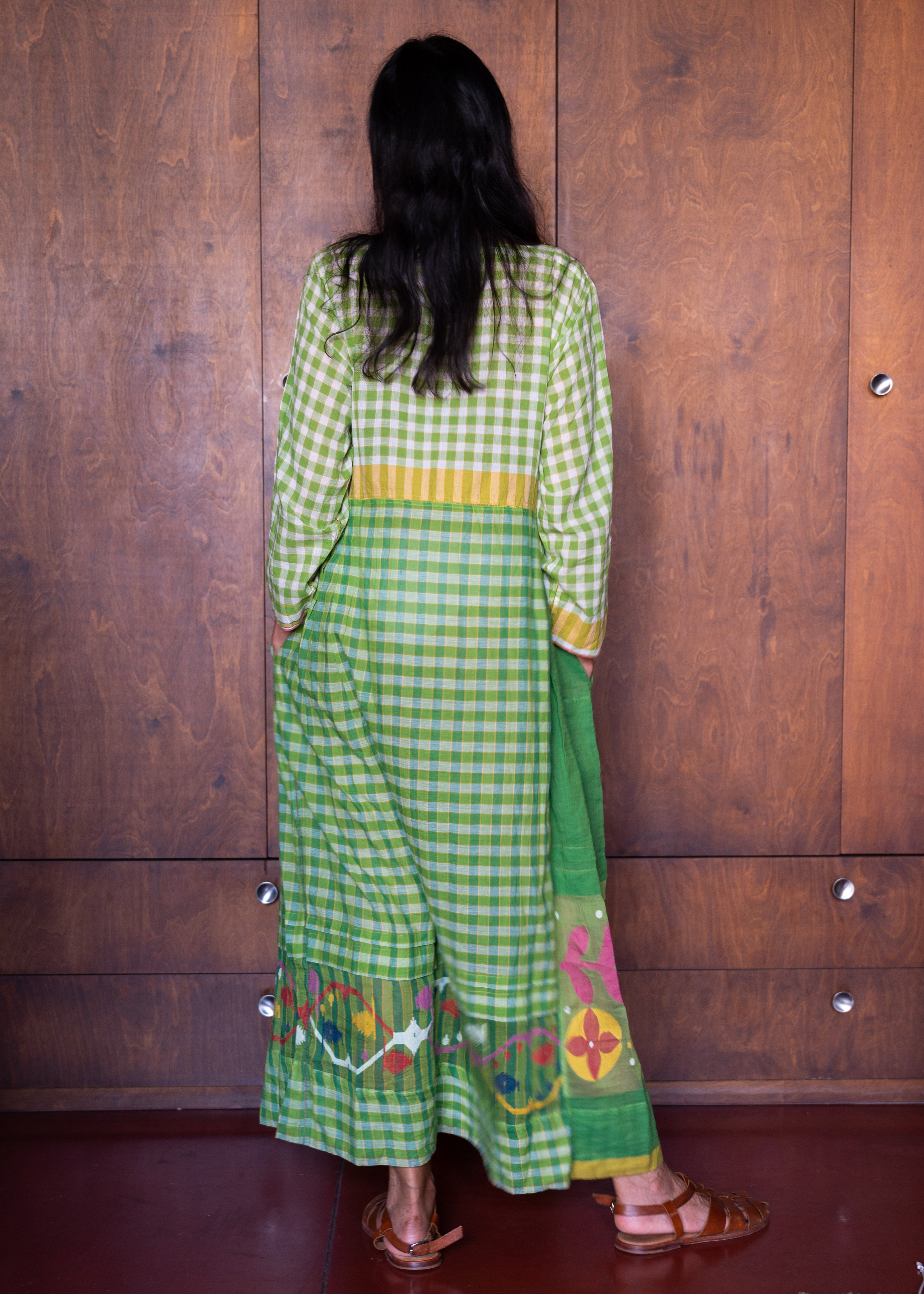 A maxi length, full sleeved dress handloom in 100% cotton. Intricately pieced together with multiple panels of varying shades in green gingham, geometric and floral jamdani panels. Features a deep V neck and side pleats. Contrast yellow stripe through front waist, sleeves and hemline. Side slit pockets. A light and sheer finish.