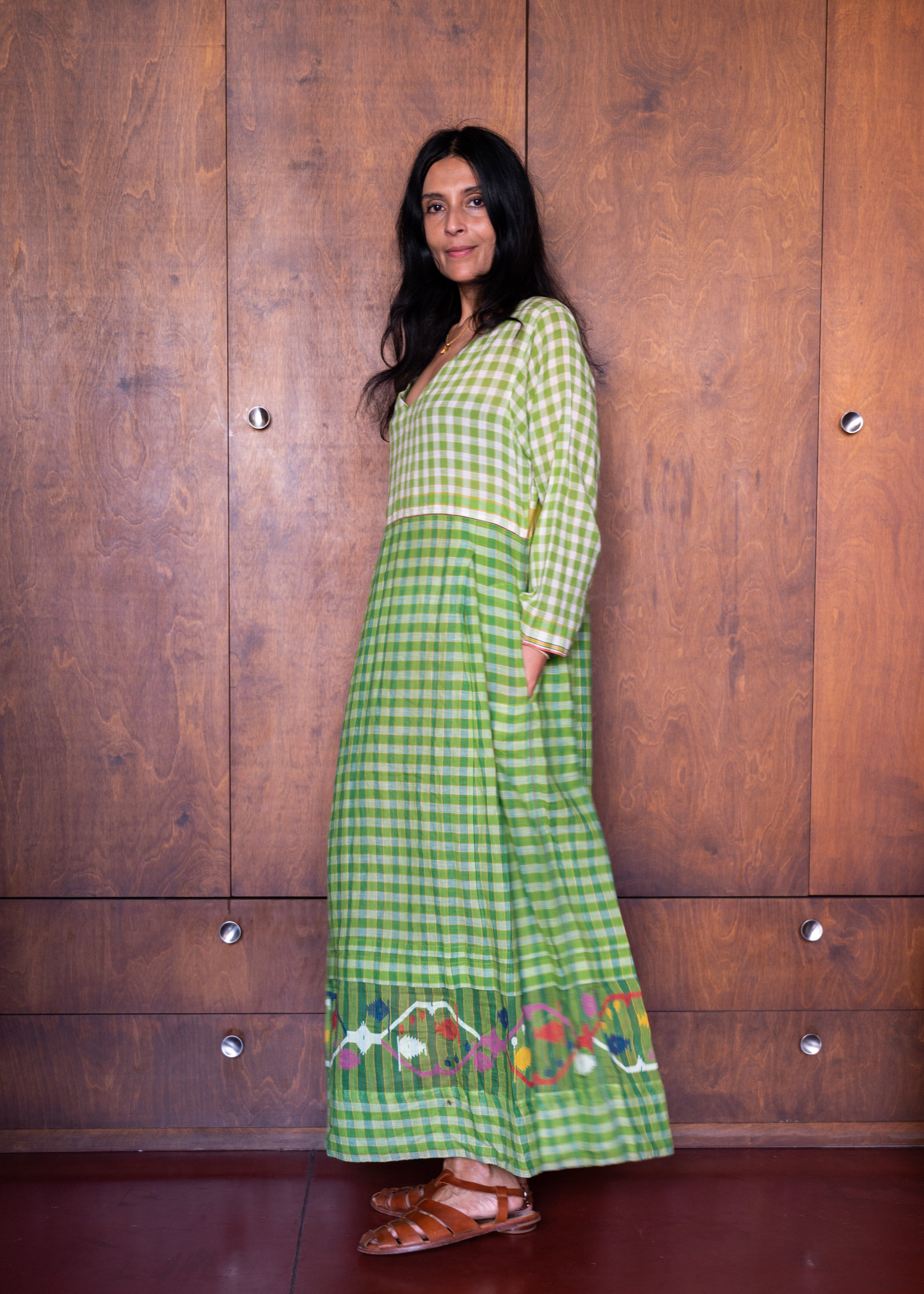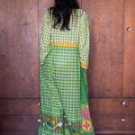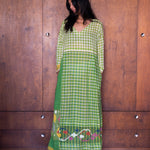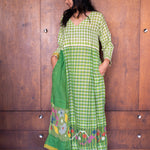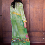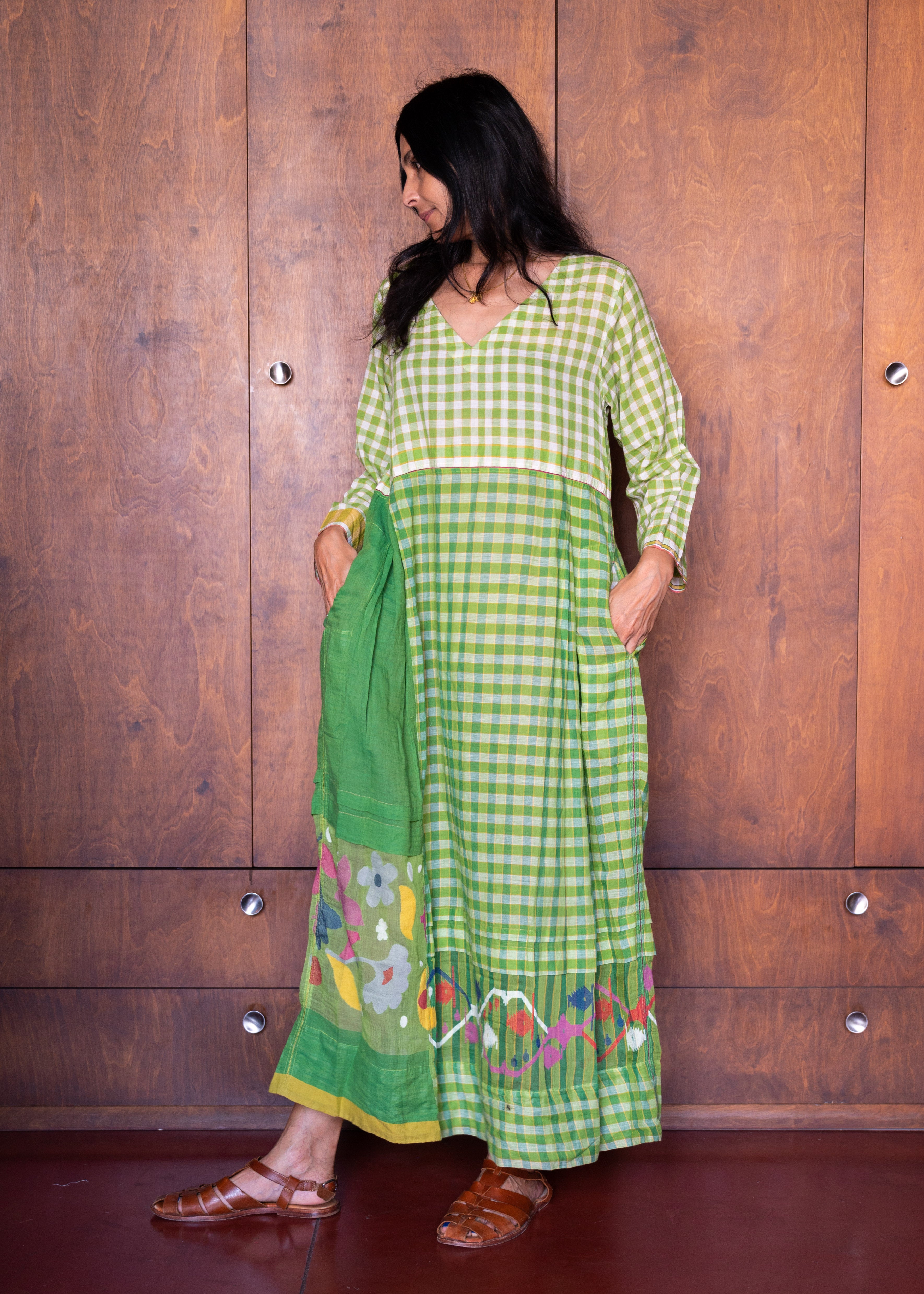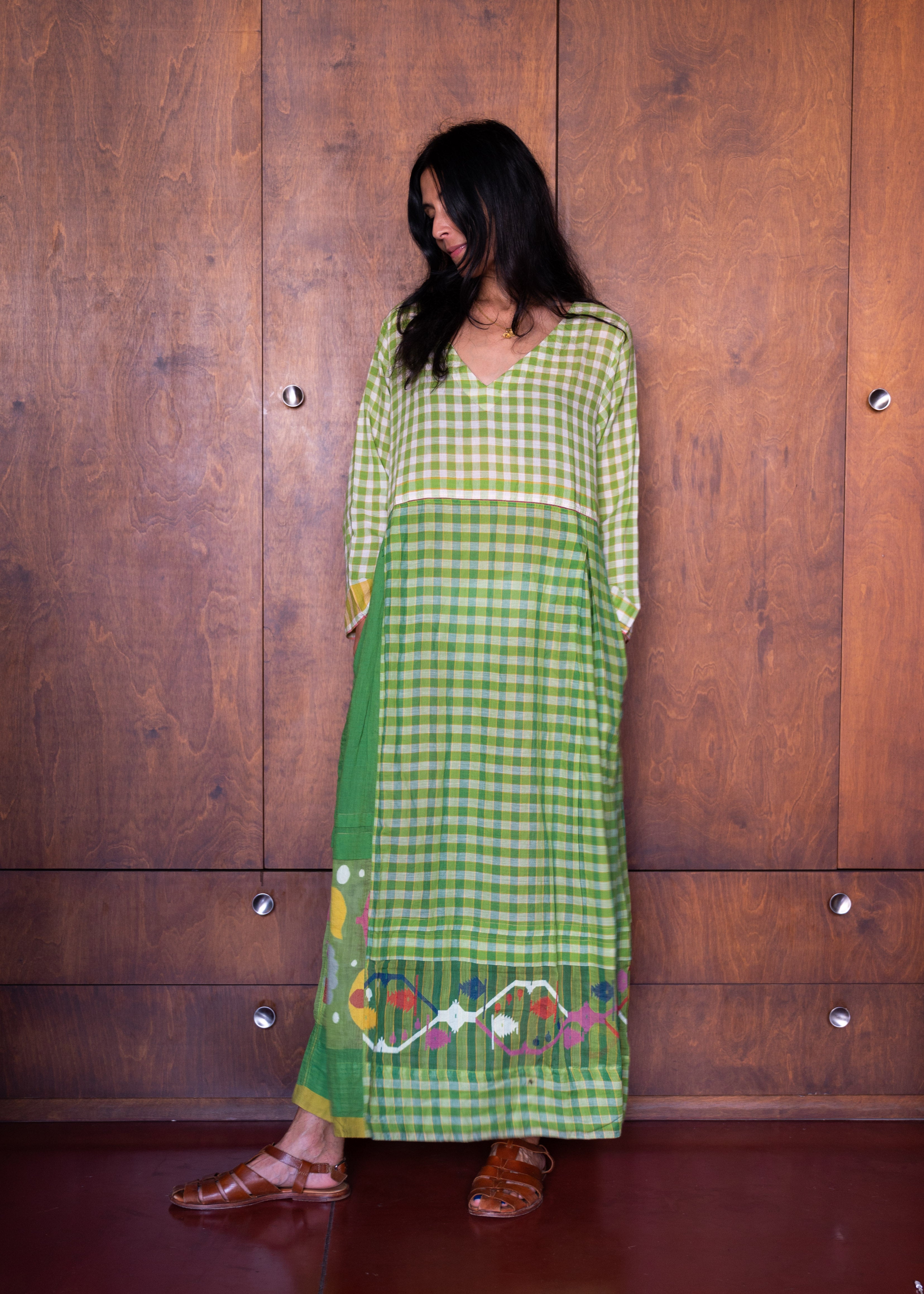 A maxi length, full sleeved dress handloom in 100% cotton. Intricately pieced together with multiple panels of varying shades in green gingham, geometric and floral jamdani panels. Features a deep V neck and side pleats. Contrast yellow stripe through front waist, sleeves and hemline. Side slit pockets. A light and sheer finish.