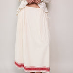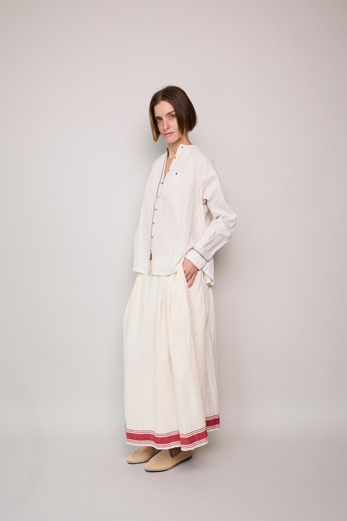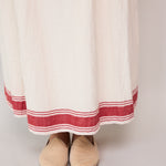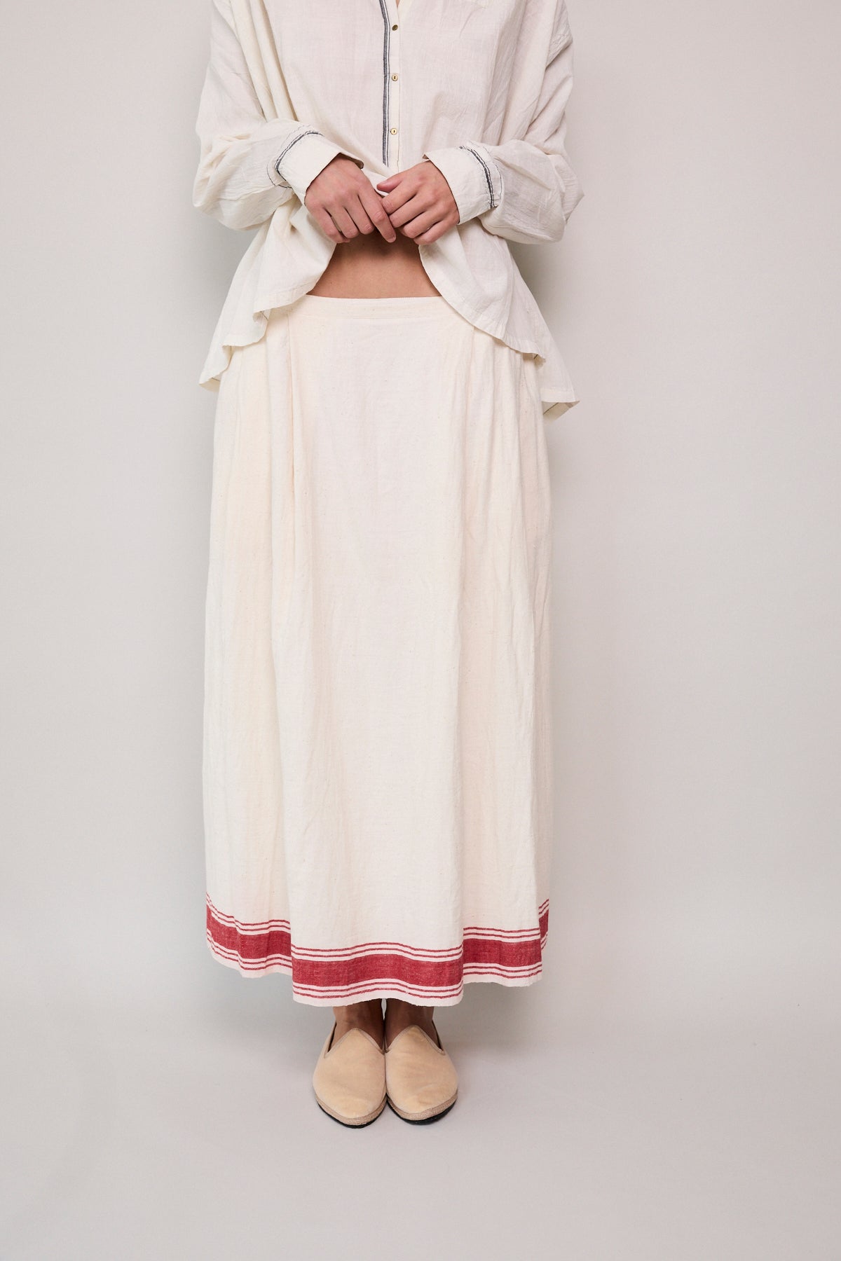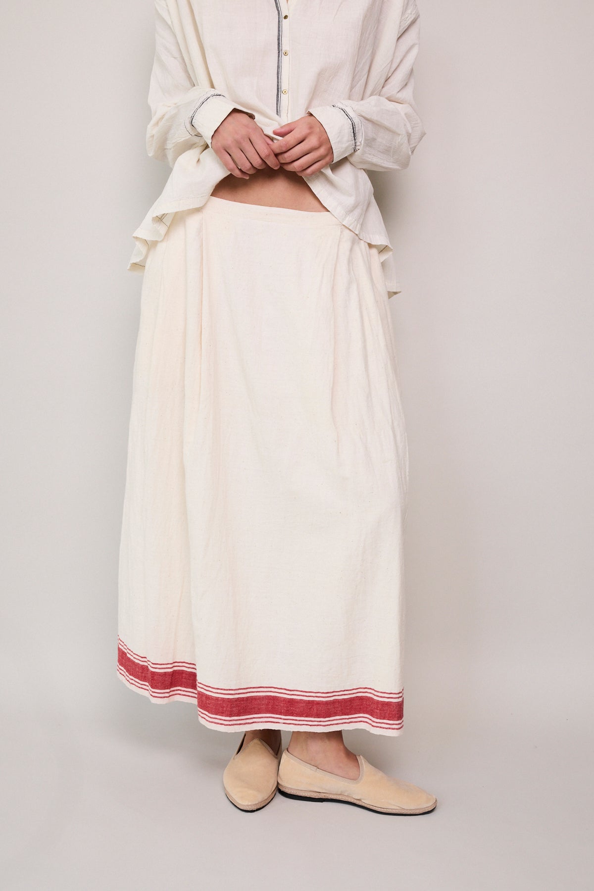 A full pleated skirt  in 100% handwoven heavy kadhi cotton. Front band and back elastic. Front box pleat detail. Side pockets. Fully lined in light cotton. Maxi length.