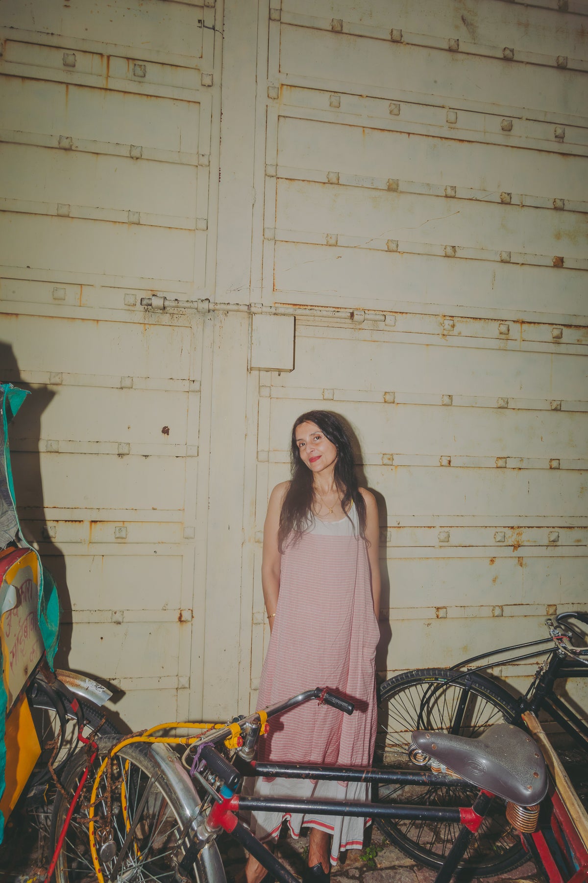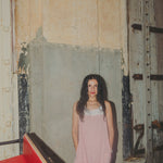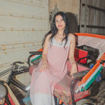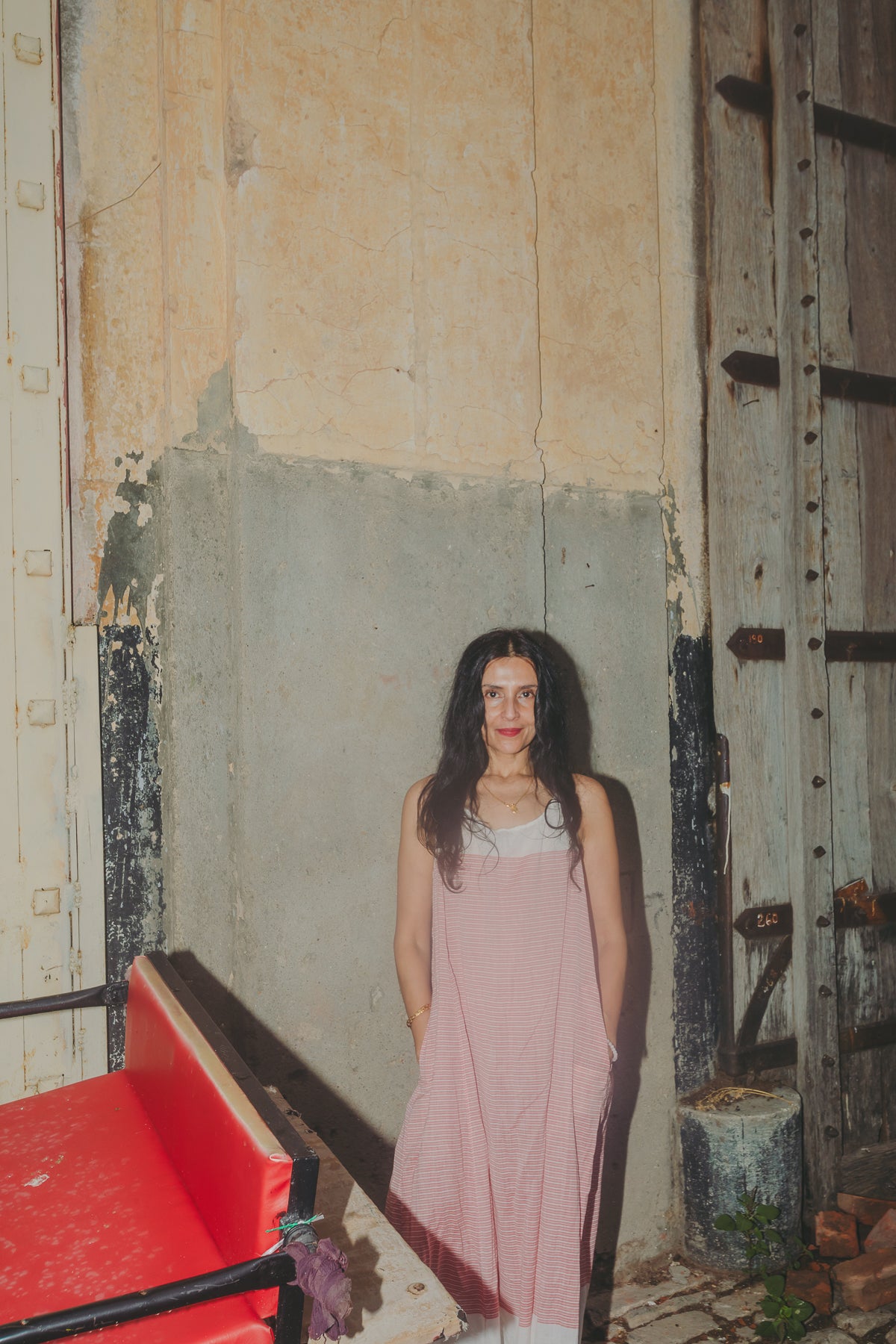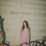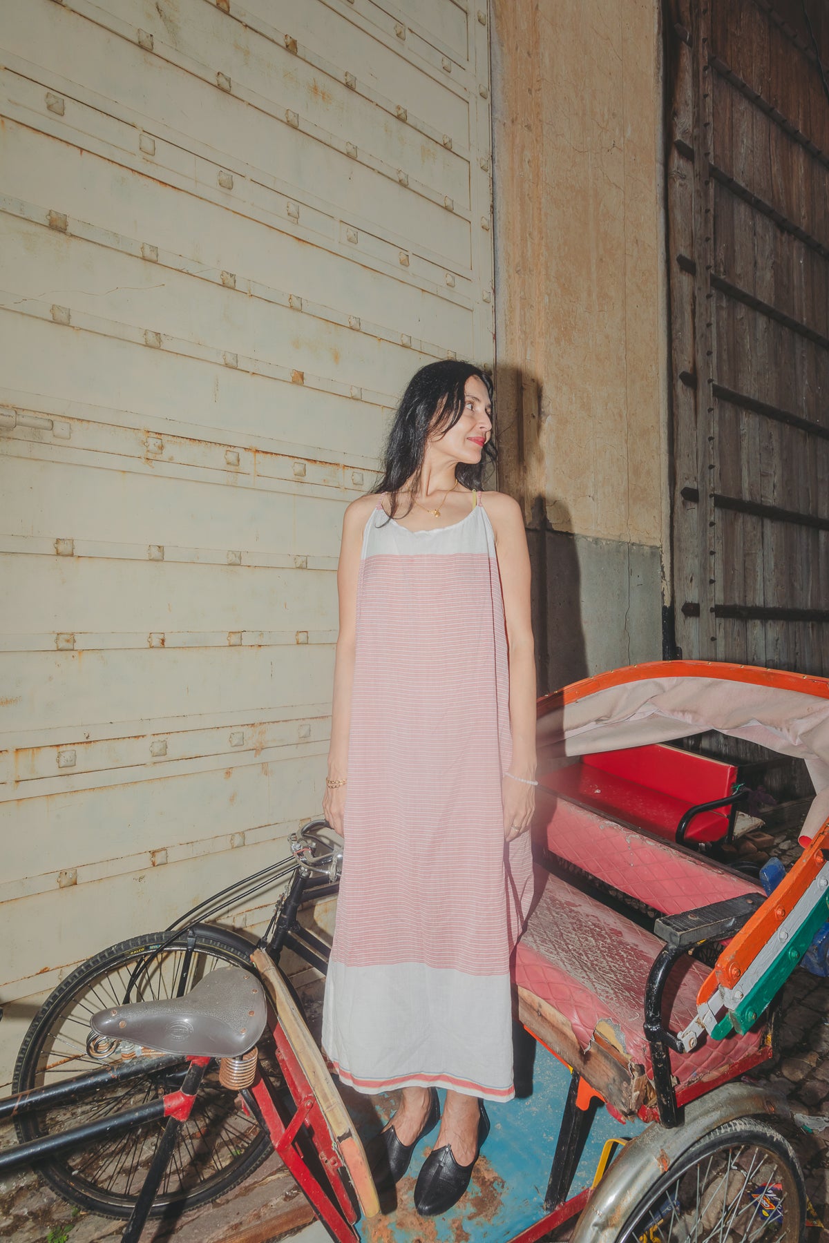 A slip dress. A-line. Features a front U neck and straight back, with thin adjustable strap detail. Handwoven red and white stripes through the slip with selvedge along hem and back panel. Maxi length.