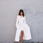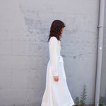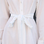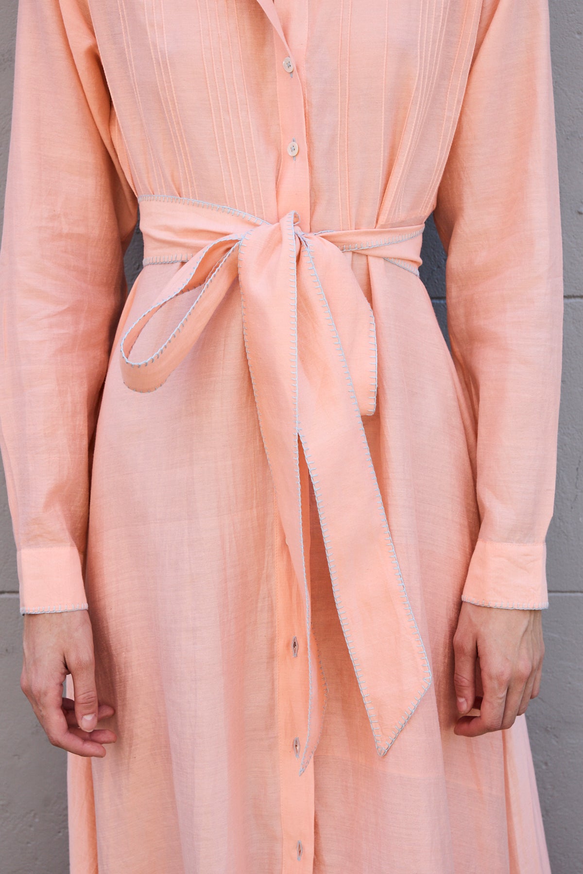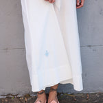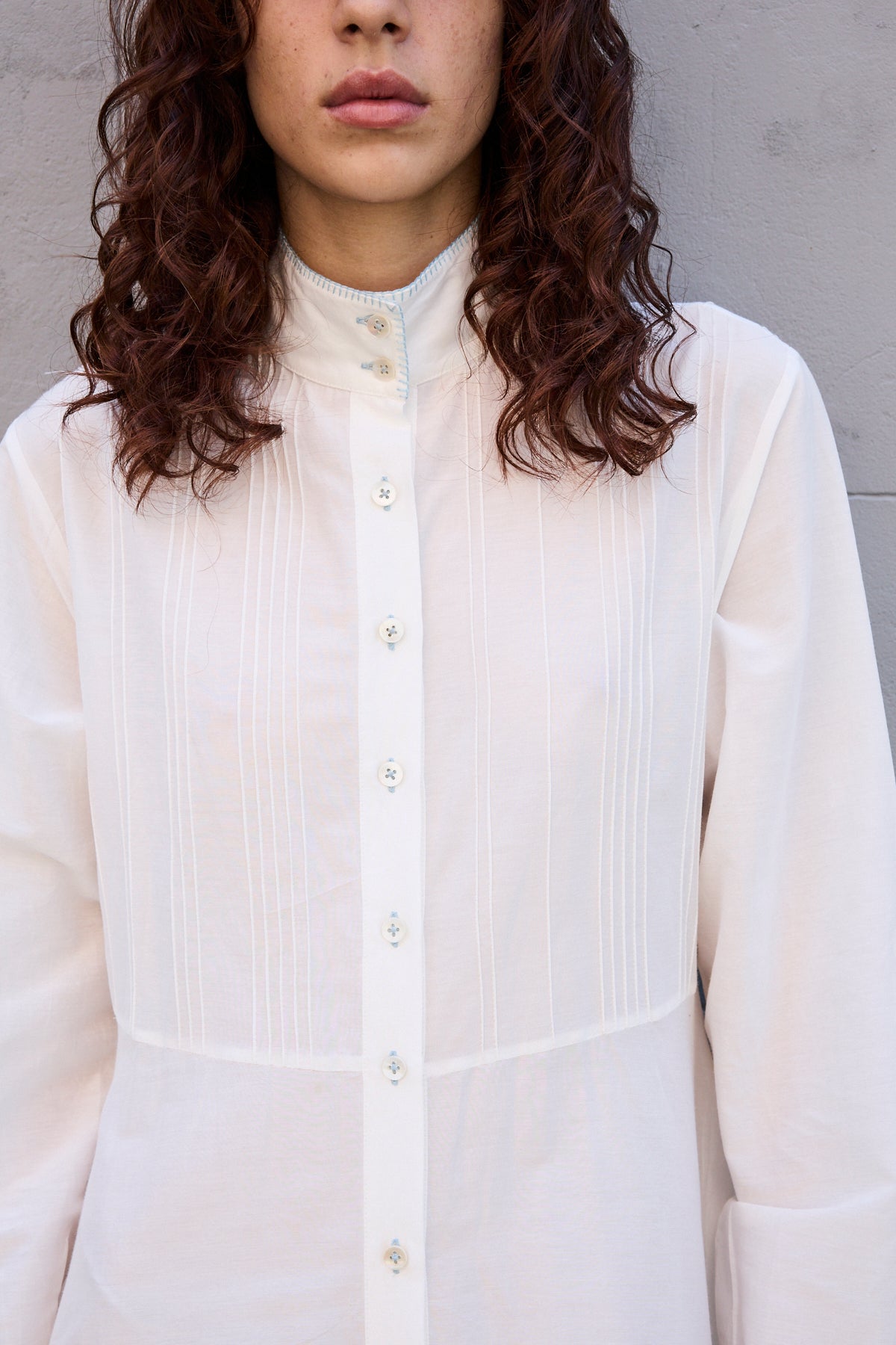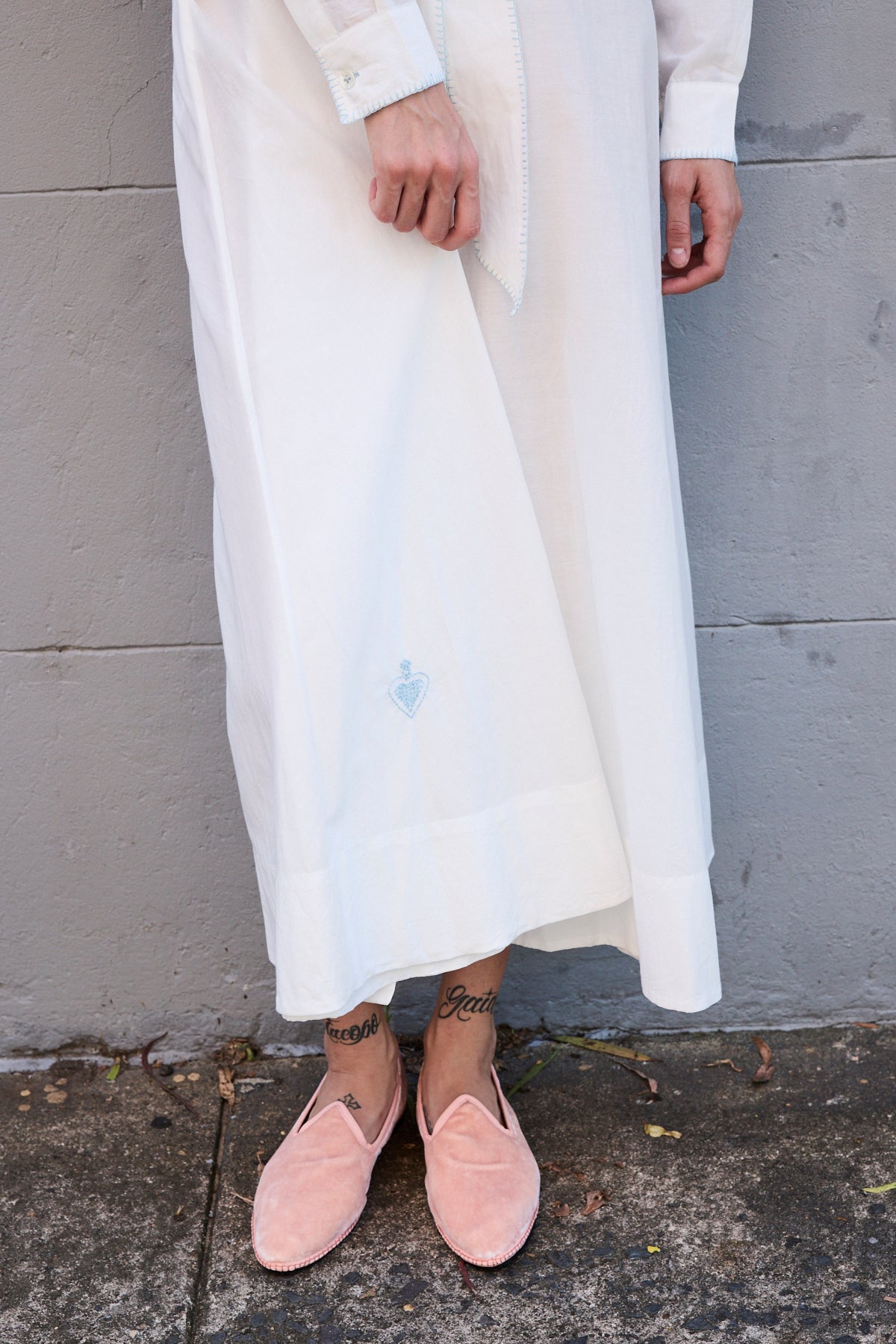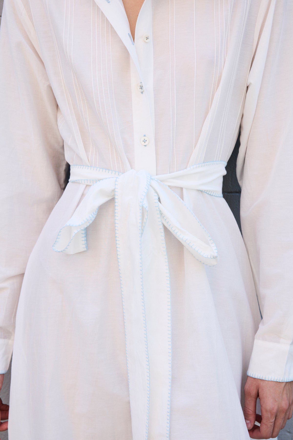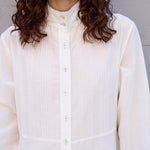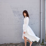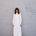 A classic button down shirt dress with high neck and long sleeves. Hand pintuck detail along front and back of bodice. A concealed button down front with front placket. A full panelled skirt with our signature heart embroidery detail. Contrast blue blanket stitch along neck and cuffs. Cuffs with single button closure. Side pockets.