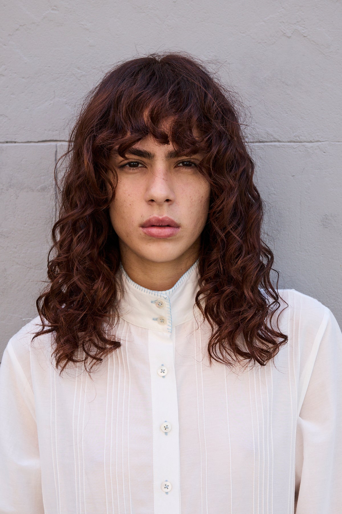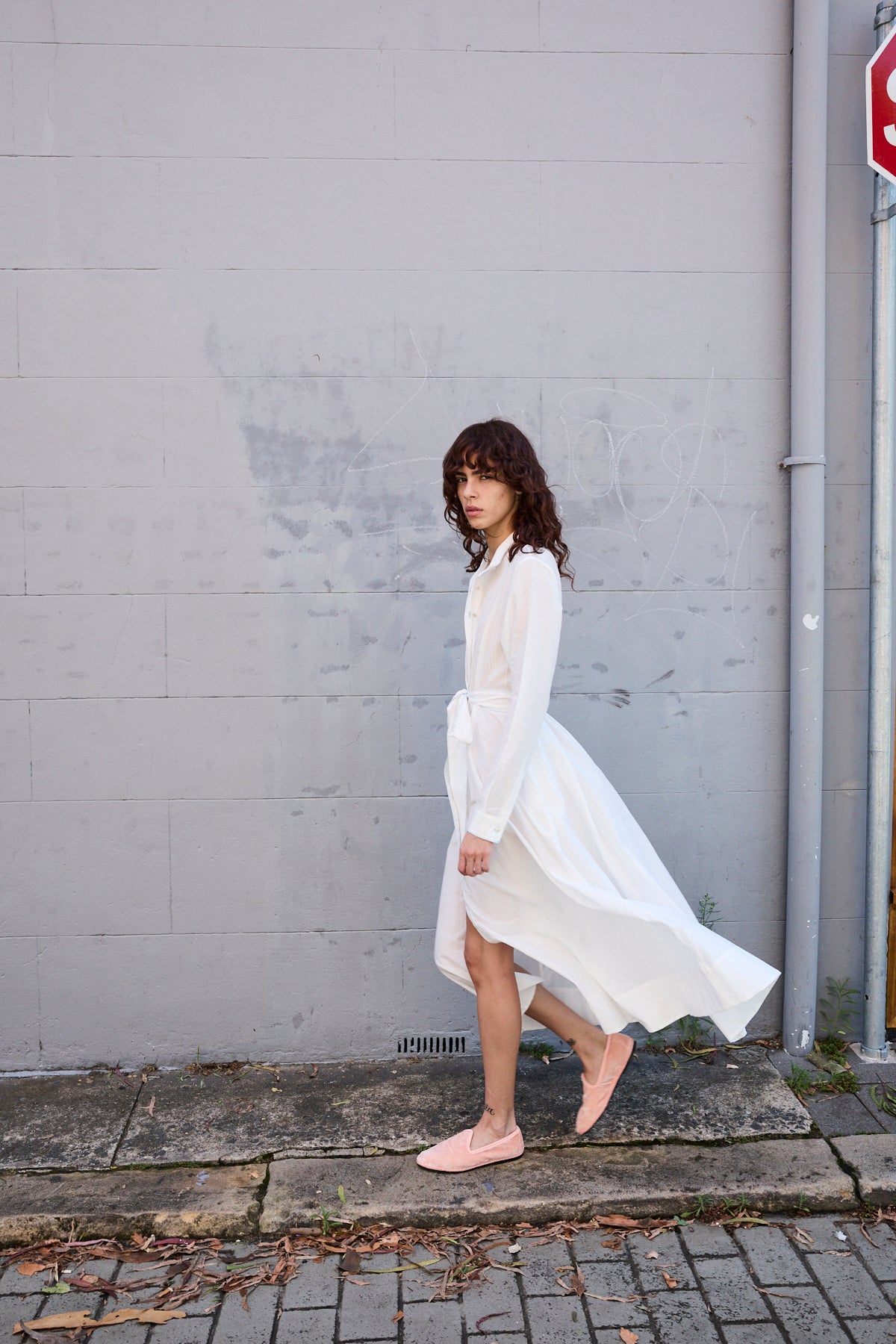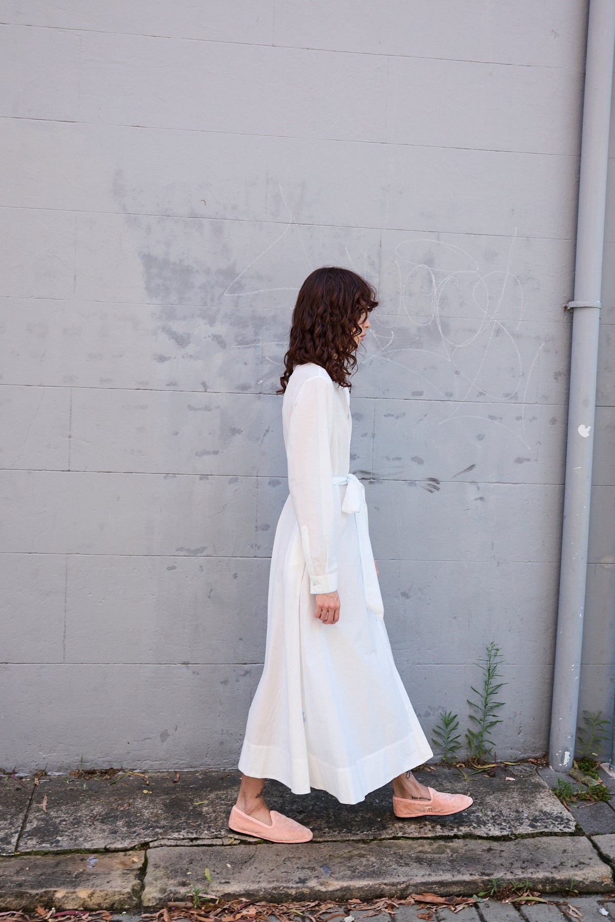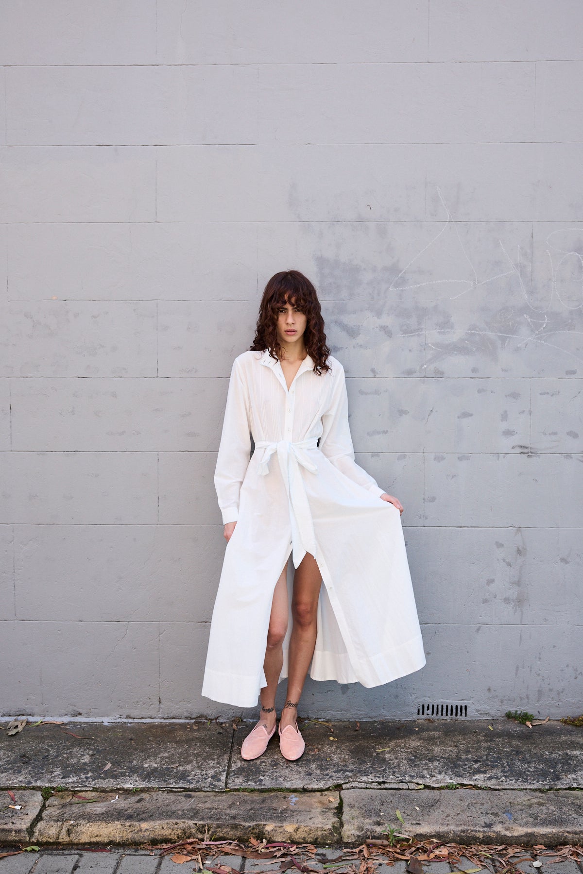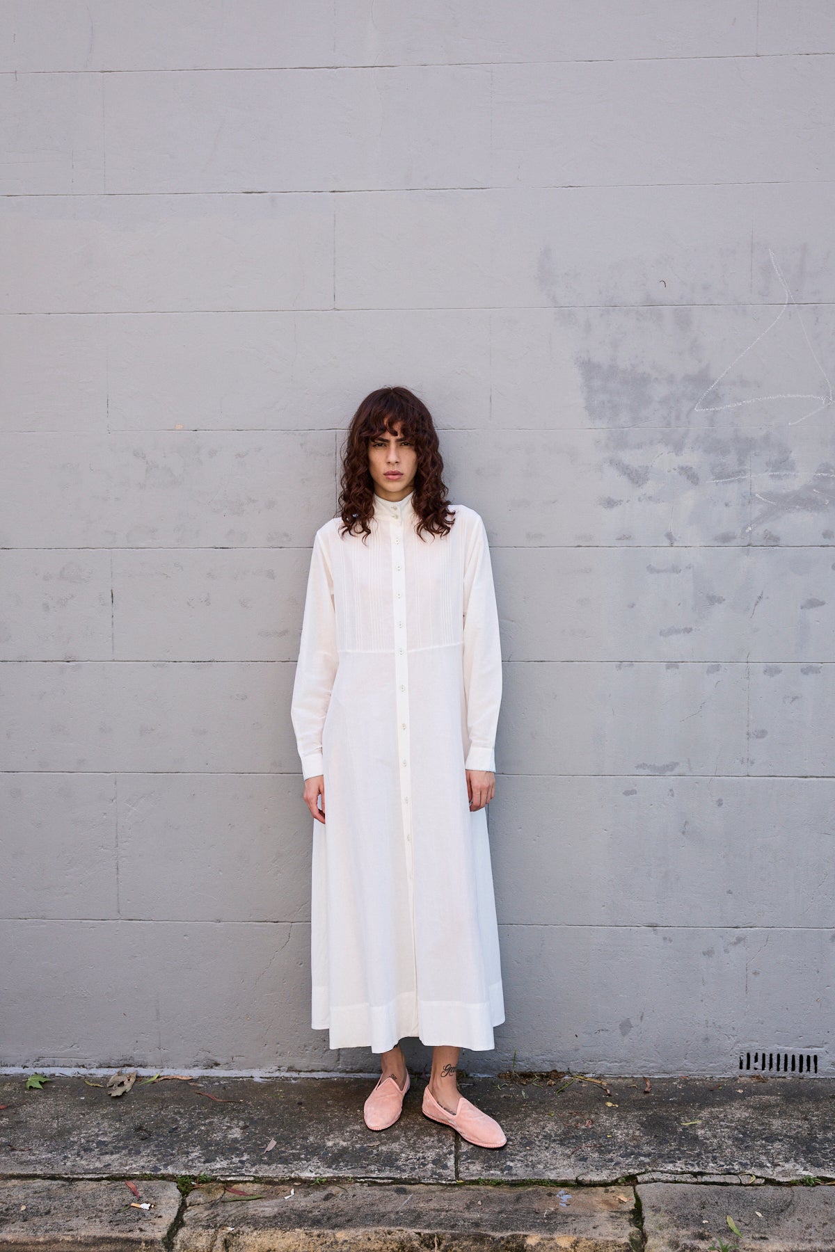 A classic button down shirt dress with high neck and long sleeves. Hand pintuck detail along front and back of bodice. A concealed button down front with front placket. A full panelled skirt with our signature heart embroidery detail. Contrast blue blanket stitch along neck and cuffs. Cuffs with single button closure. Side pockets.