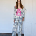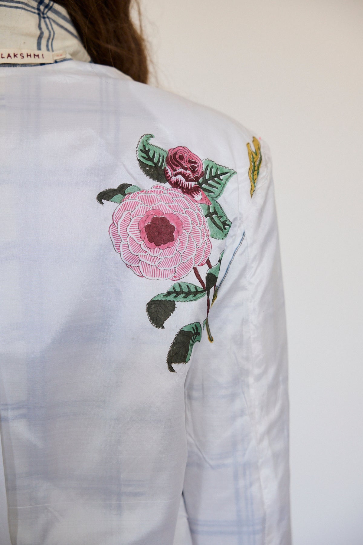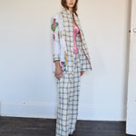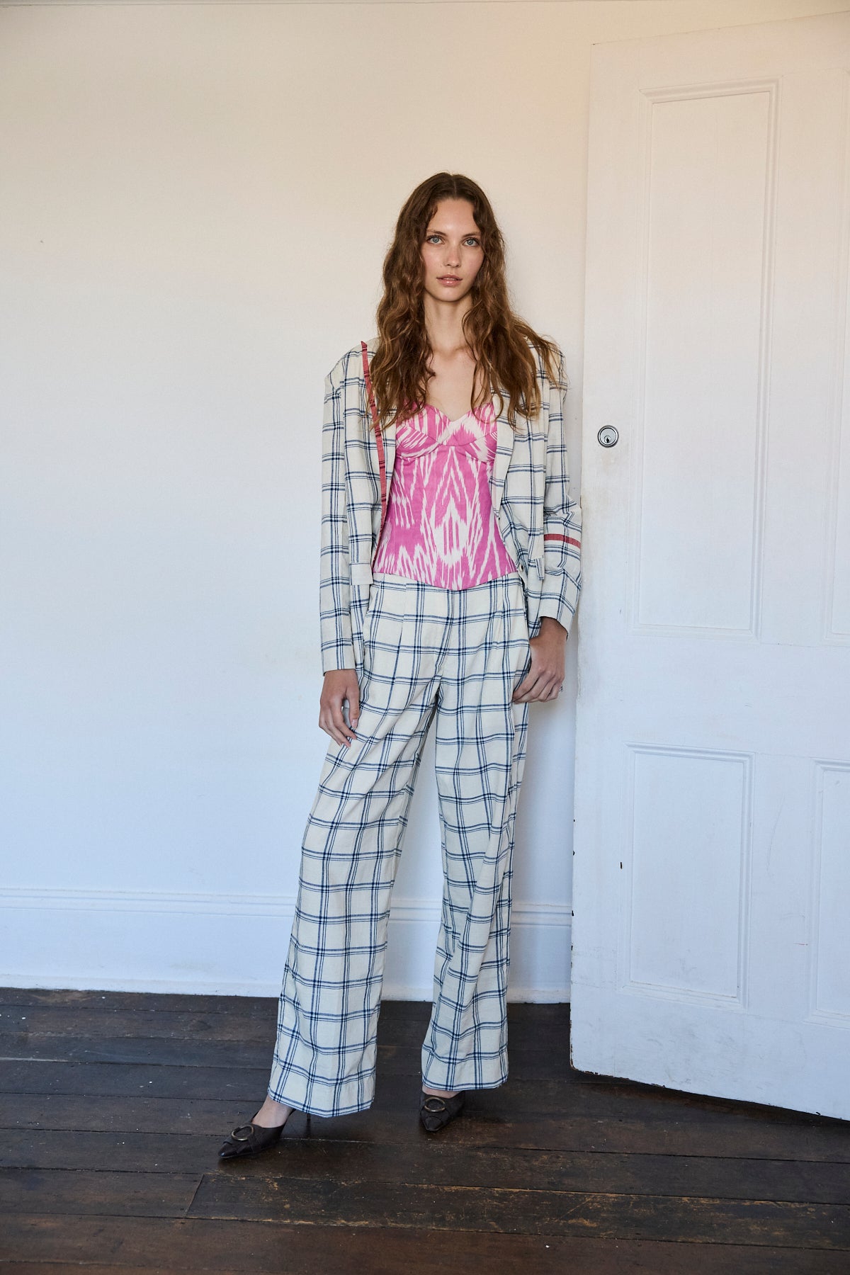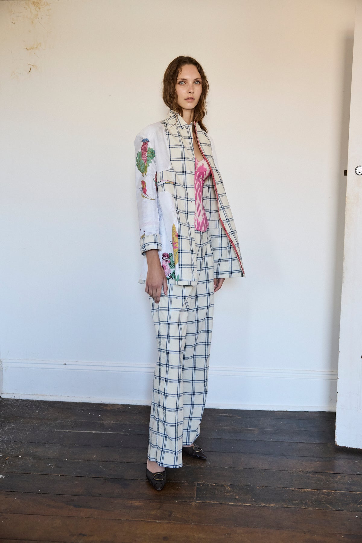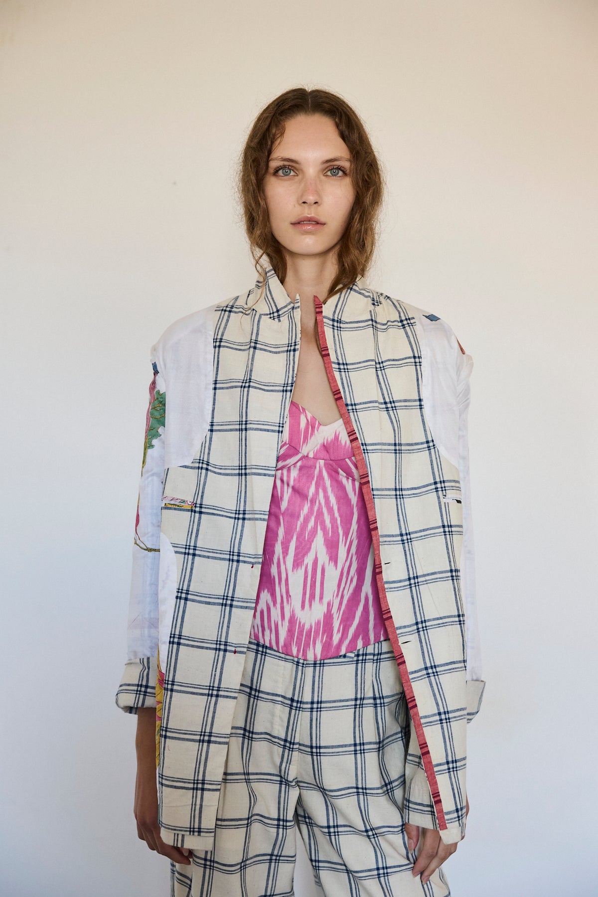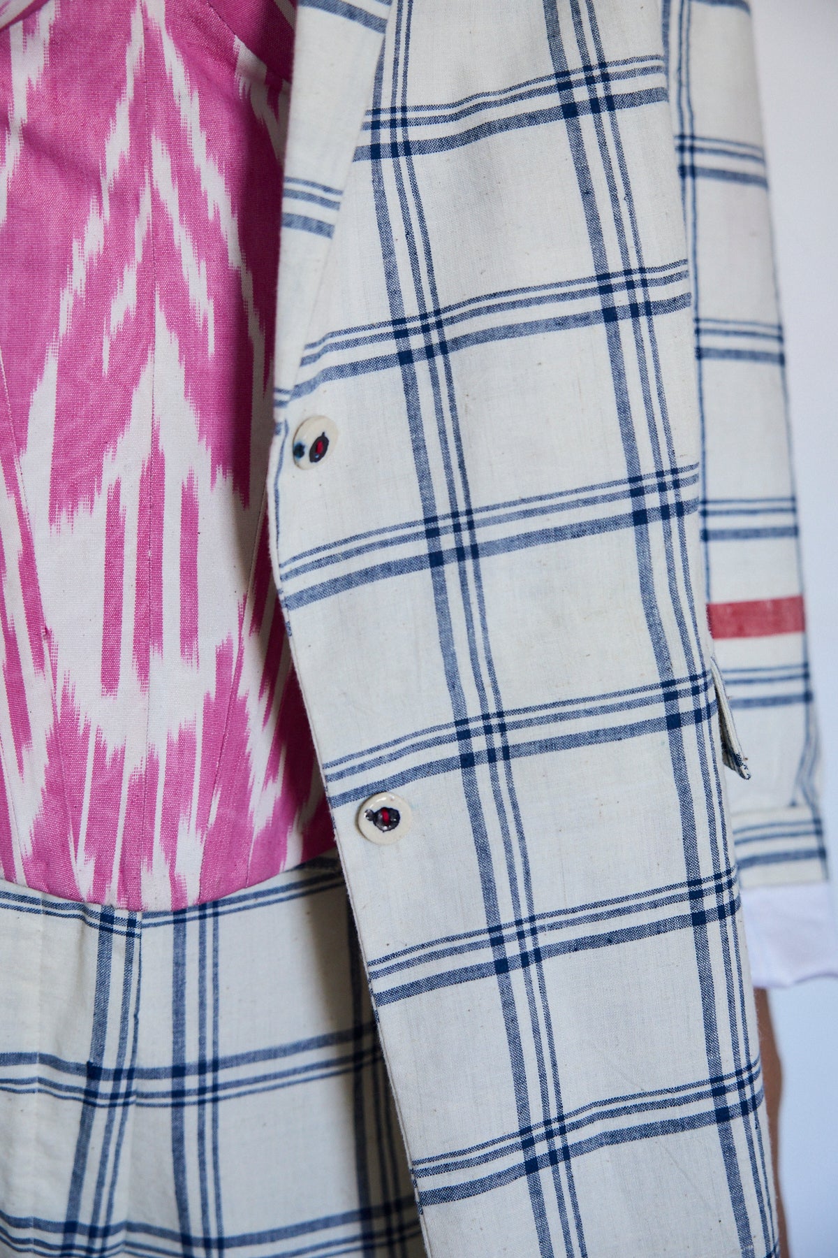 A single breasted blazer featuring handwoven indigo check detail throughout. Contrast red selvedge detail along right lapel and left arm. Front pockets with flap. Custom indigo and ivory buttons with contrast red stitch on sleeves and double front closure.