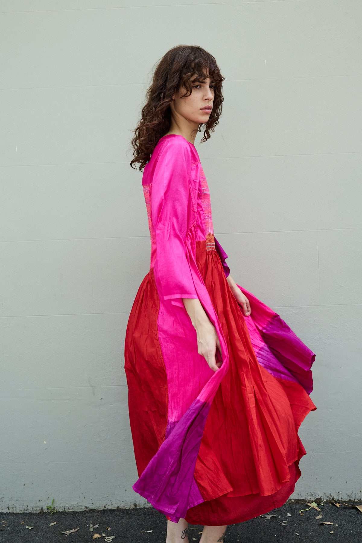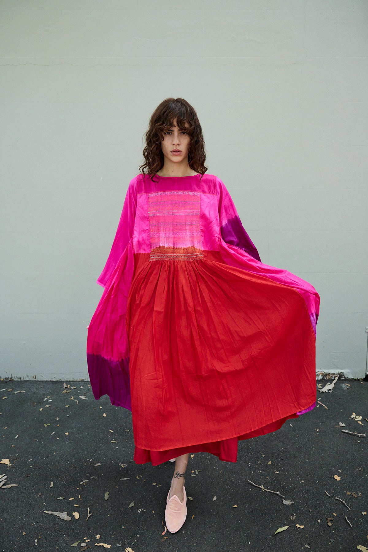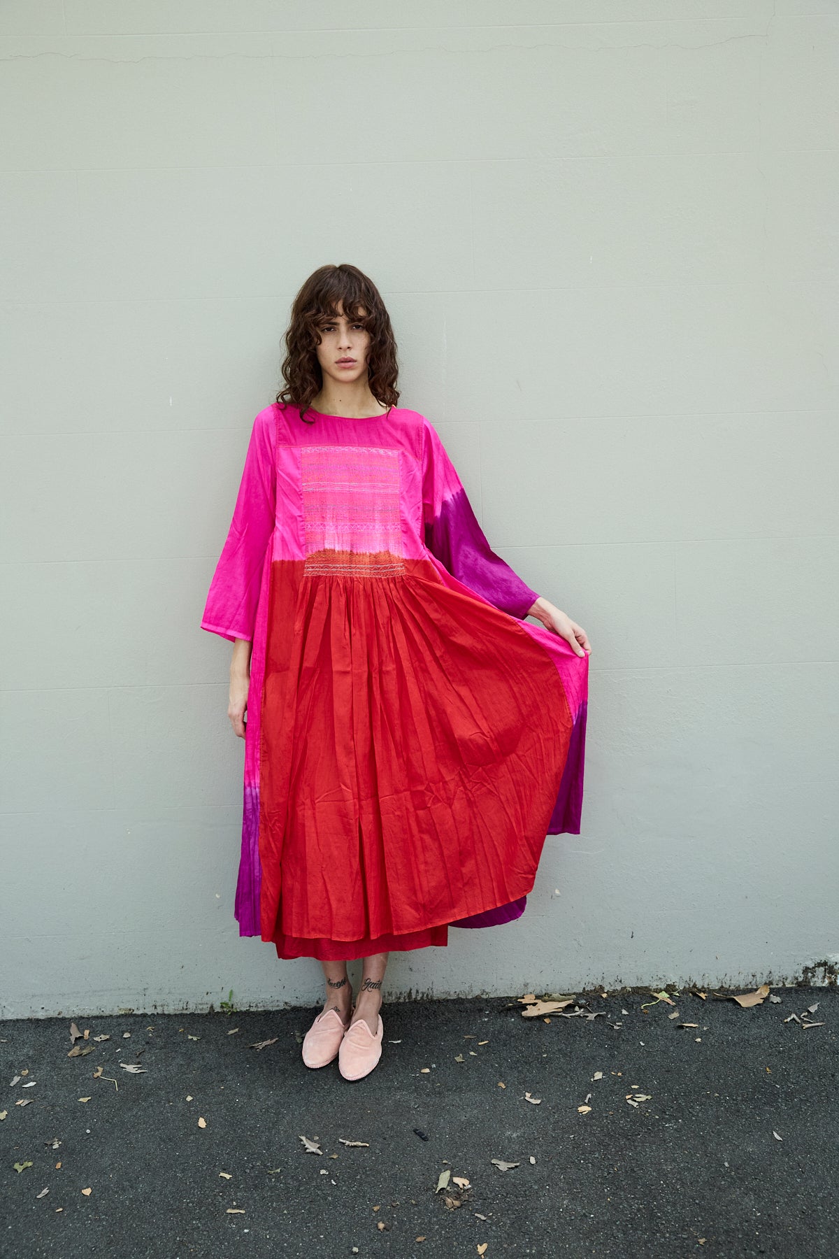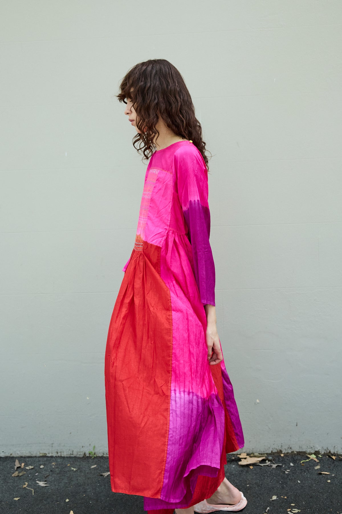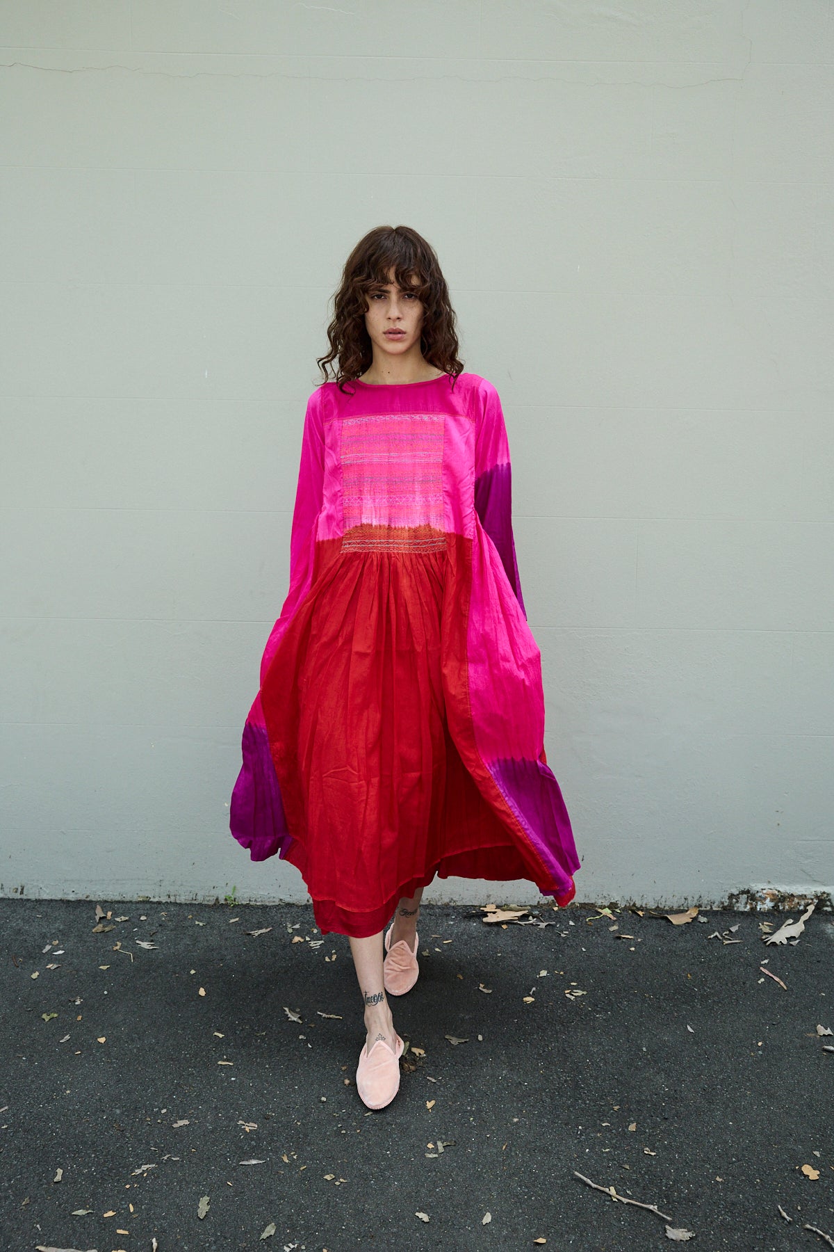 An intricately crafted dress in handwoven silk. Features a fully embroidered front and back yoke with a round neck and side button closure. Contrast single yellow crochet button detail. Contrast tie dye pattern in fuchsia, red and purple through the dress. Side slit pockets. Full sleeved. A maxi length.