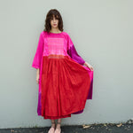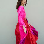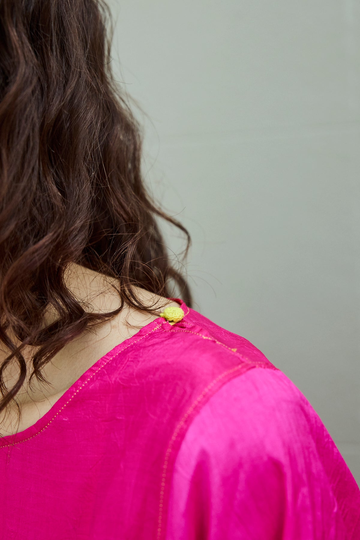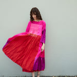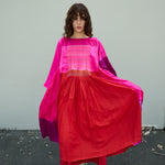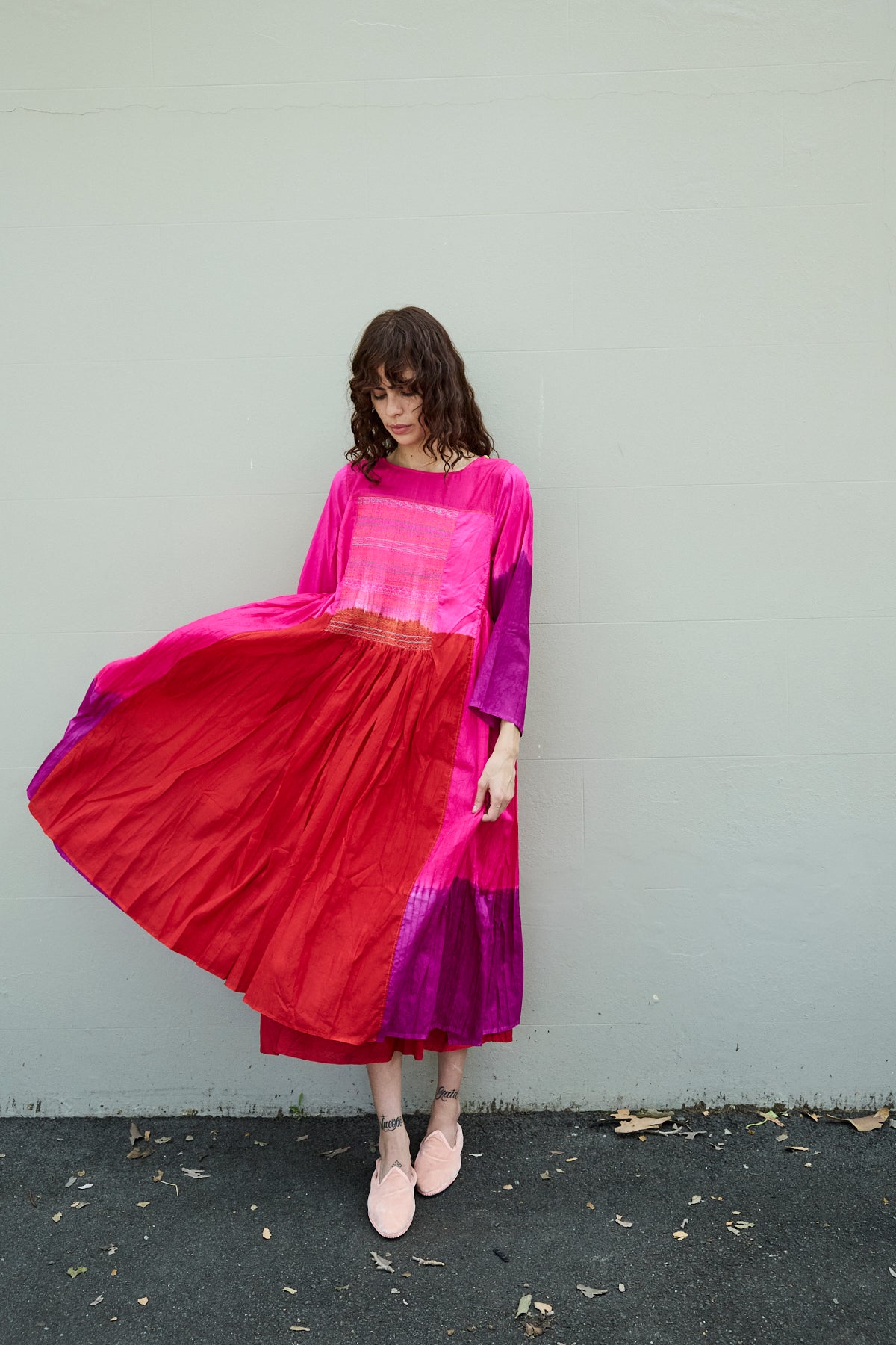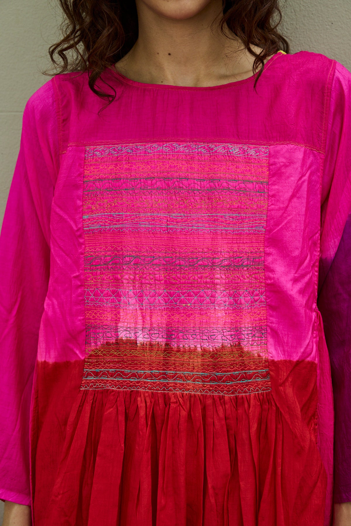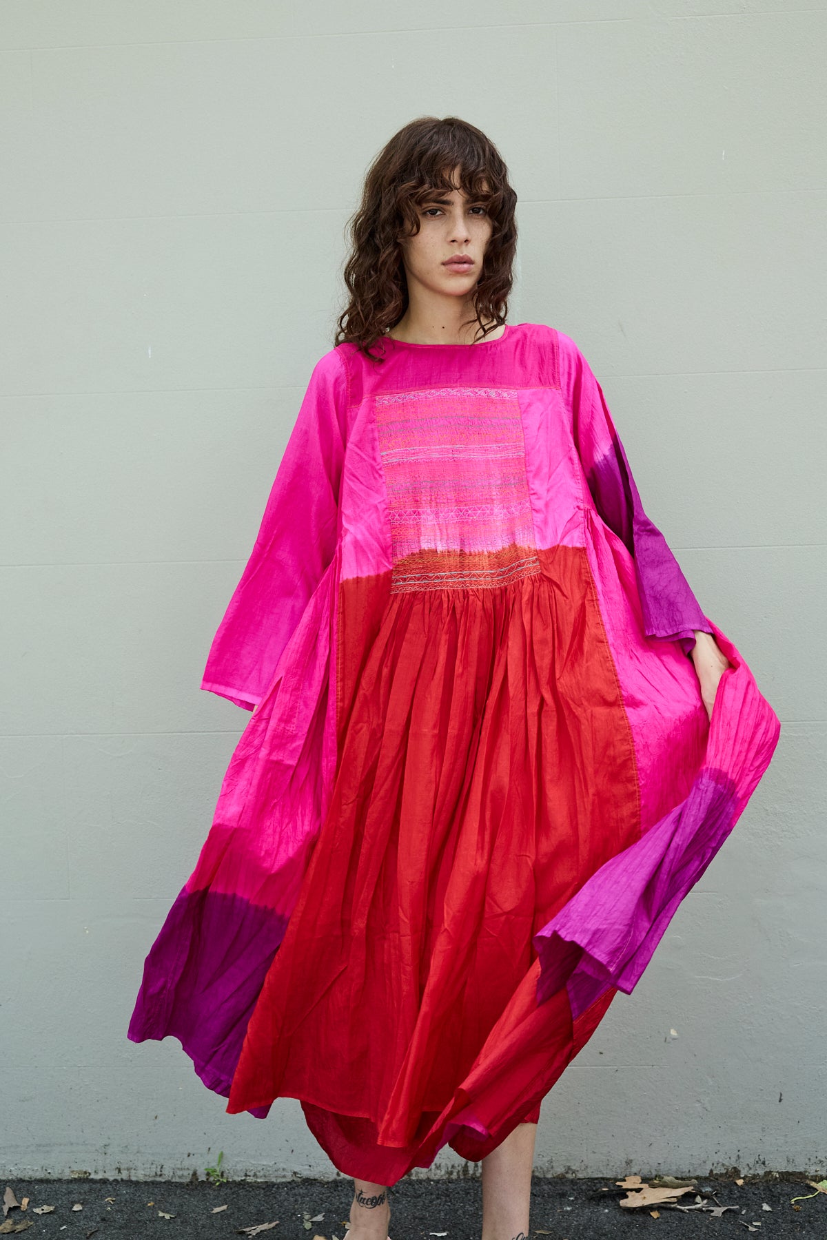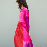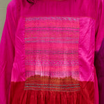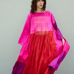 An intricately crafted dress in handwoven silk. Features a fully embroidered front and back yoke with a round neck and side button closure. Contrast single yellow crochet button detail. Contrast tie dye pattern in fuchsia, red and purple through the dress. Side slit pockets. Full sleeved. A maxi length.