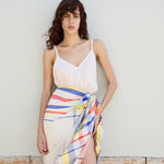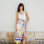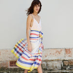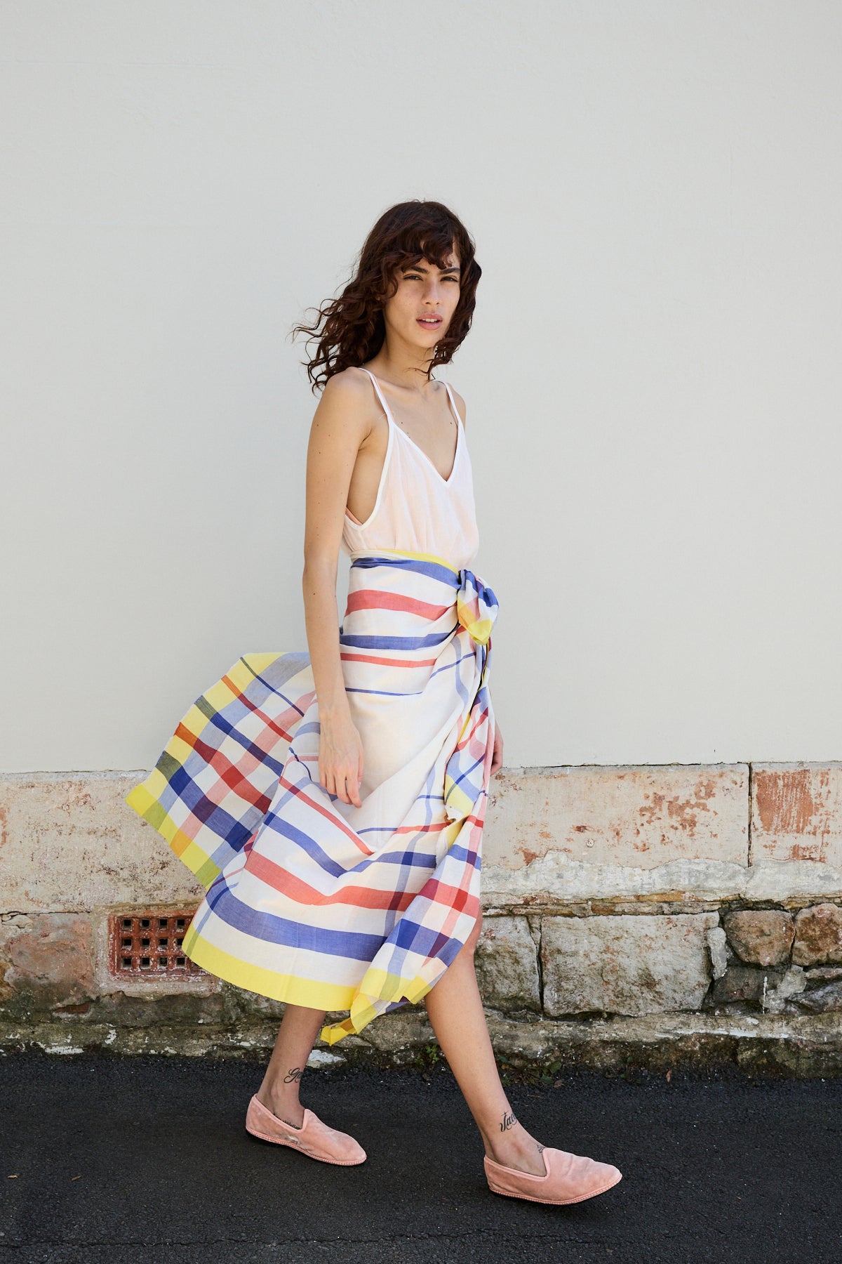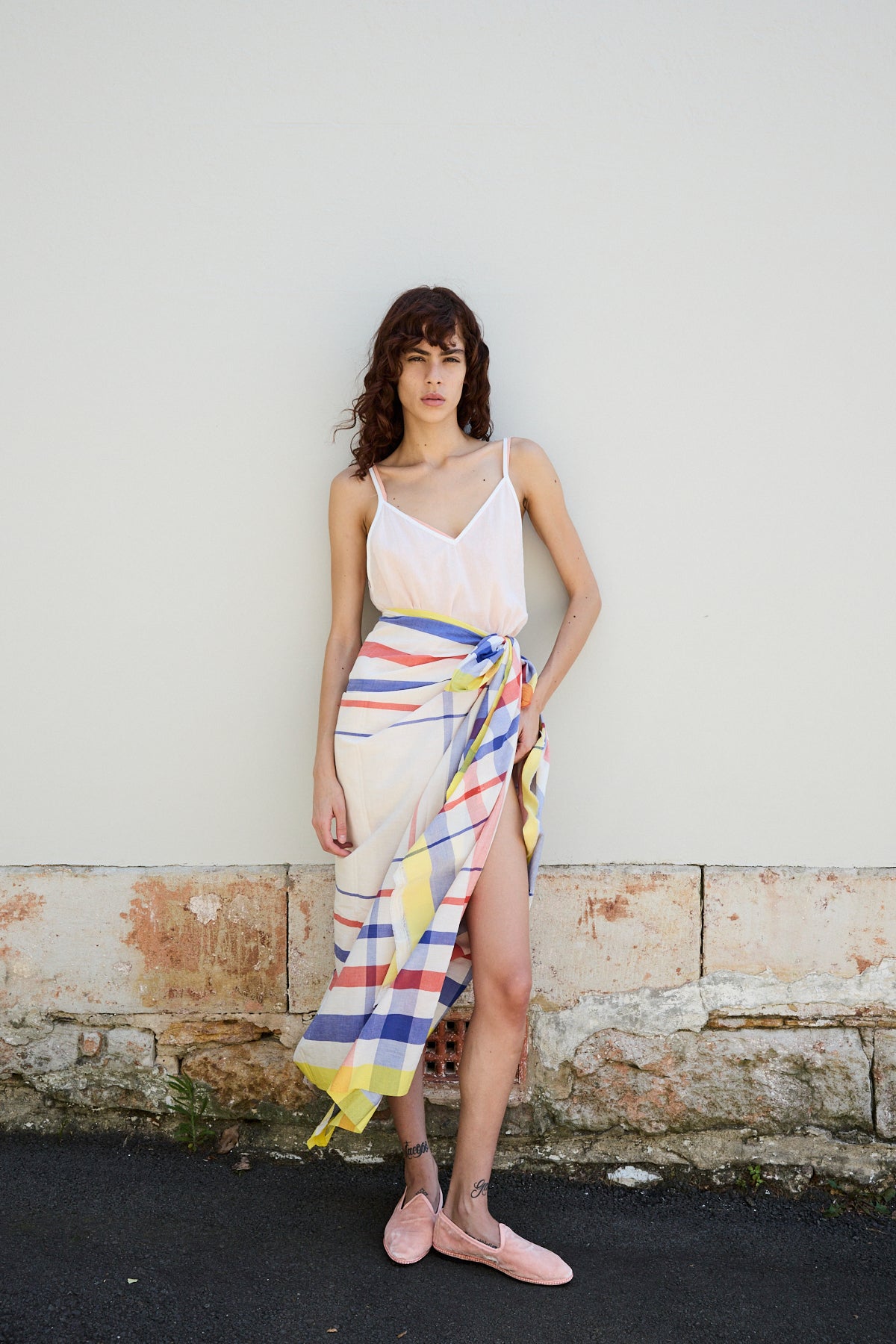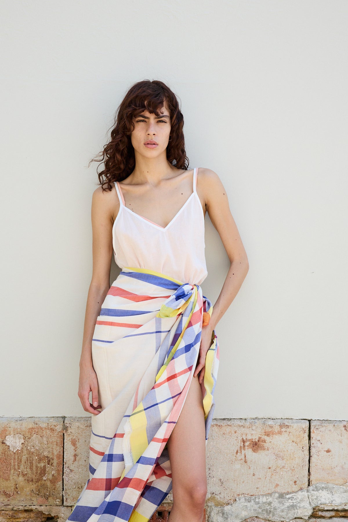 A hand-woven sarong in blue and red check. Crafted by weavers in central India in soft lightweight cotton. Features our signature woven heart in yellow.