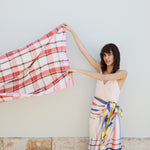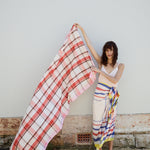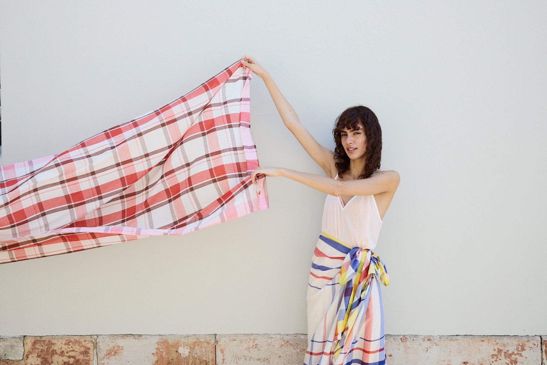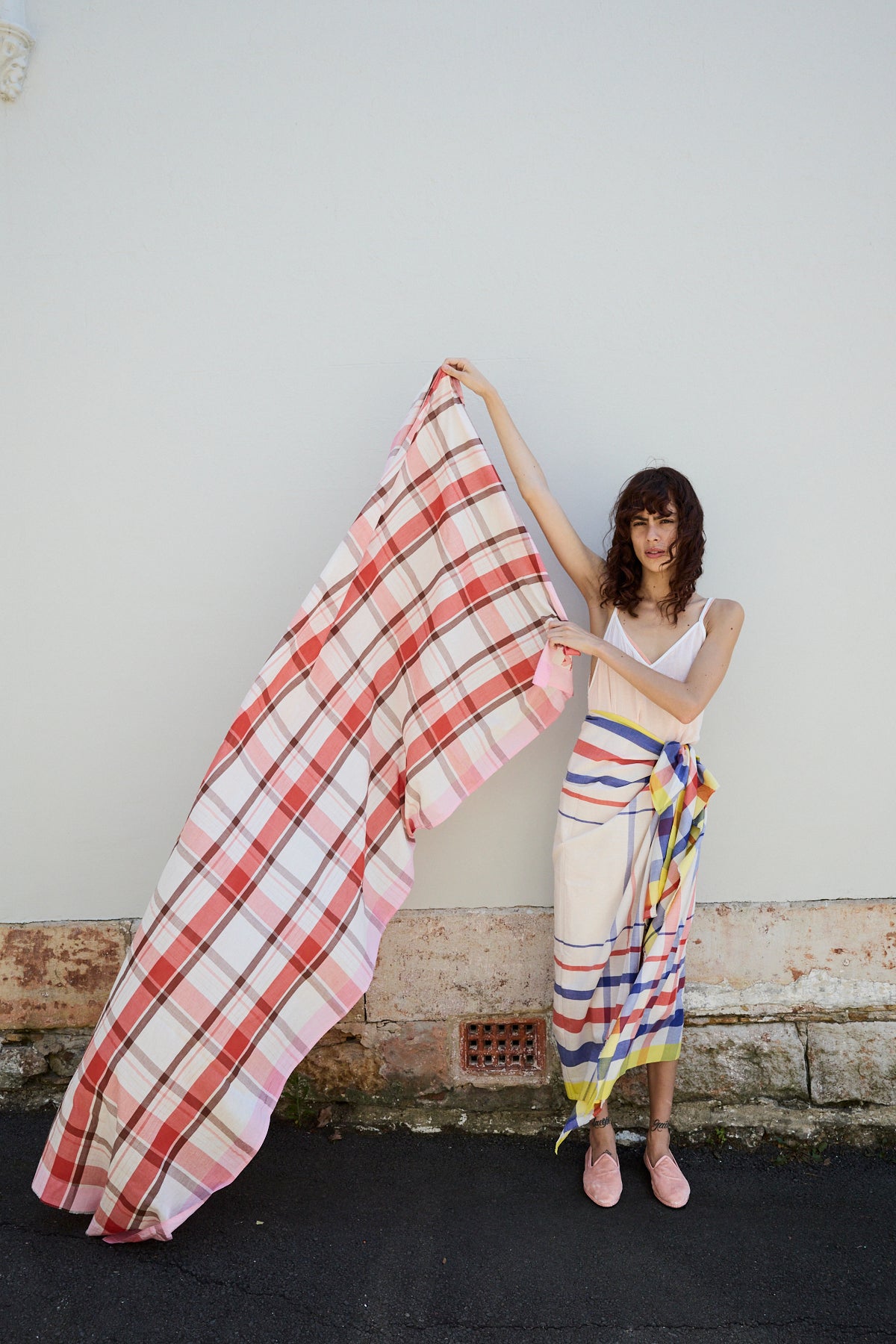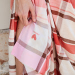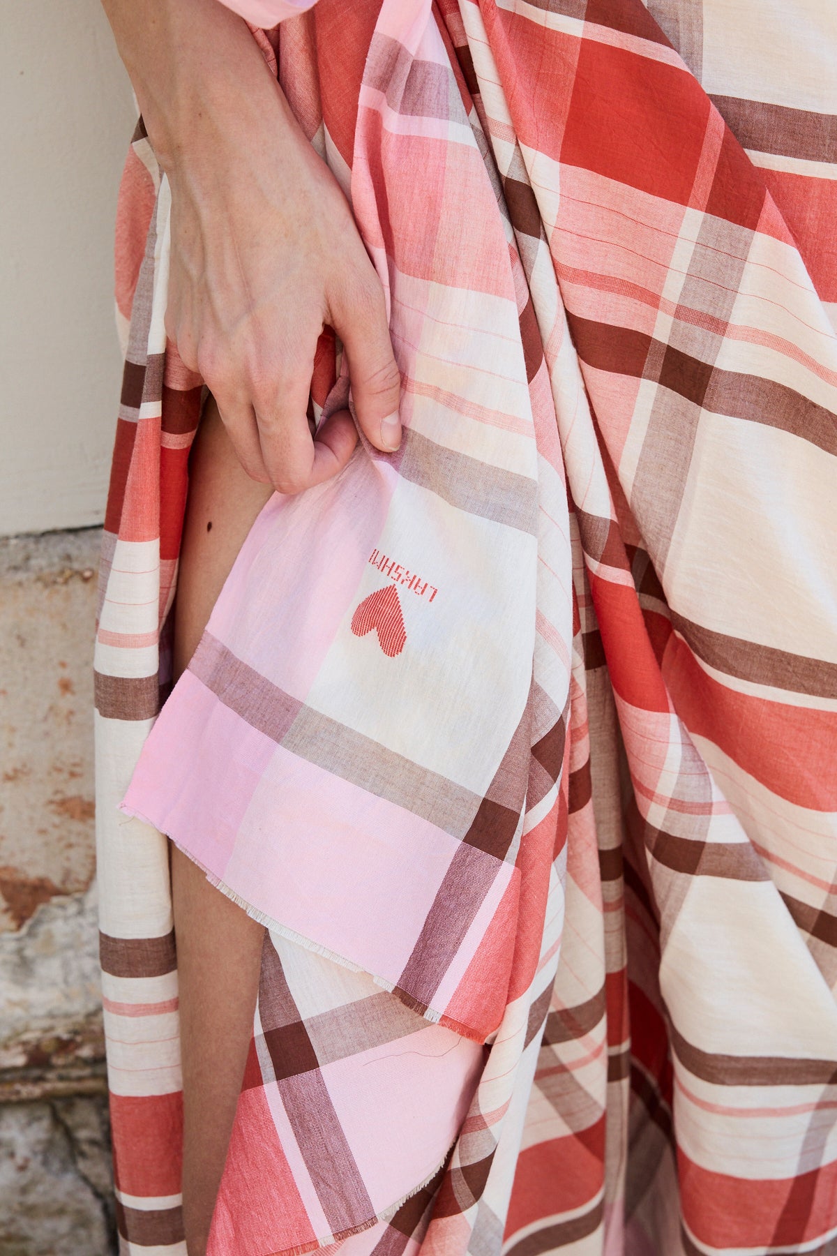 A hand-woven sarong in pink and brown check. Crafted by weavers in central India in soft lightweight cotton. Features our signature woven heart in pink.