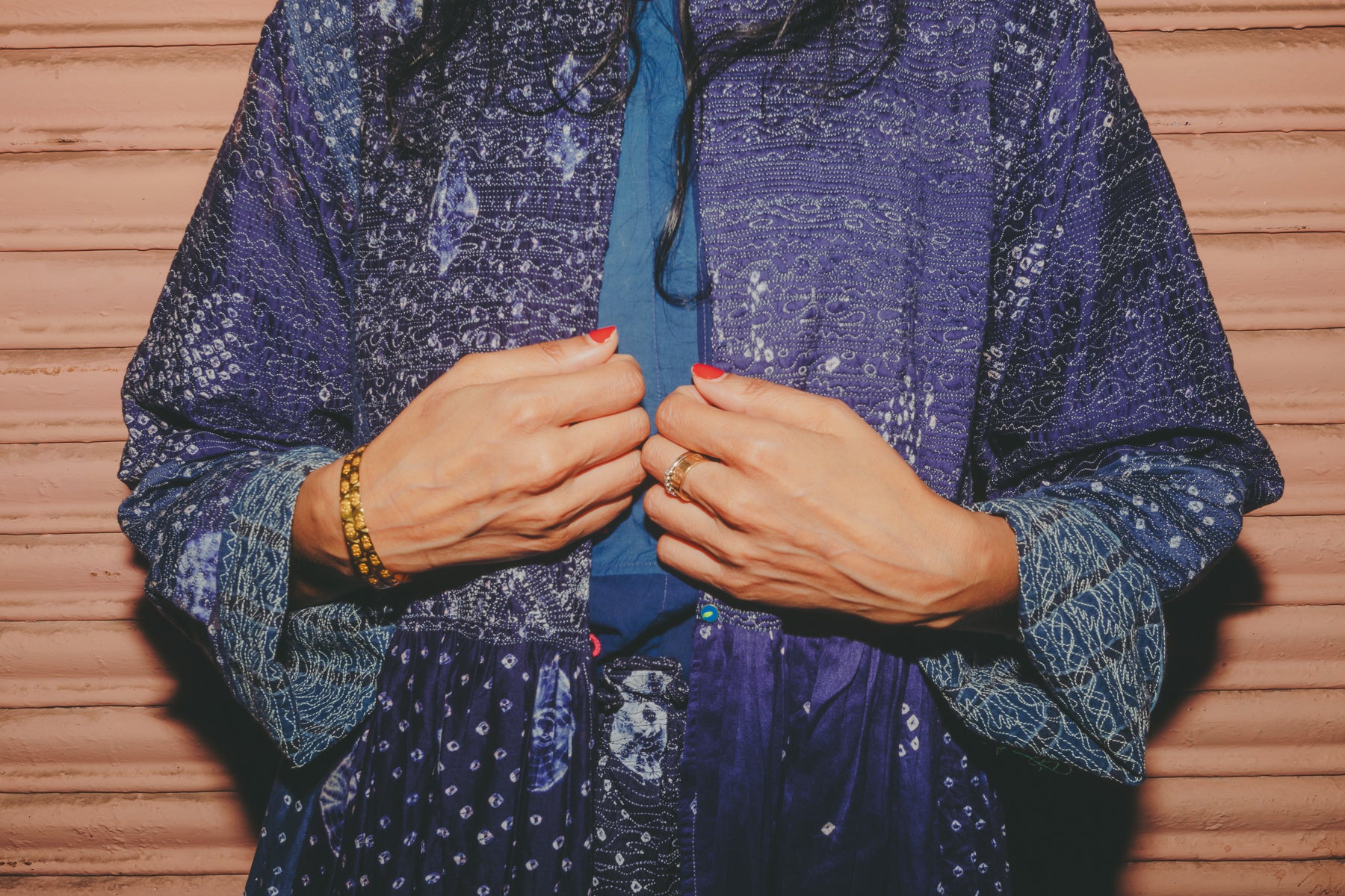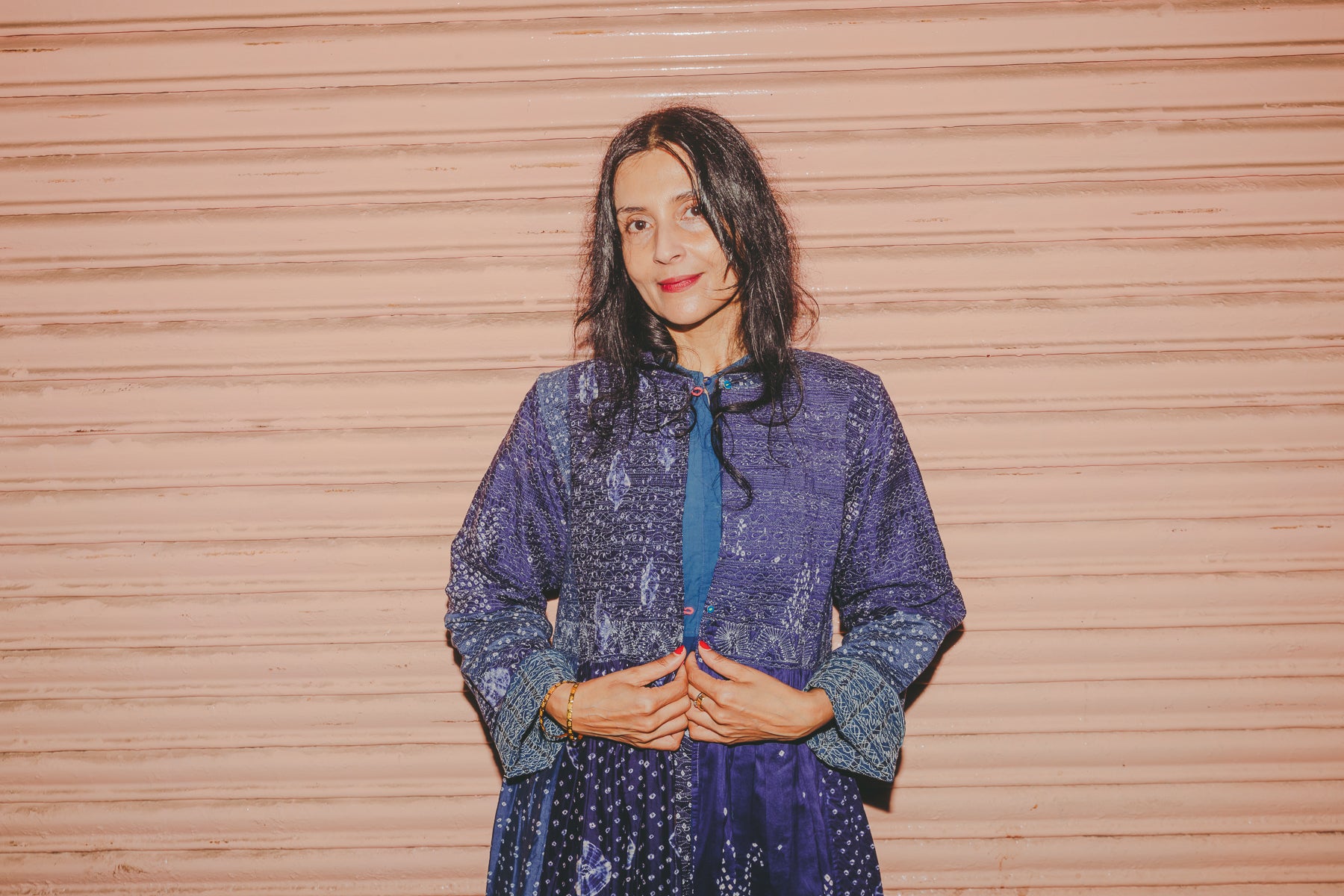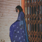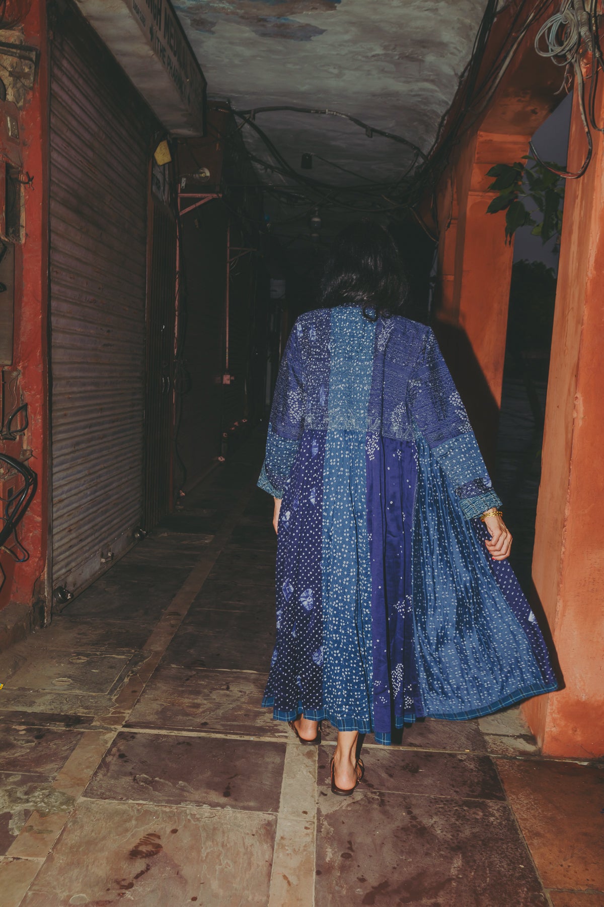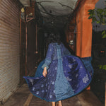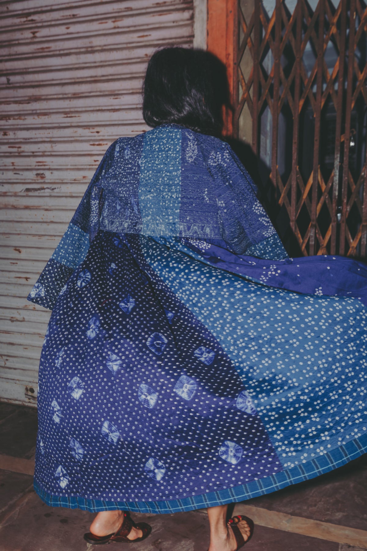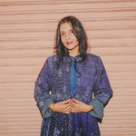 A beautifully crafted handwoven coat dress. Features a high round neck with contrast fuchsia loop and silver metal button fastening. Pieced together in multiple panels of indigo and intricate hand tie&dye bandhini in varying sizes fully through the garment. Embroidered ruching detail along top front and back with fully embroidered yoke and sleeves. A babydoll style, circle cut with voluminous pleats and panels. Double layered and fully lined. Concealed side slit pockets. A reversible, layering style. To be worn on it's own or styles over as a coat.