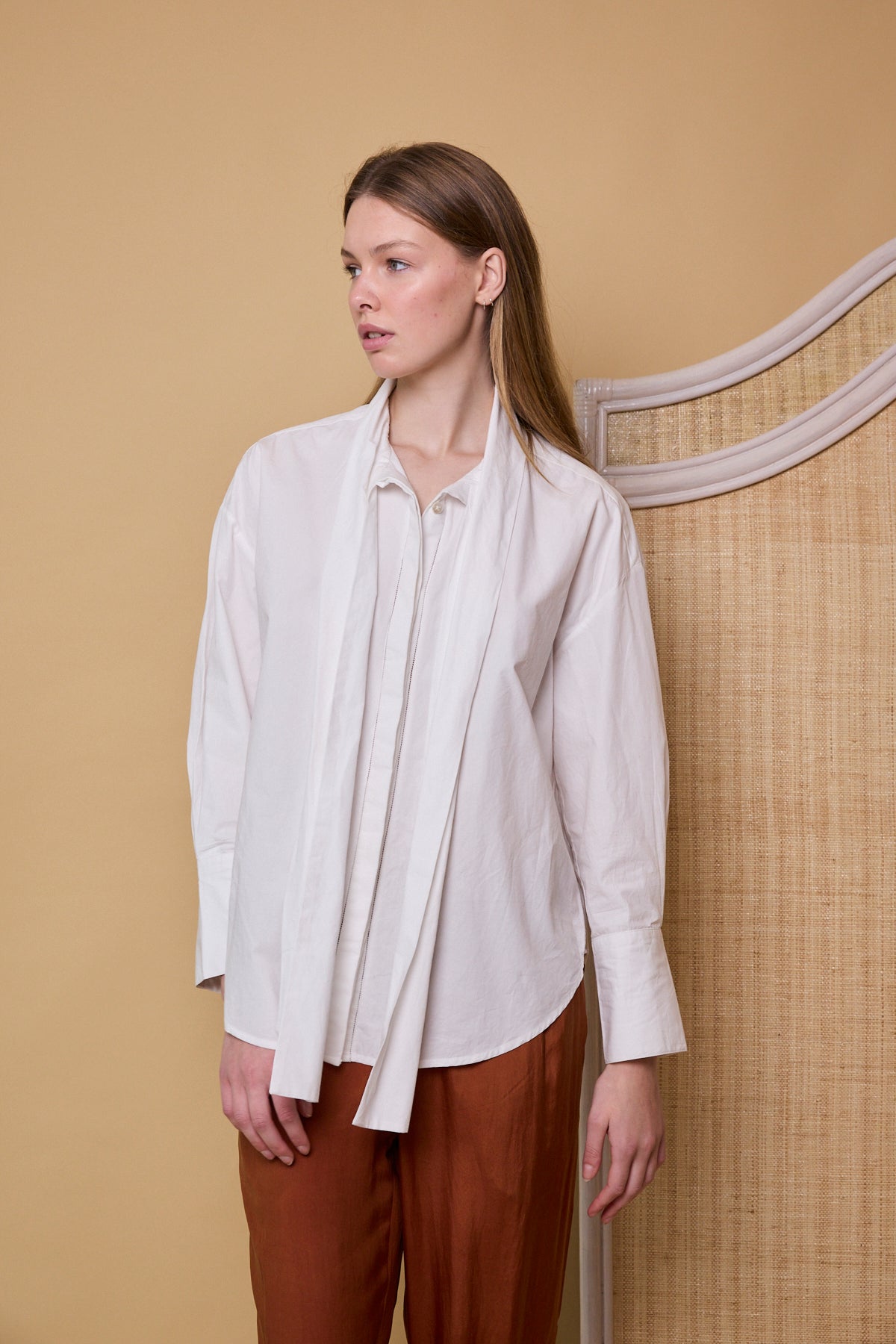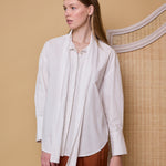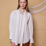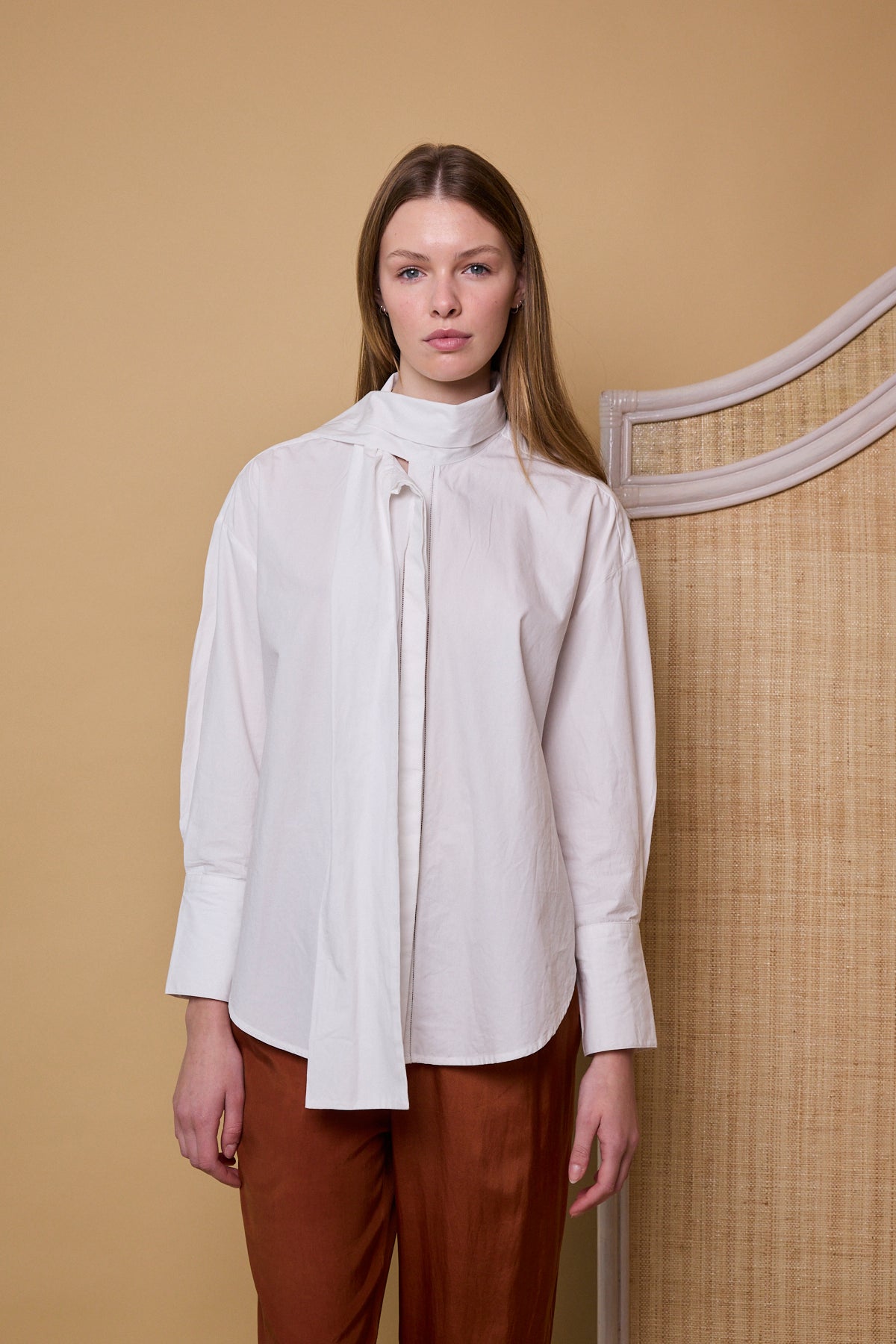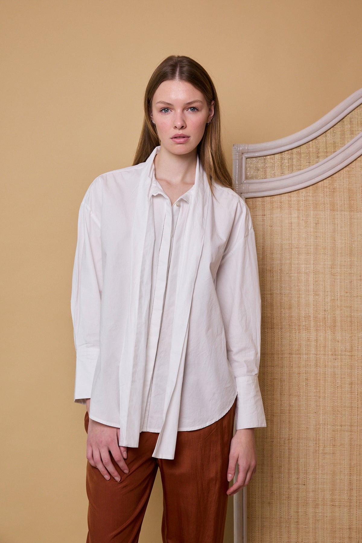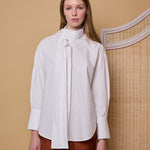 A staple crisp white cotton shirt. A pussy-bow style with double ties that can be styled in different ways. Completed with a white interlock detail along front and cuffs. Front placket with hidden buttons for fastening. Wide cuffs with double button closure. Asymmetrical hem, slightly longer at the back.