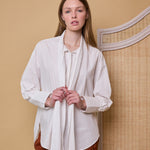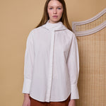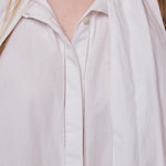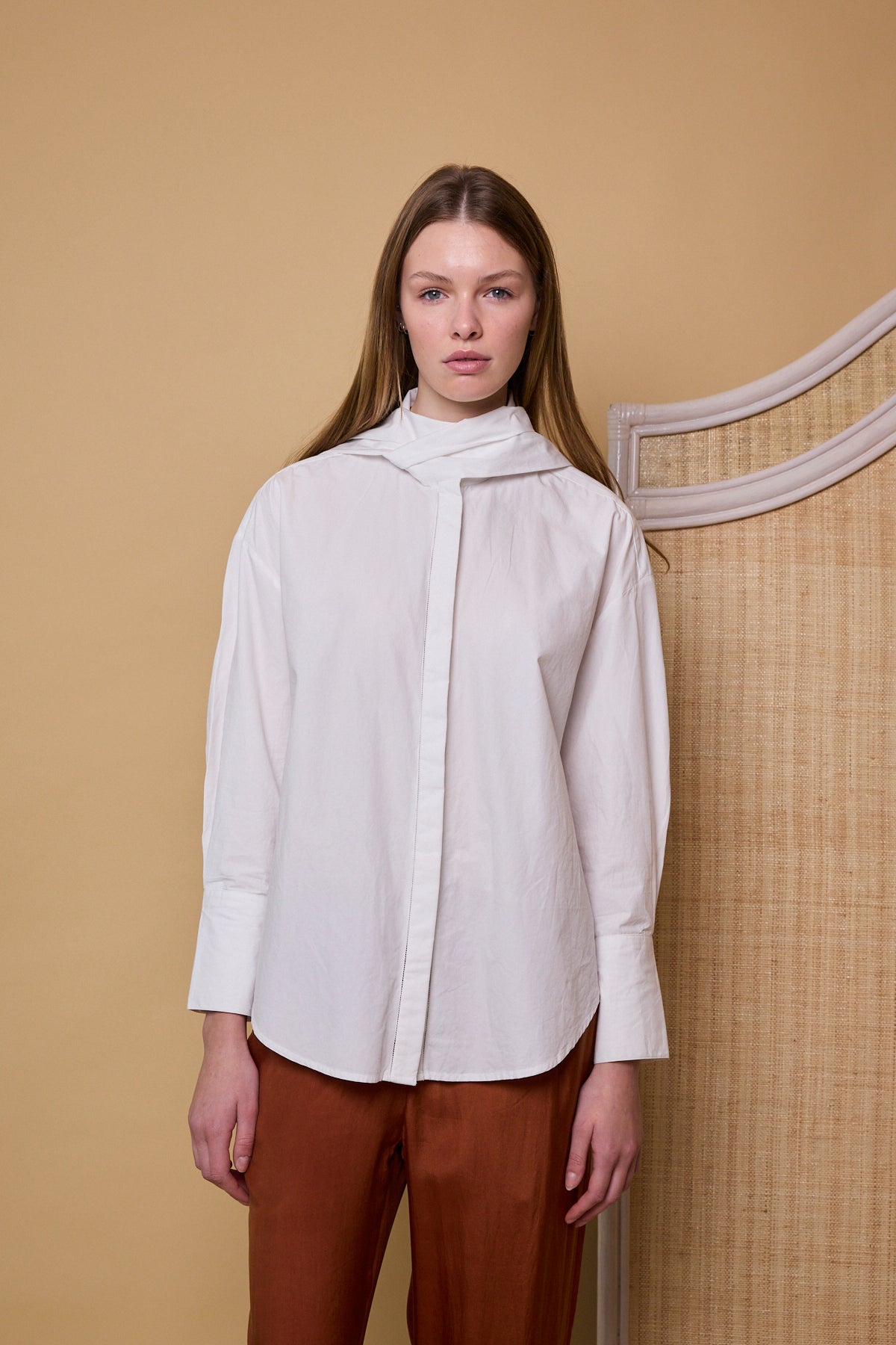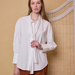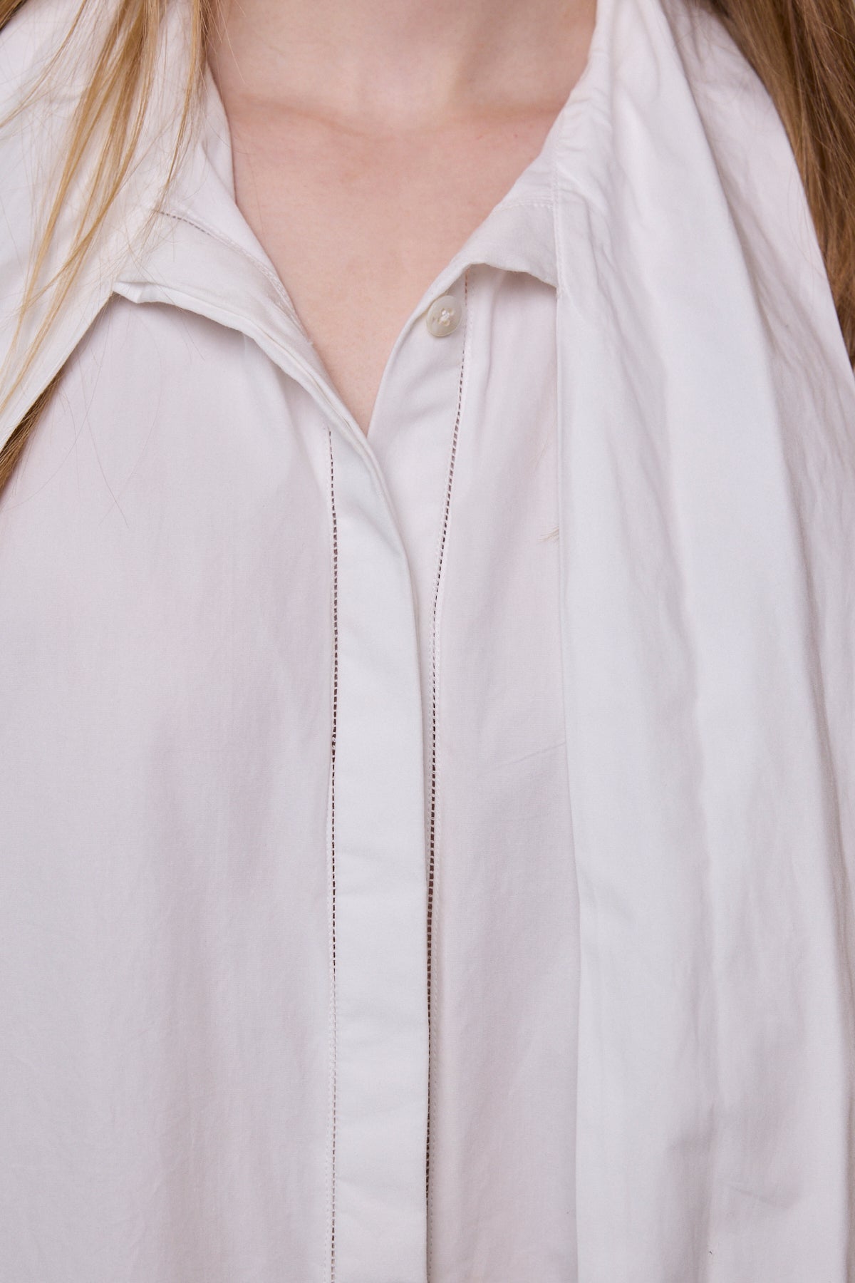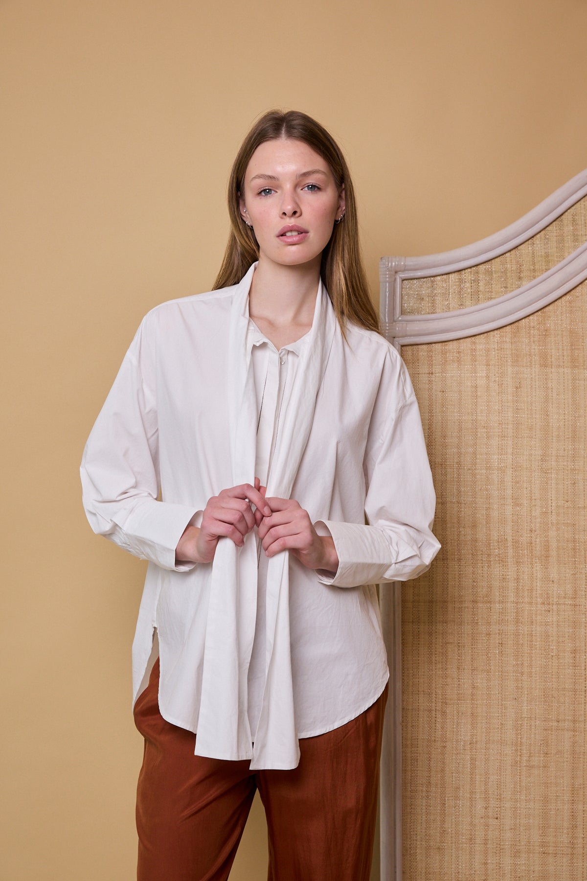 A staple crisp white cotton shirt. A pussy-bow style with double ties that can be styled in different ways. Completed with a white interlock detail along front and cuffs. Front placket with hidden buttons for fastening. Wide cuffs with double button closure. Asymmetrical hem, slightly longer at the back.
