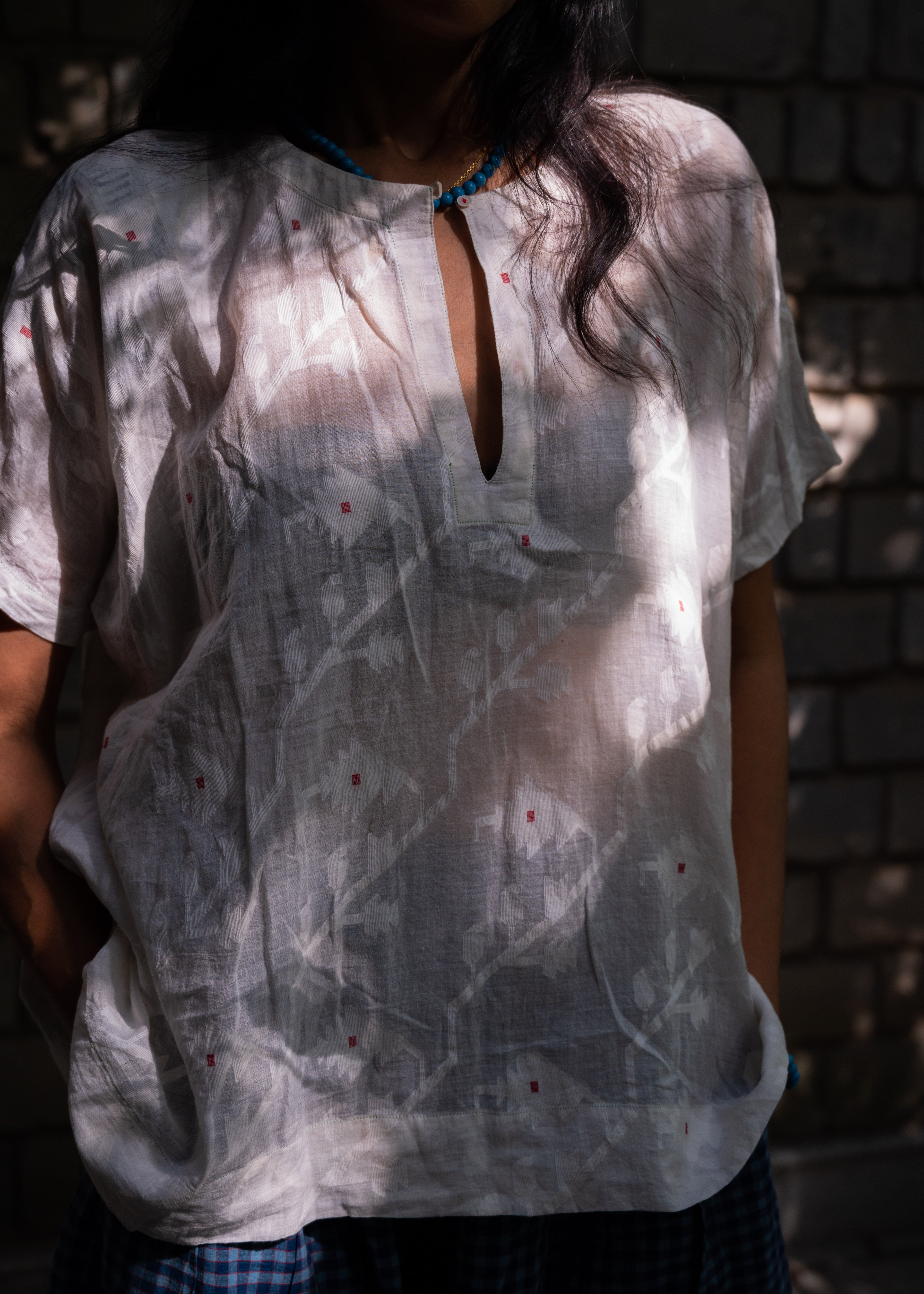 A jamdani woven blouse. Intricately handwoven in sheer cotton with white on white geometric patterns. Contrast red detail. Single front button closure with red stitch. A boxy oversized fit. Half sleeves.