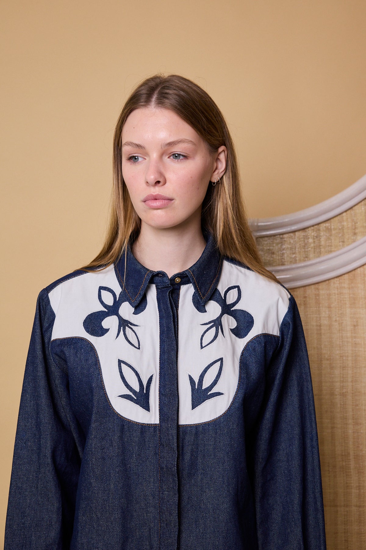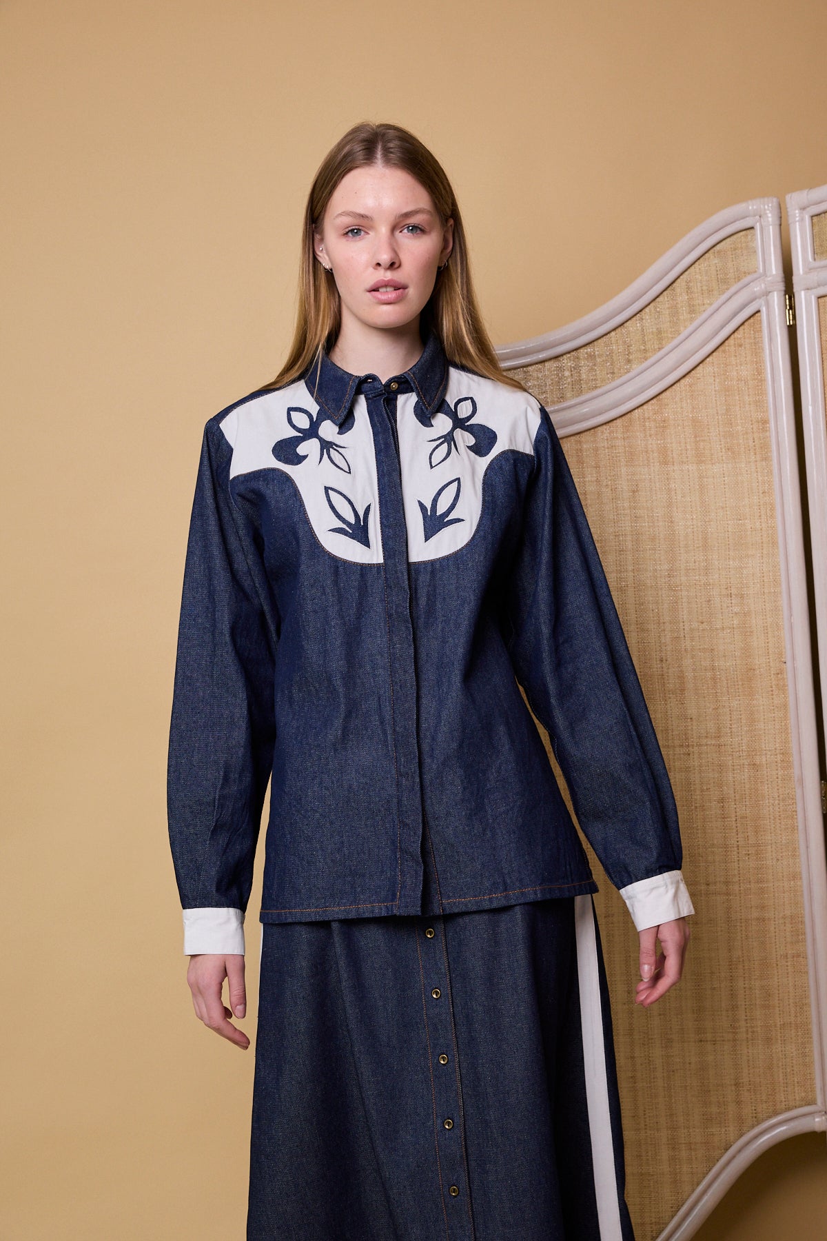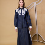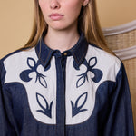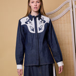 A hand embroidered denim shirt made with 100% cotton denim. Features crisp white cotton applique design on the front yoke. Contrast white cuffs with single button closure. Front collar with placket and hidden metals buttons. Low slits on both sides of the jacket