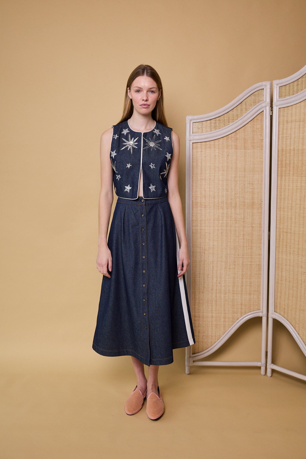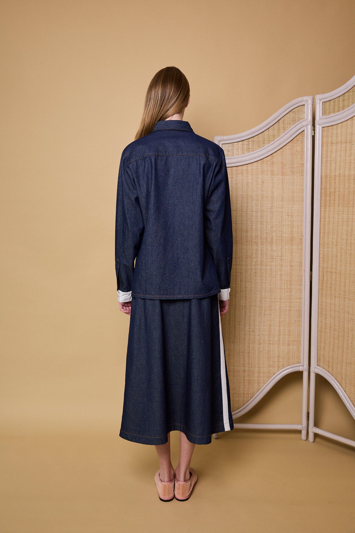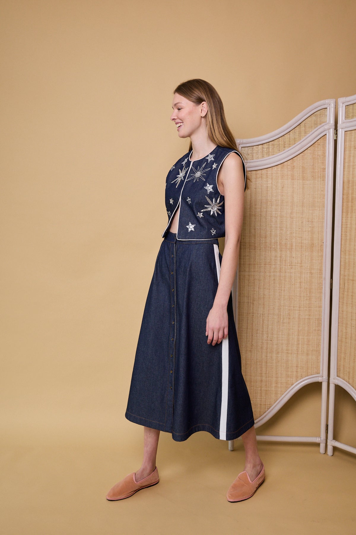 An A-line button up front denim skirt made with 100% cotton denim. Features a contrast white cotton panel along the sides of the skirt. A button down front for closure with metal buttons. Slight front slit.
