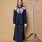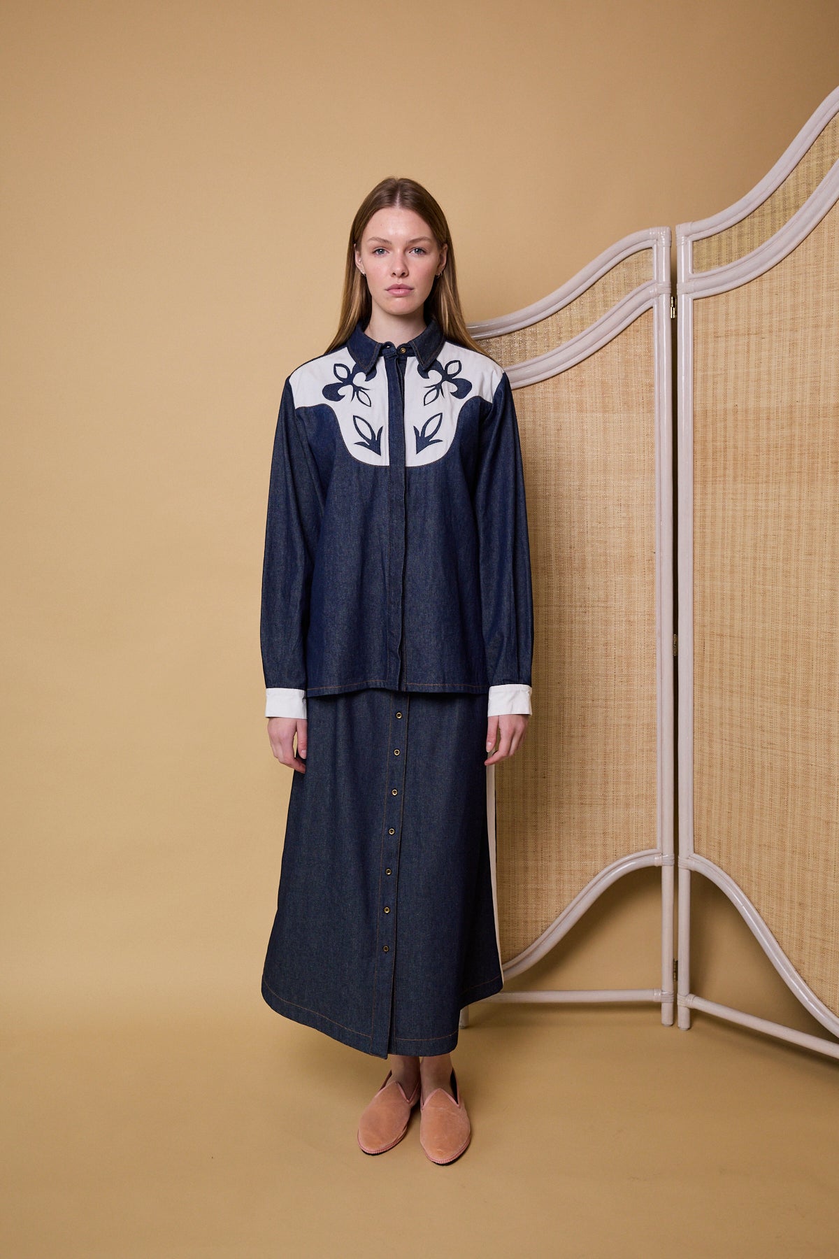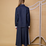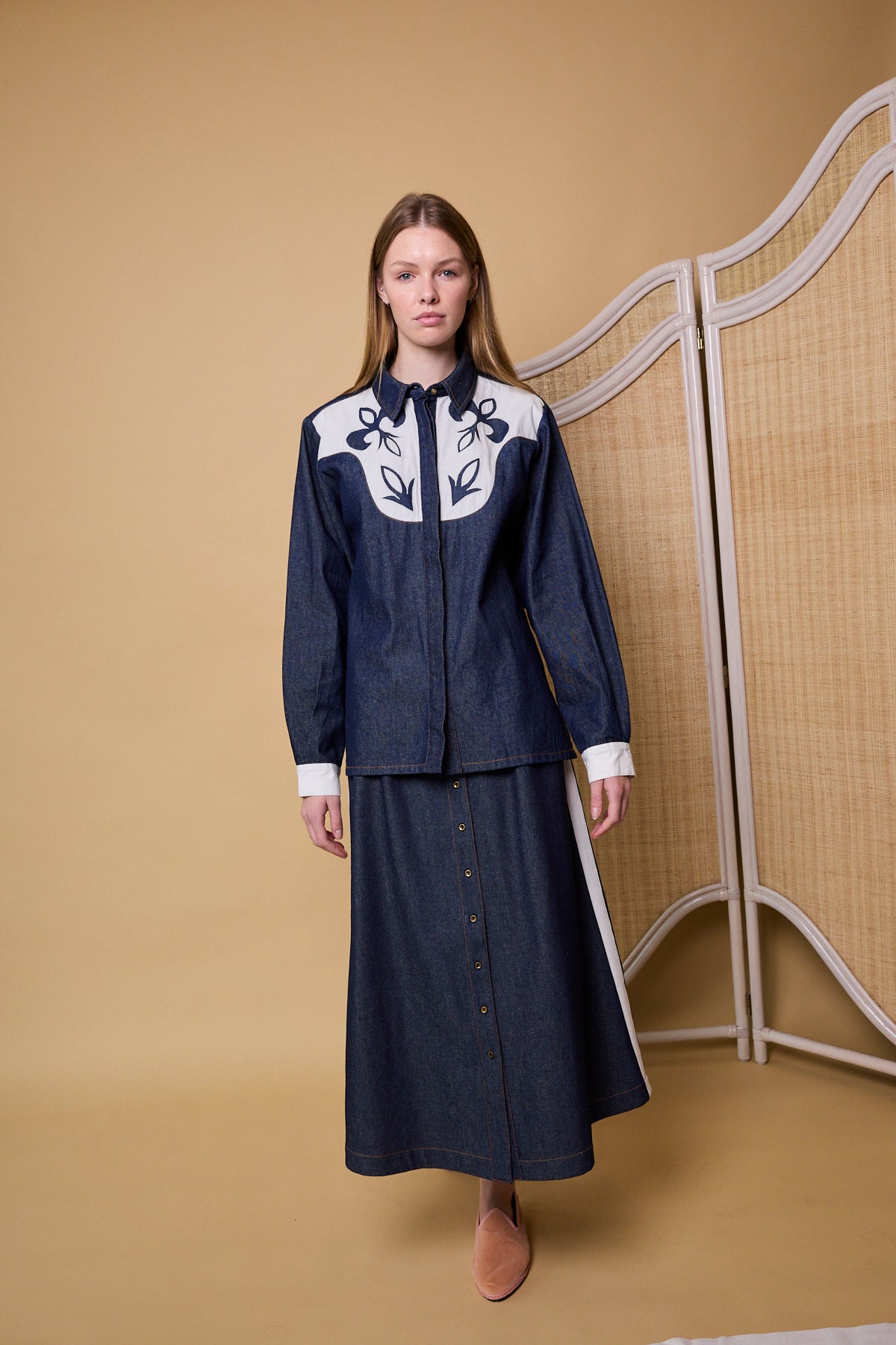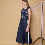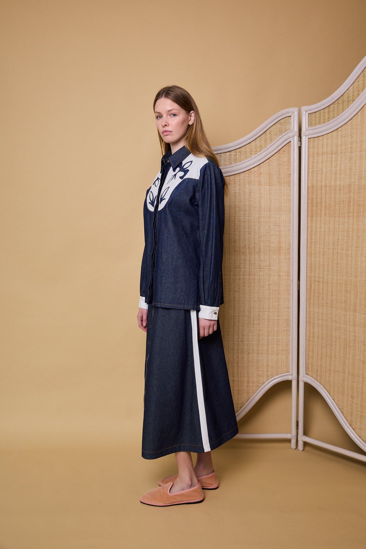 An A-line button up front denim skirt made with 100% cotton denim. Features a contrast white cotton panel along the sides of the skirt. A button down front for closure with metal buttons. Slight front slit.