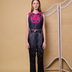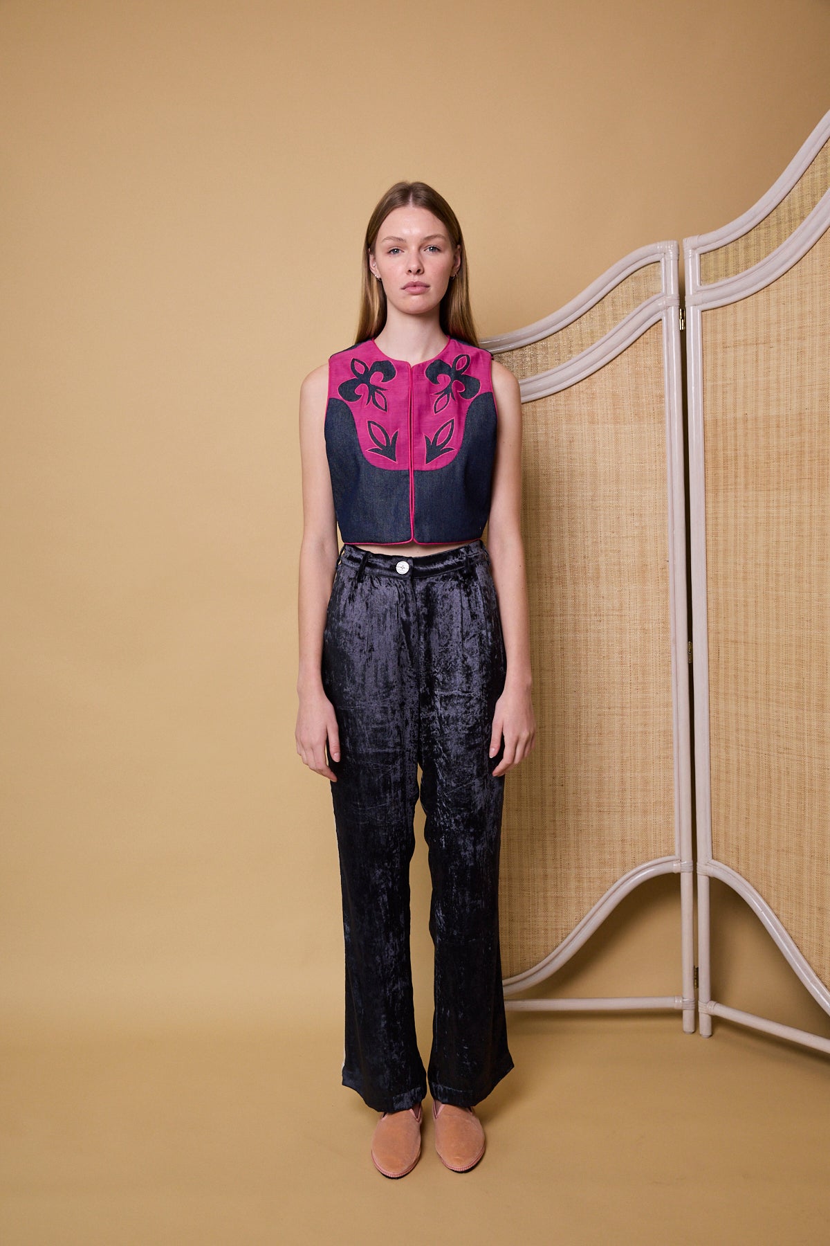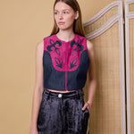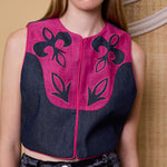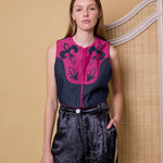 DYNASTY VEST, DENIM/FUCHSIA COTTON APPLIQUE