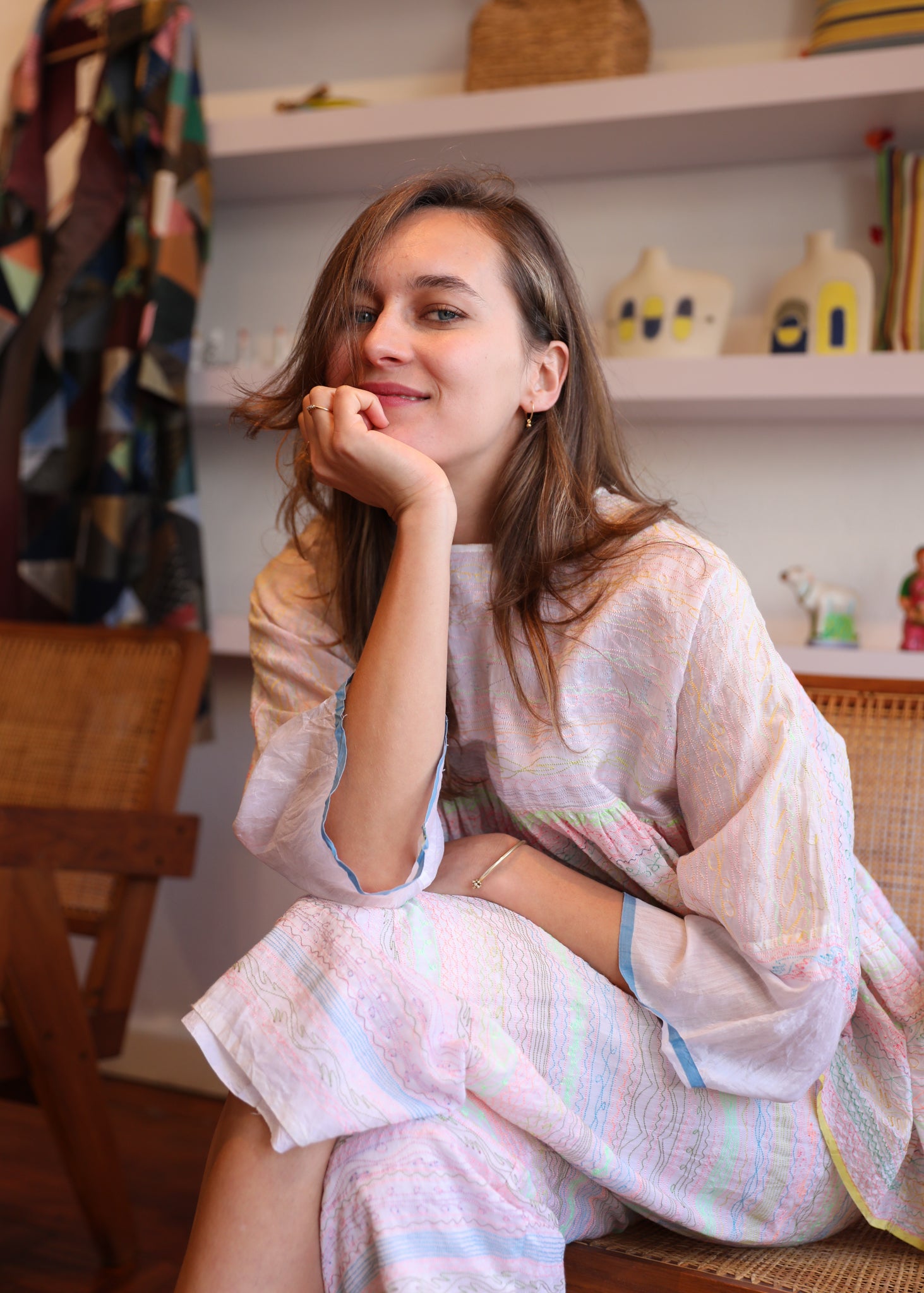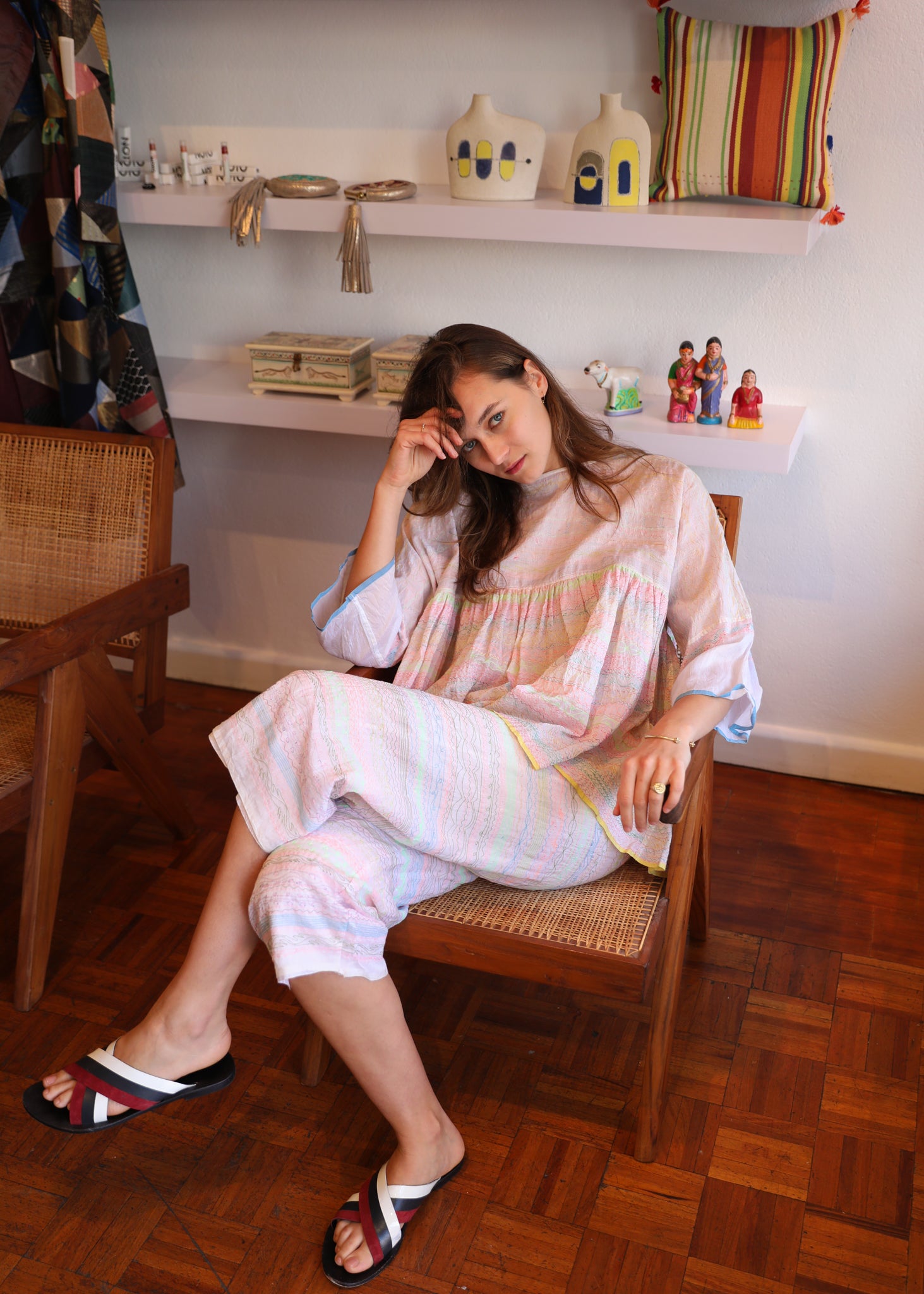 A delicately handwoven 50% cotton & 50% silk pant. The pants are double layered, and cropped above the ankle with a straight leg cut. They have a sheer and delicate finish with a silk inner pant. Multicolor stitching adorns the whole pant. Front band with elasticised waist.