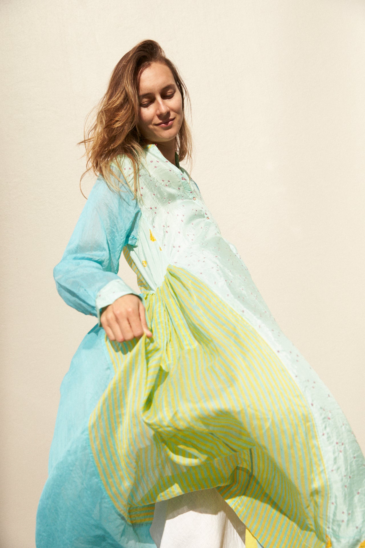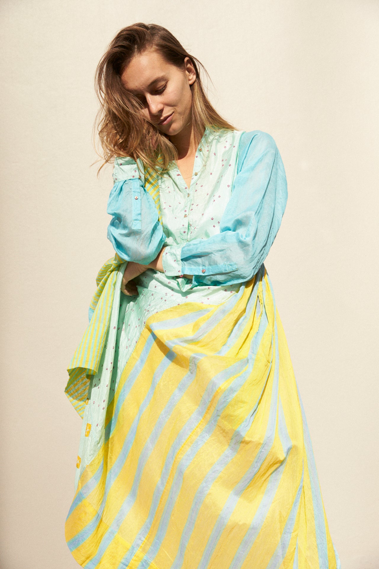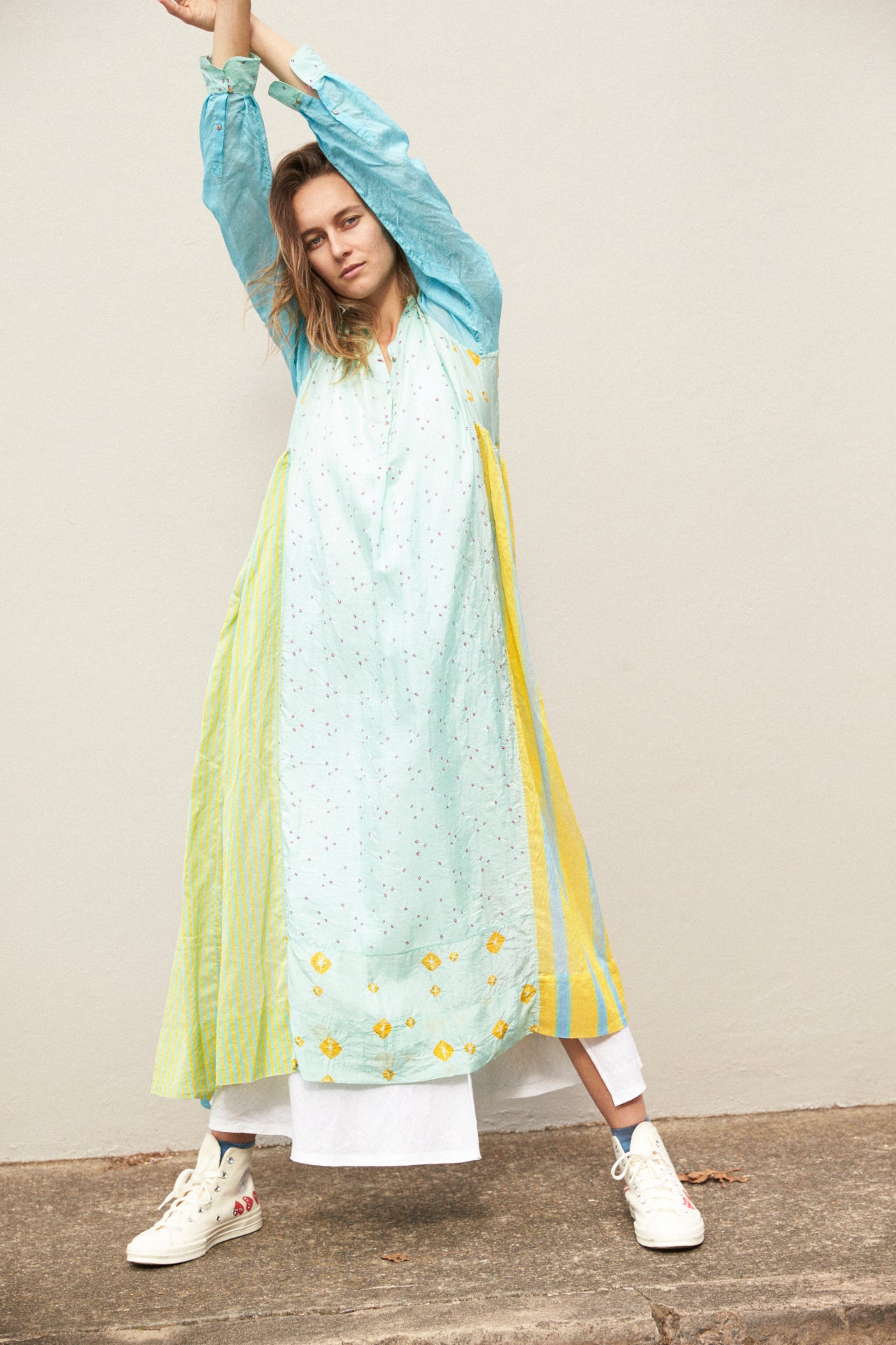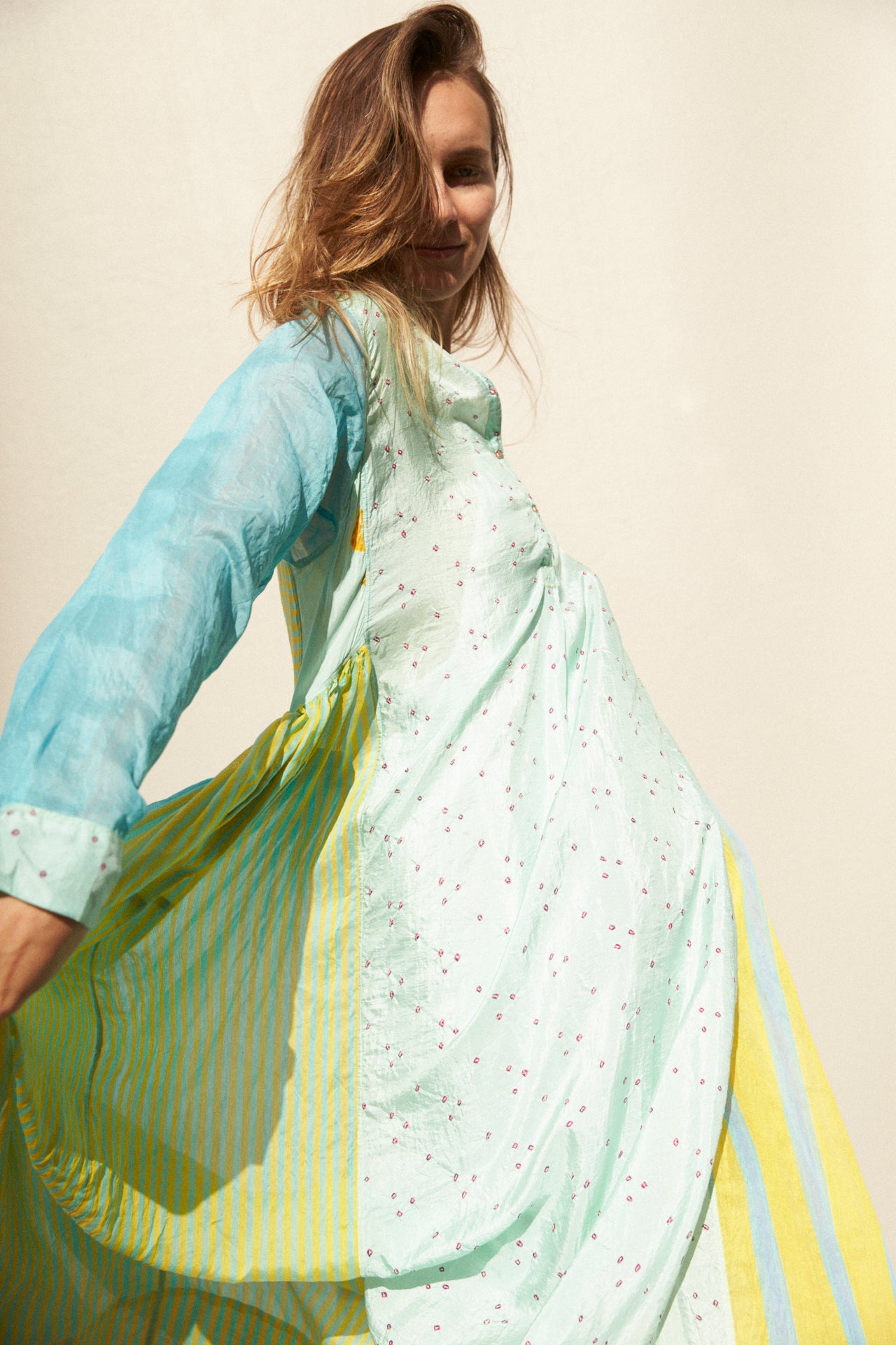 A delicate 50% silk, 50% cotton dress featuring intricate weaving and hand tie&dye detail through the dress. High neck with small gold buttons on body for fastening. Multiple coloured panels with sides and back featuring yellow, blue, green woven stripes in horizontal and vertical directions. Ruching at the sides of body. Sheer finish. Side slit pockets. Asymmetric in design, slightly longer at the back than front.