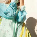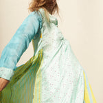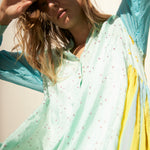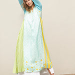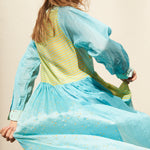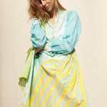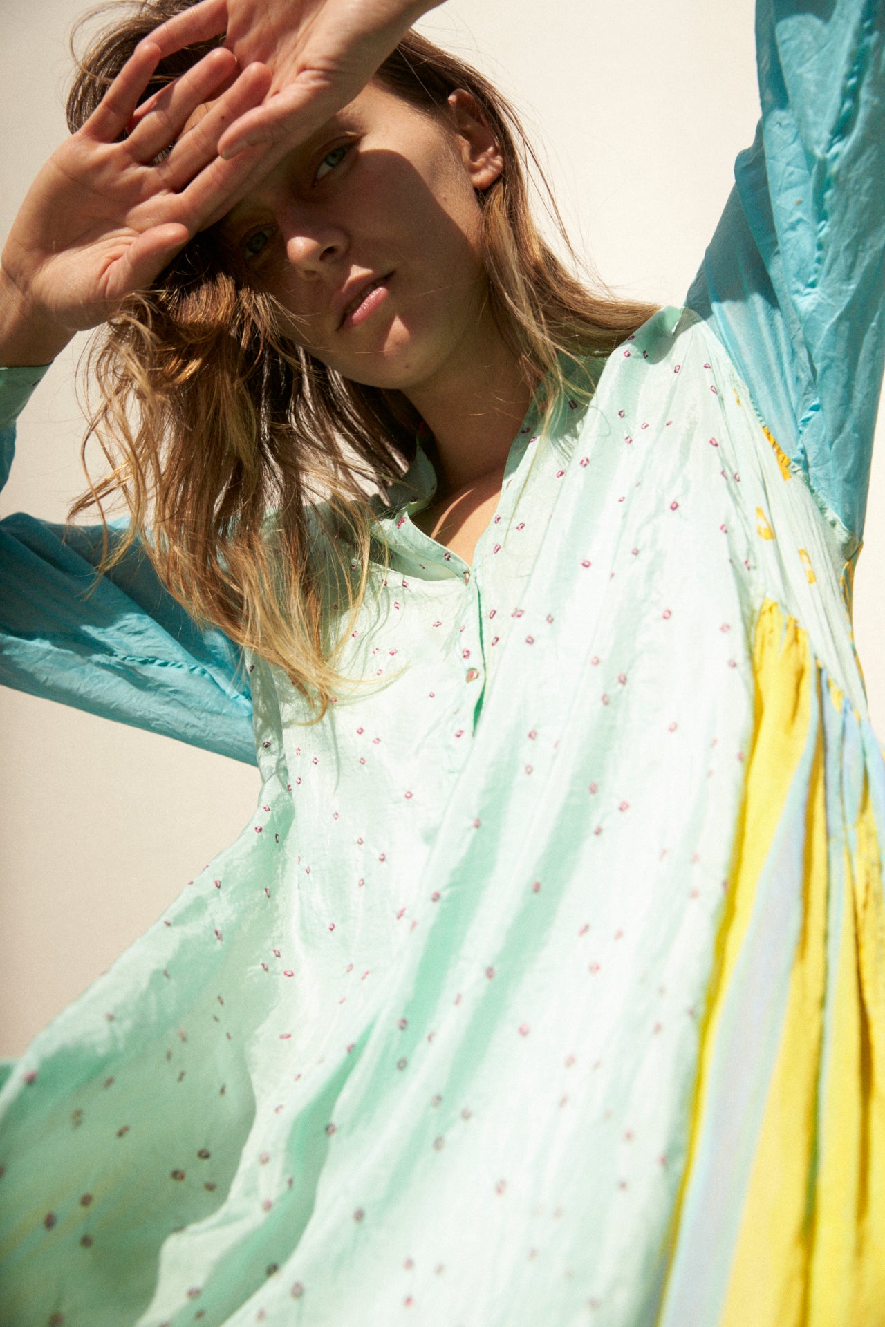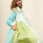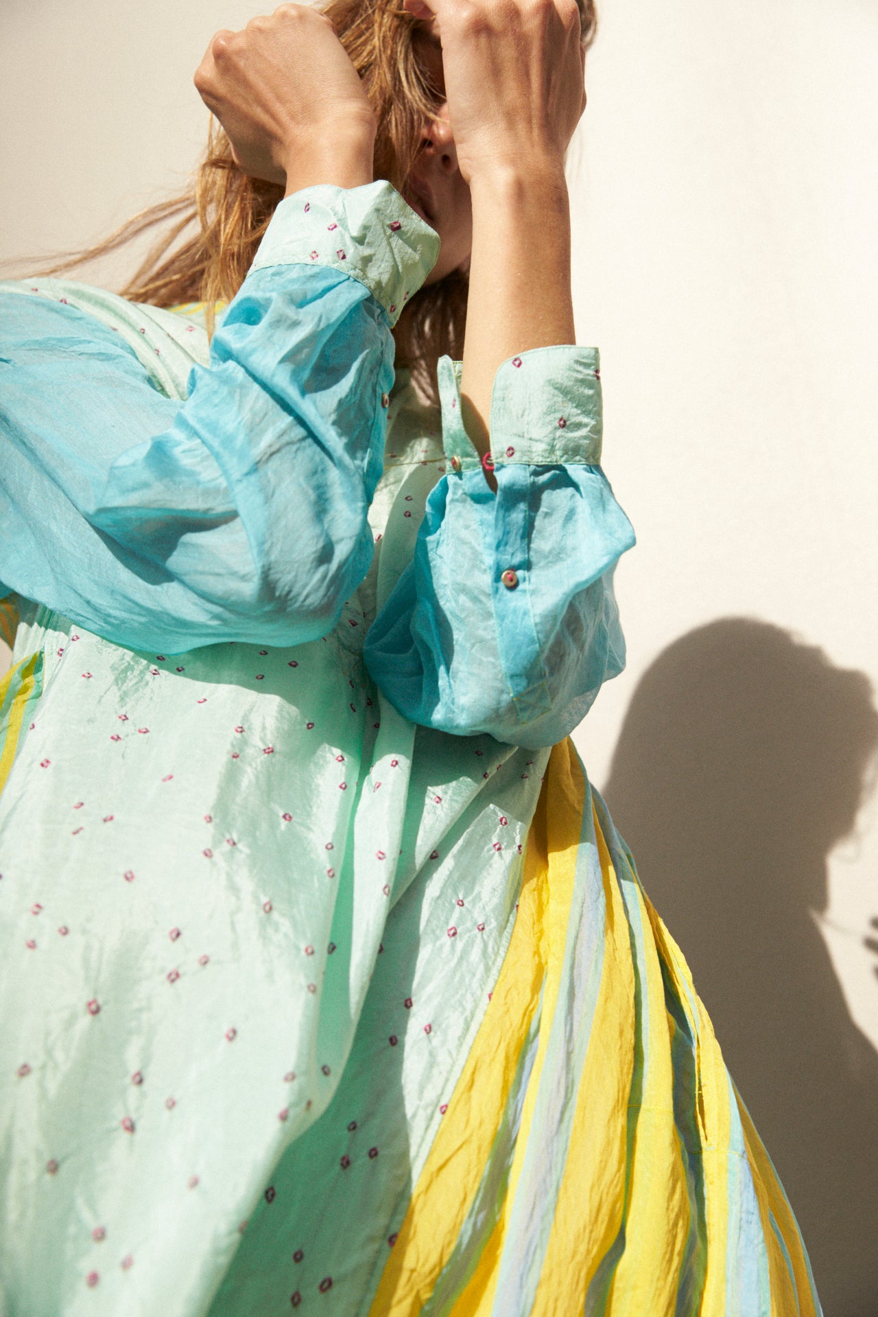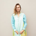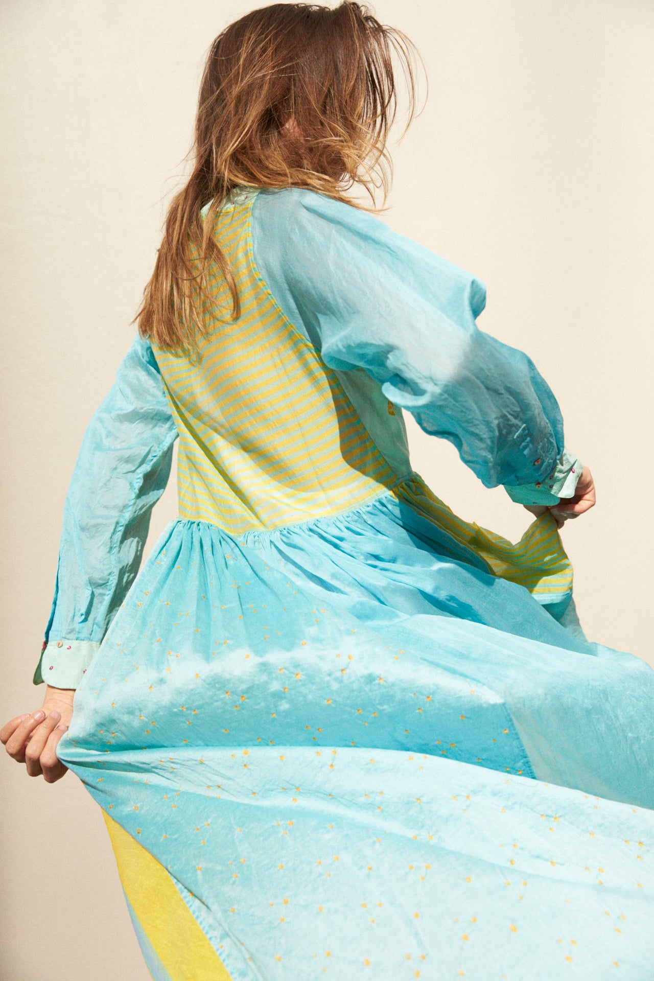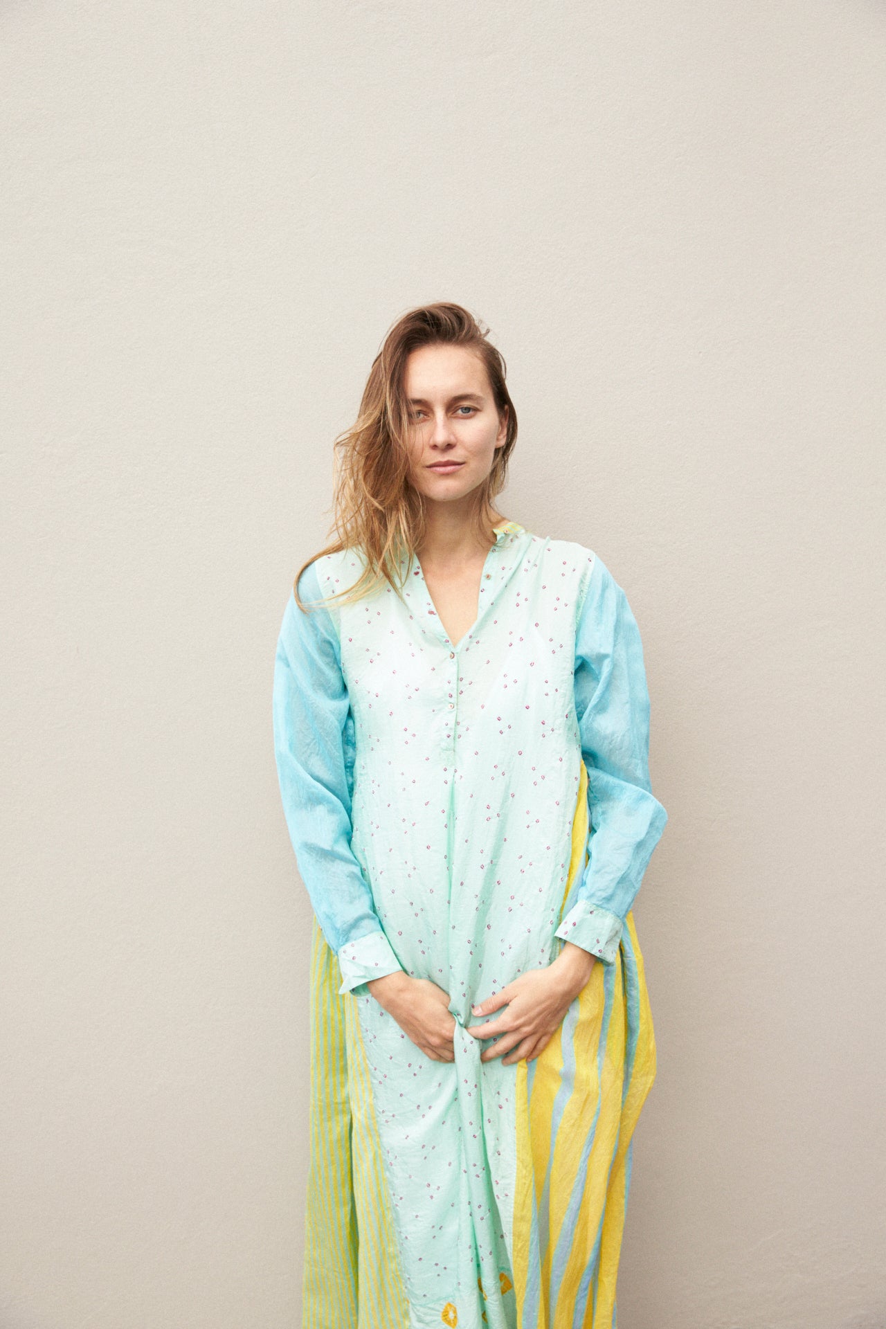 A delicate 50% silk, 50% cotton dress featuring intricate weaving and hand tie&dye detail through the dress. High neck with small gold buttons on body for fastening. Multiple coloured panels with sides and back featuring yellow, blue, green woven stripes in horizontal and vertical directions. Ruching at the sides of body. Sheer finish. Side slit pockets. Asymmetric in design, slightly longer at the back than front.