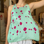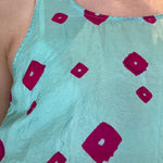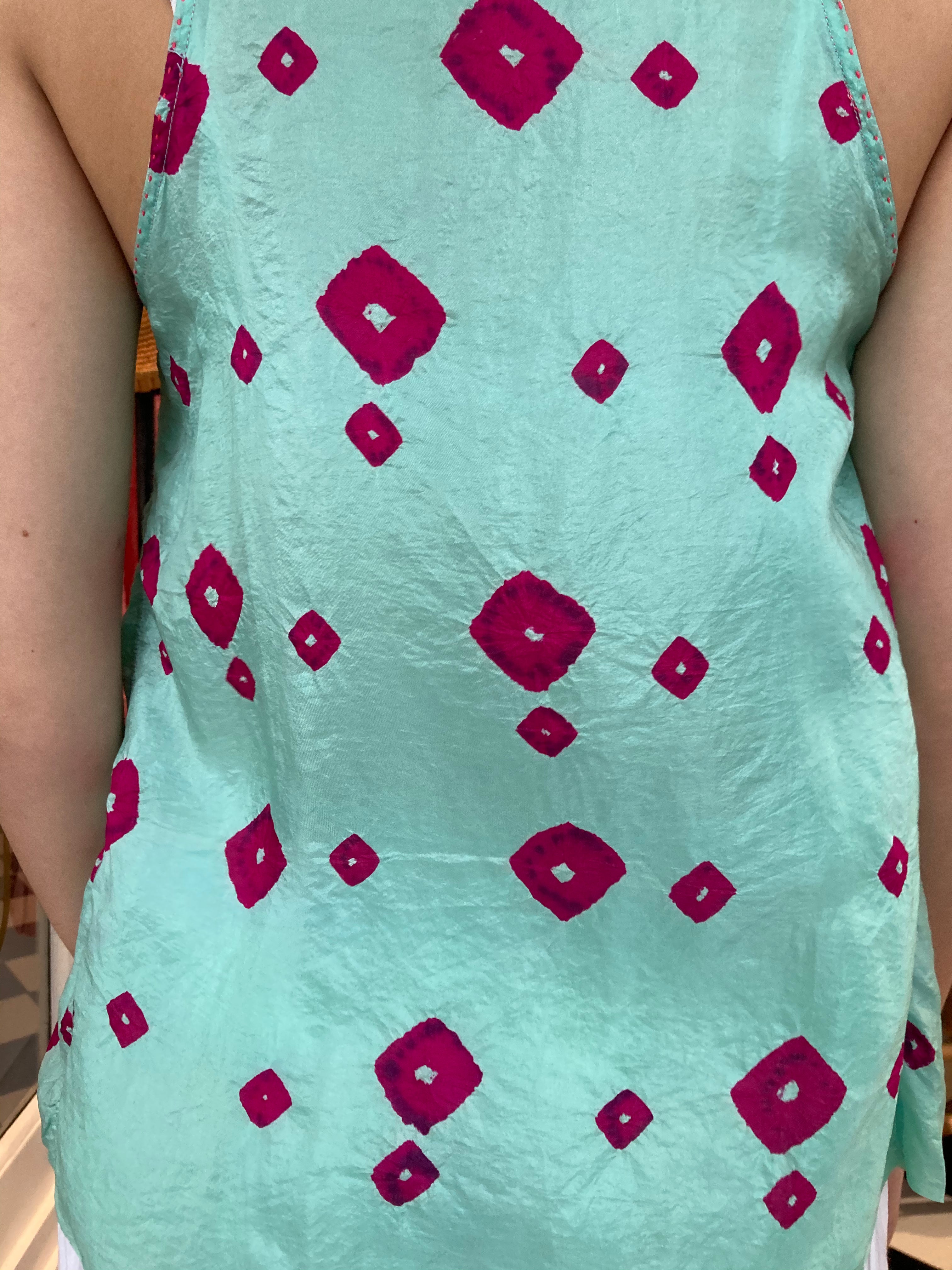 Vibrant blue pure silk tank with bhandini tie & dye hot pink spot pattern. High and round neckline with contrast pink hand stitched detail. Assymetric in design with a hi-low design. A delicate and sheer finish,