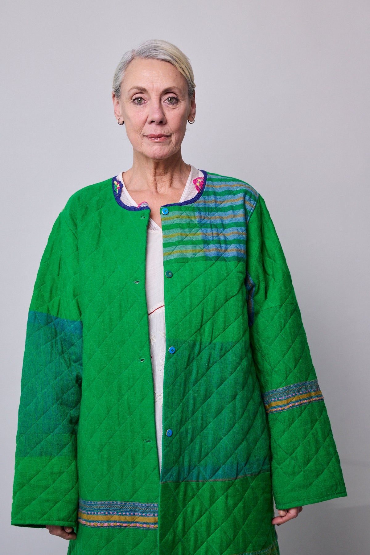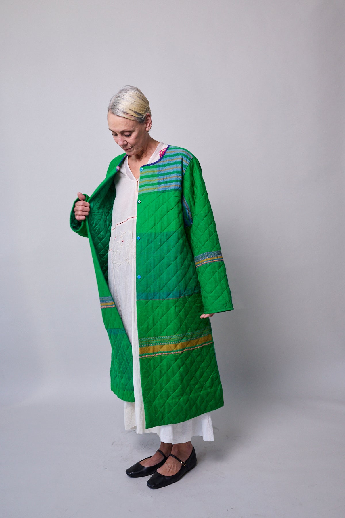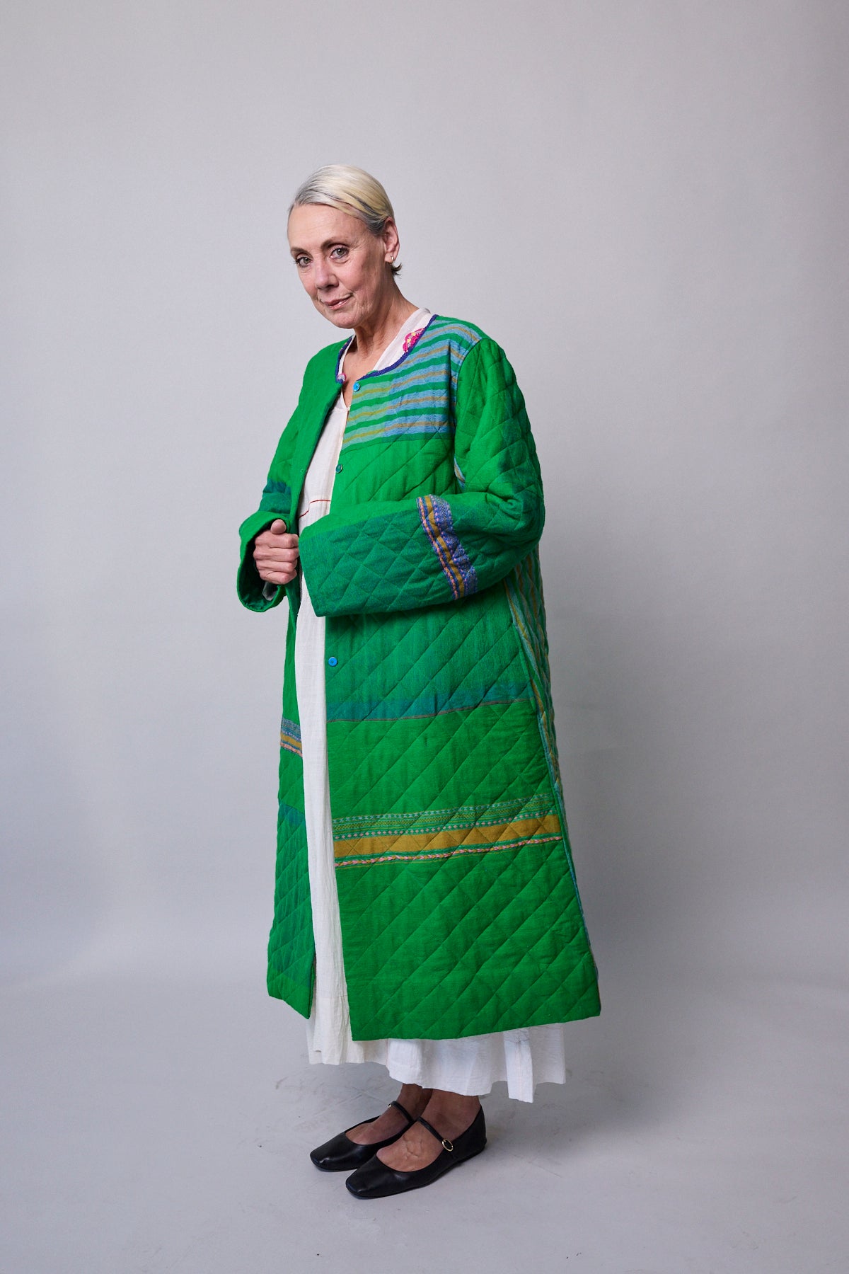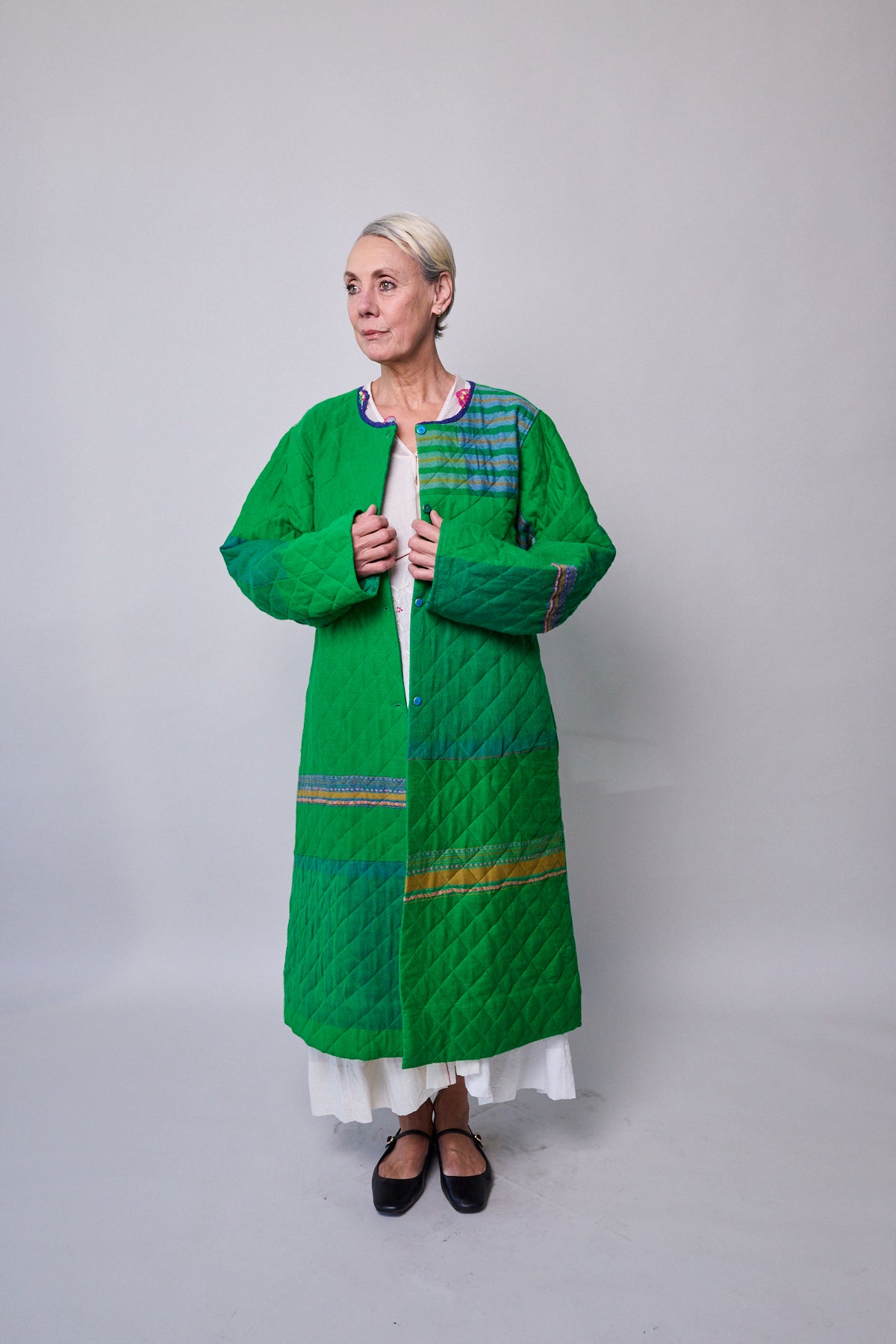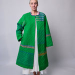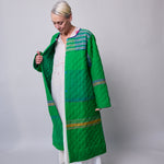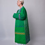 A statement quilted coat handwoven from soft wool and silk. A line with high round neck and front blue and green metallic button closure. Crochet panel with floral detail along neckline. Shades of green with contrast woven stripes and embroidery detail through the garment. Fully lined in luxurious green silk.