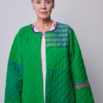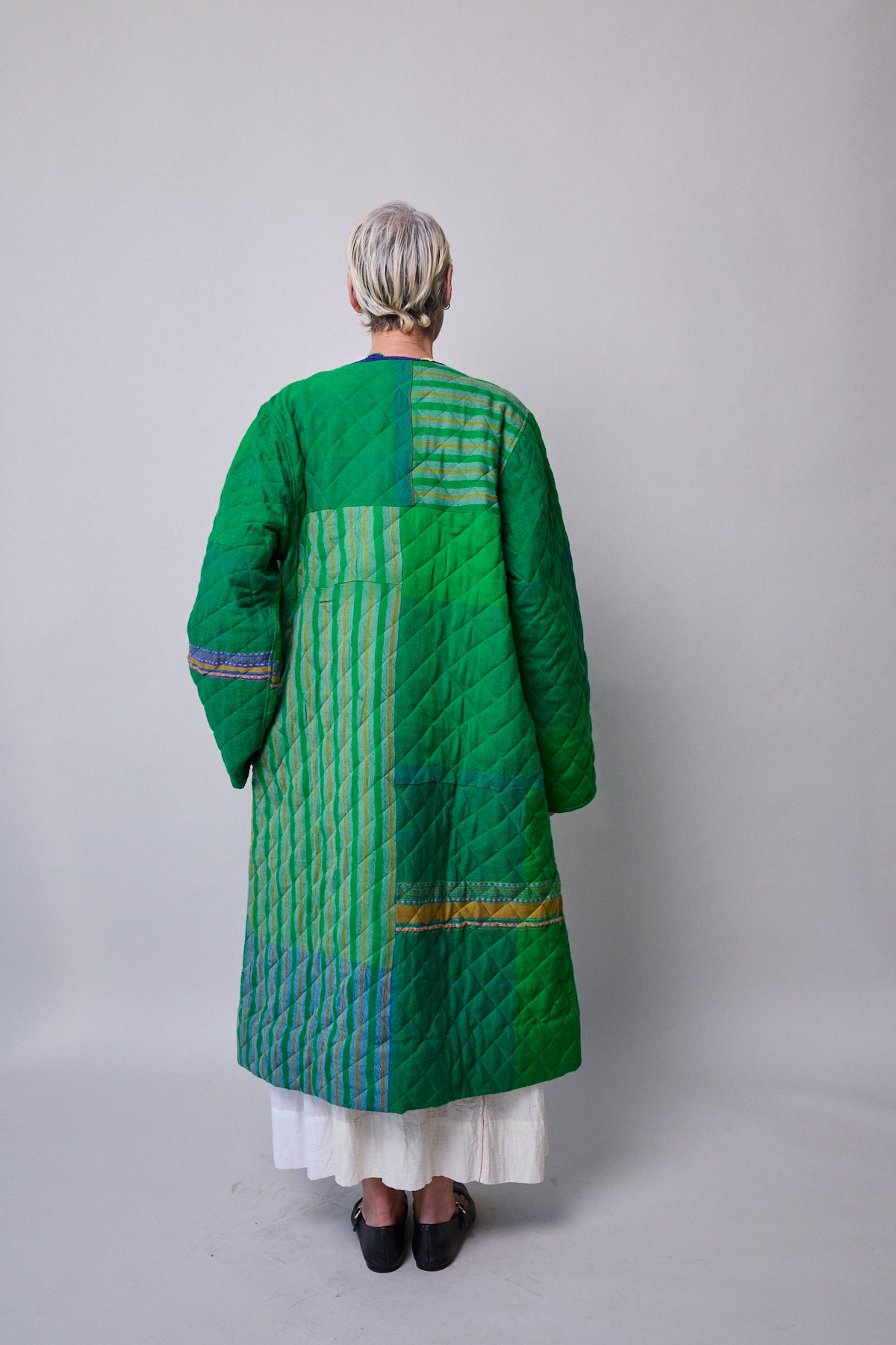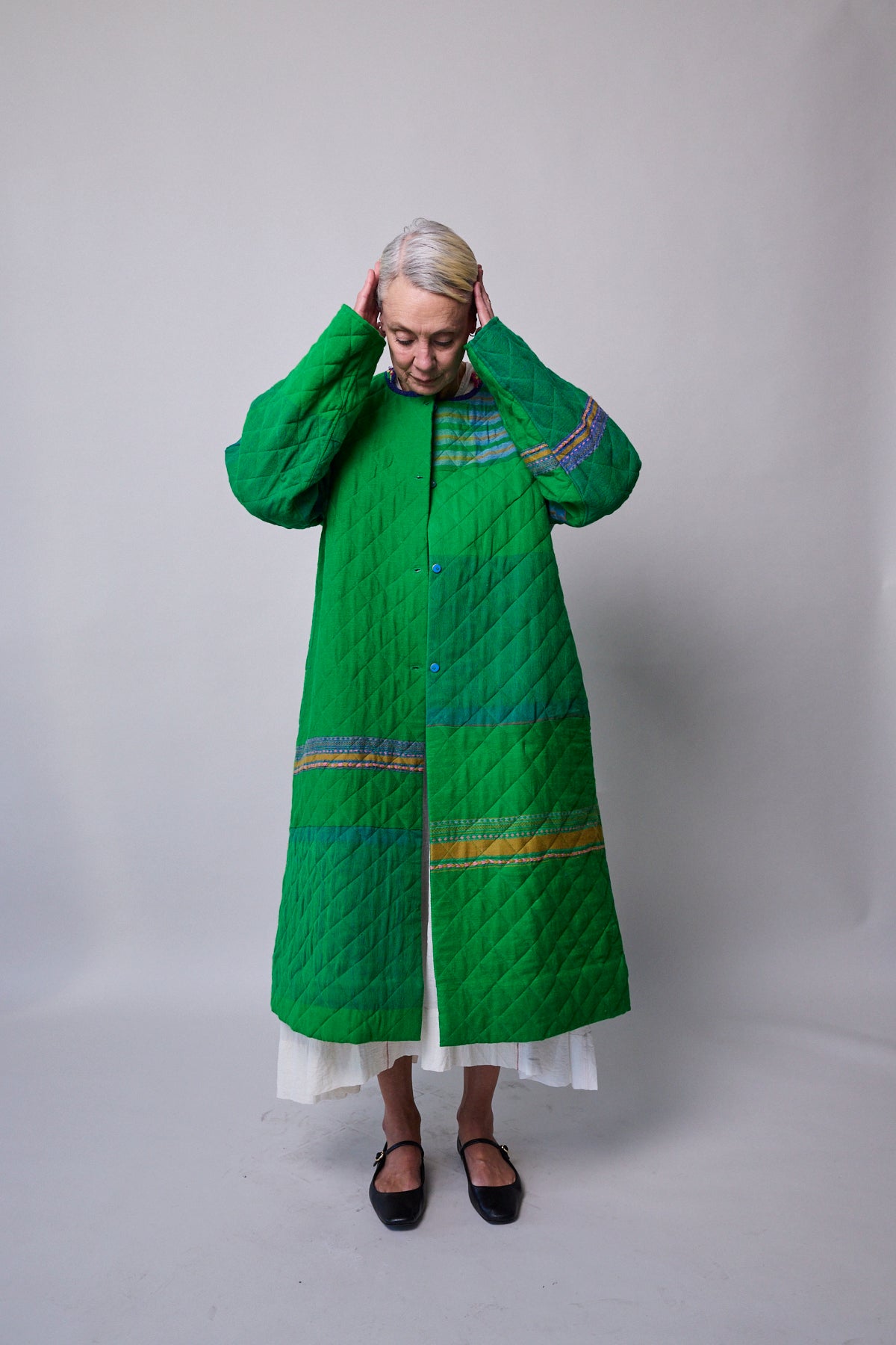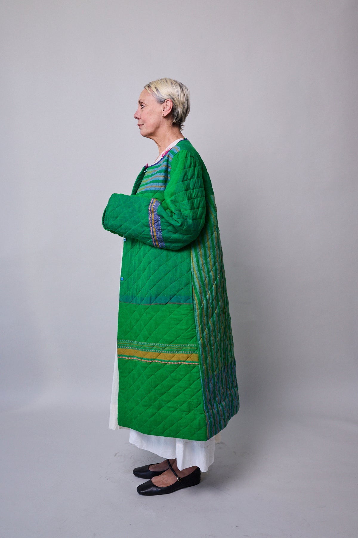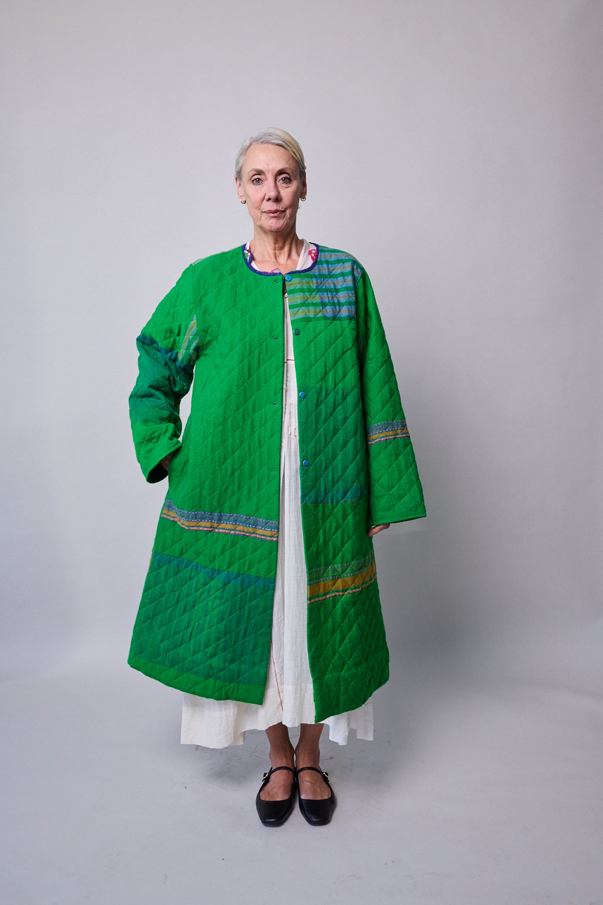 A statement quilted coat handwoven from soft wool and silk. A line with high round neck and front blue and green metallic button closure. Crochet panel with floral detail along neckline. Shades of green with contrast woven stripes and embroidery detail through the garment. Fully lined in luxurious green silk.