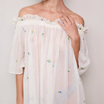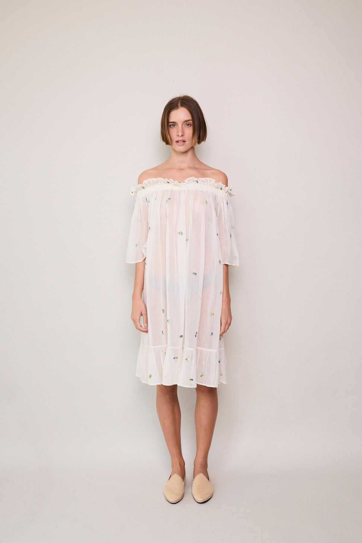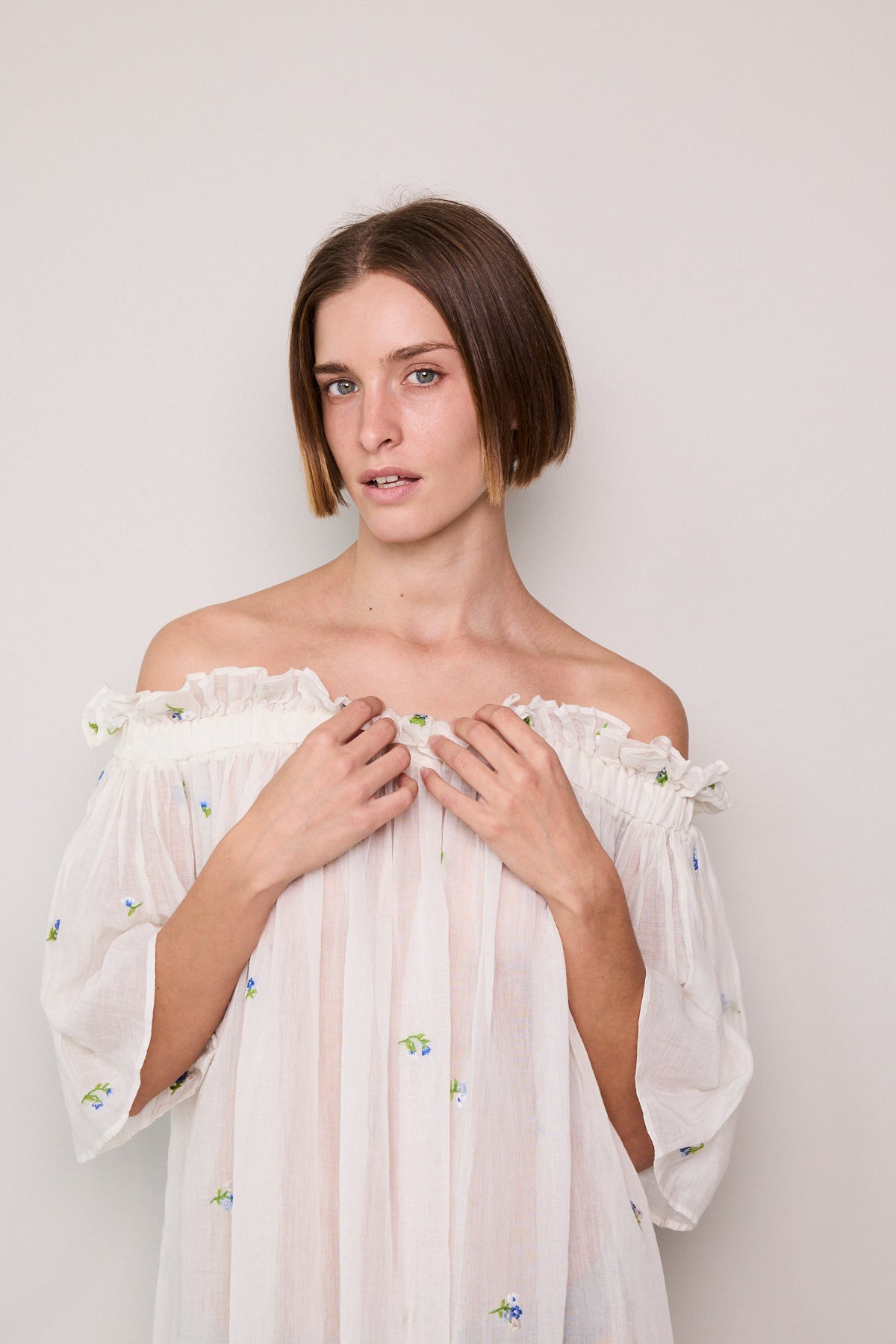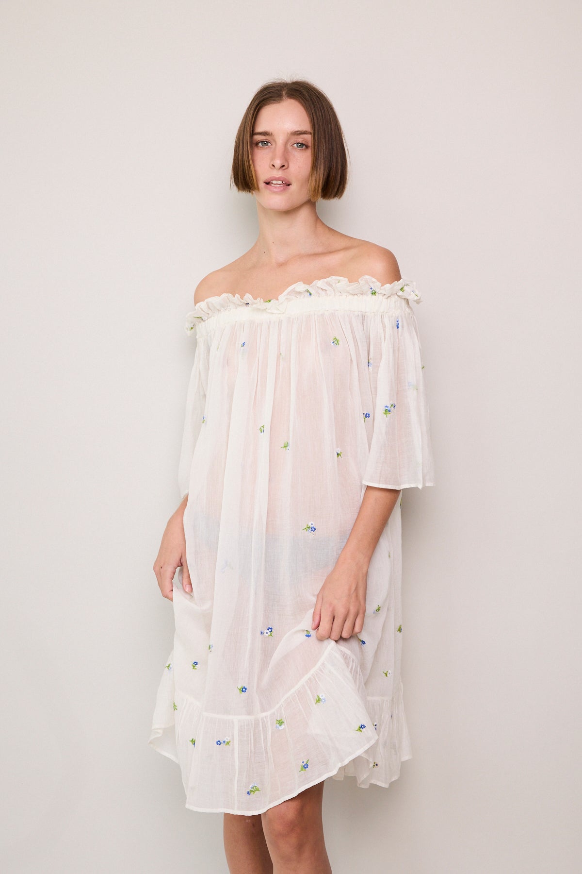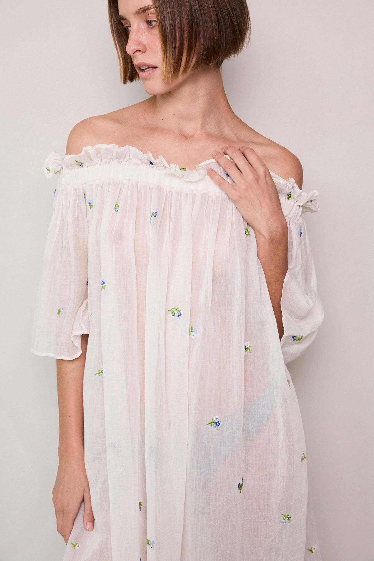 An off shoulder elastic neck dress with top frill detail. A sheer finish with delicate hand embroidered floral bouquets through the dress. Short sleeves. Pleated panel along hemline.