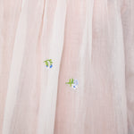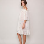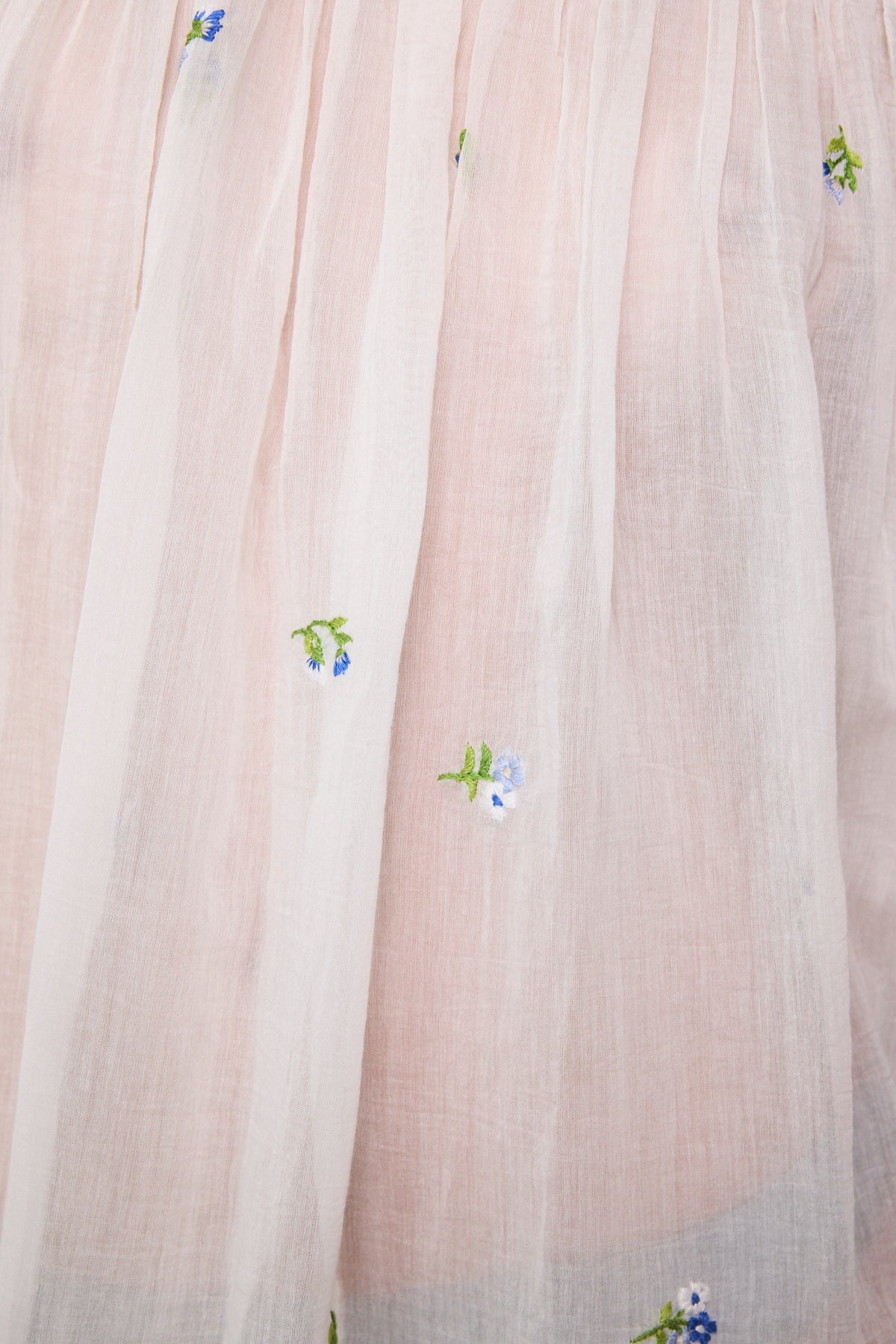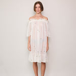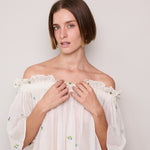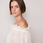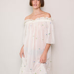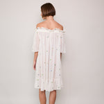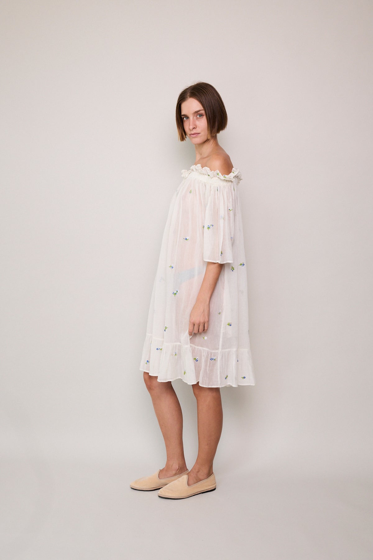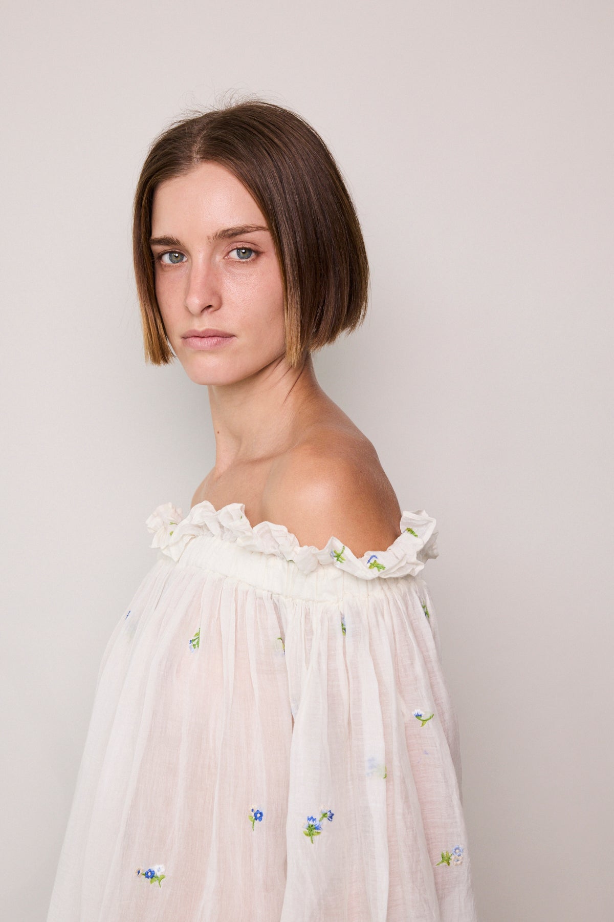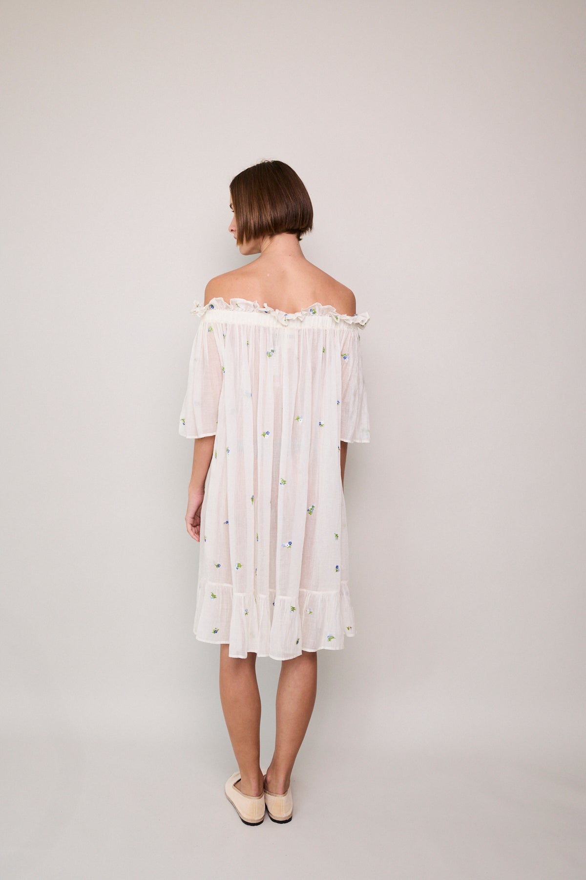 An off shoulder elastic neck dress with top frill detail. A sheer finish with delicate hand embroidered floral bouquets through the dress. Short sleeves. Pleated panel along hemline.