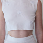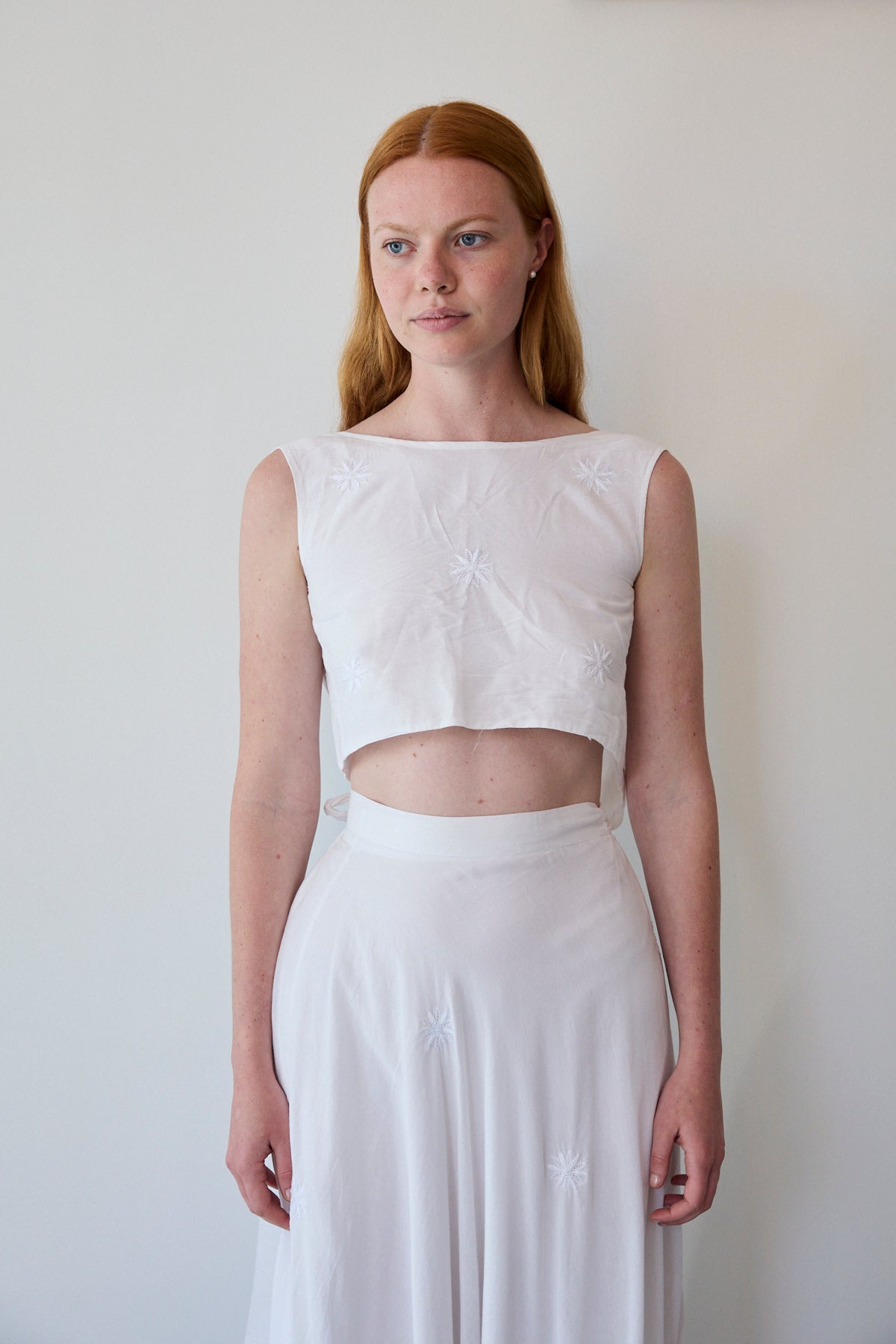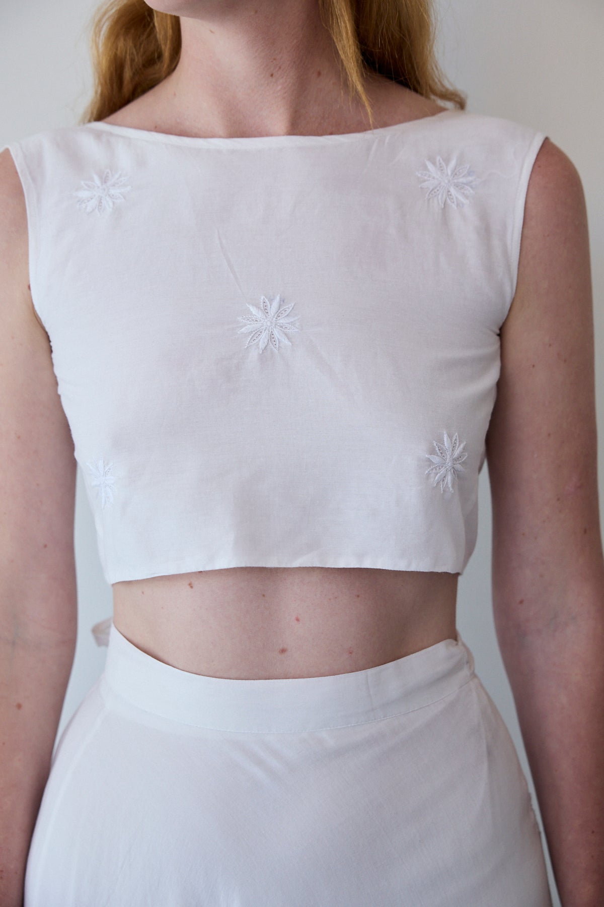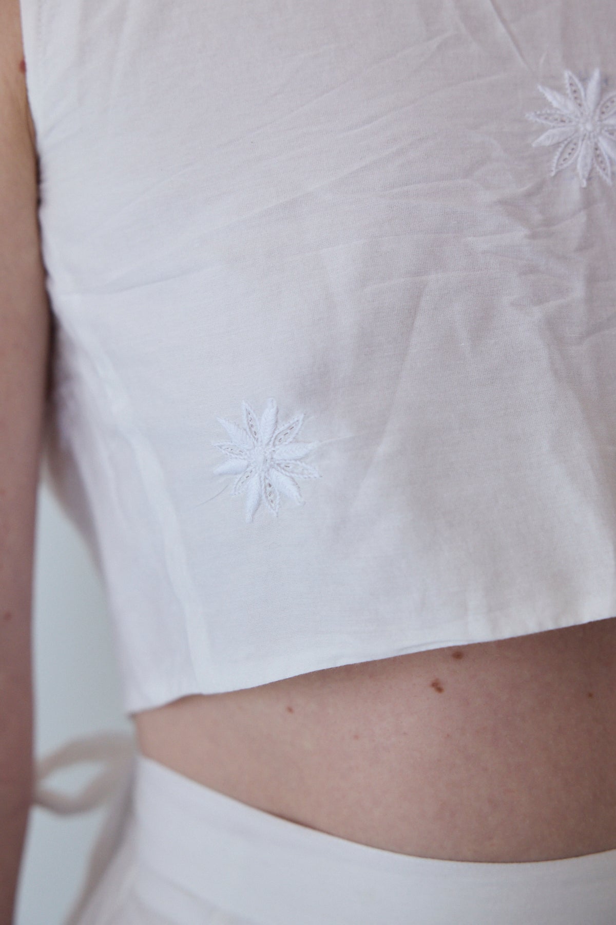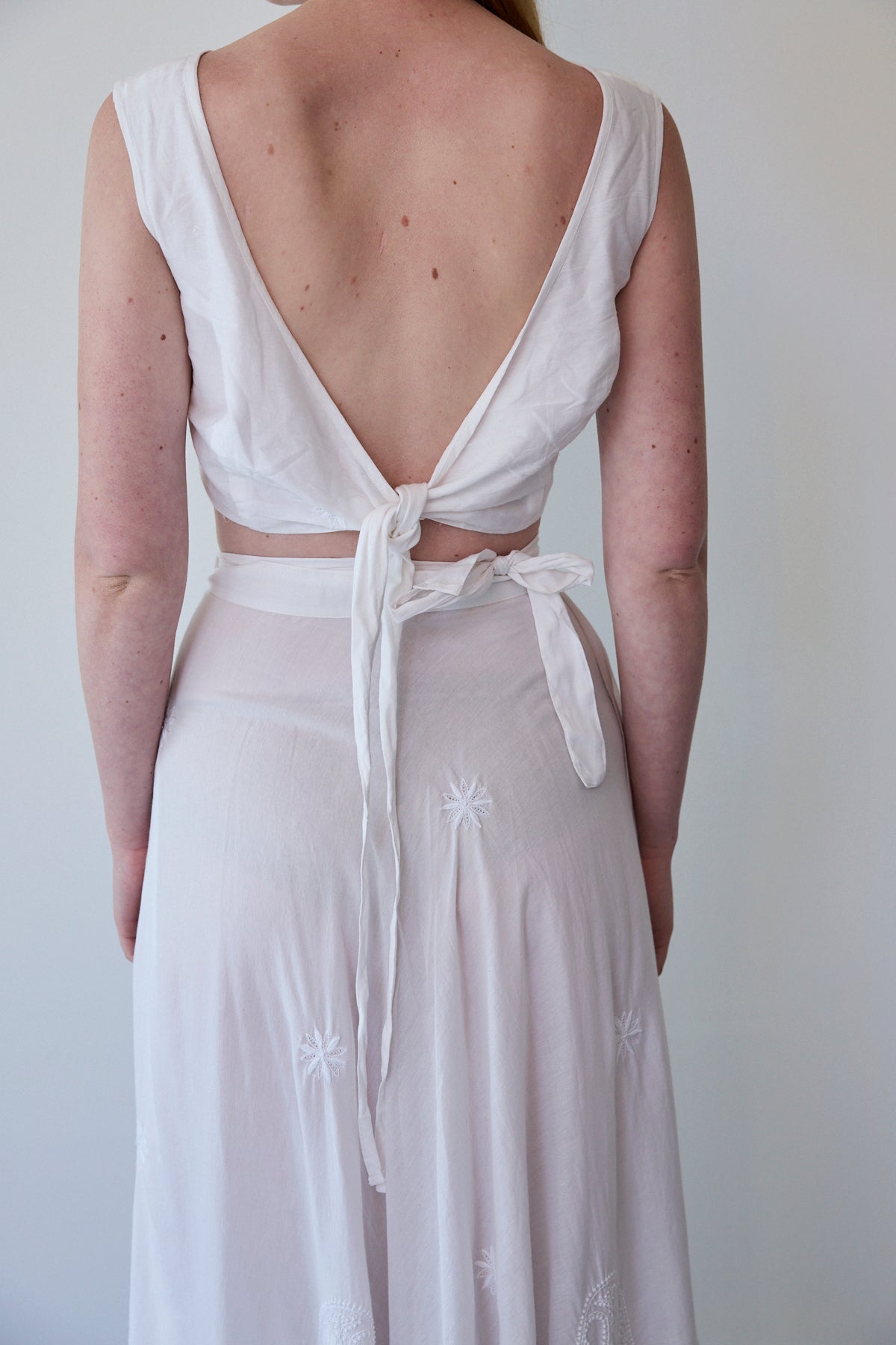 A sleeveless cropped wrap blouse in cotton silk. Features detailed chikan hand embroidery through. Embroidery by artisans in Lucknow. A soft and sheer finish. Ties for fastening.