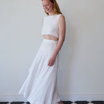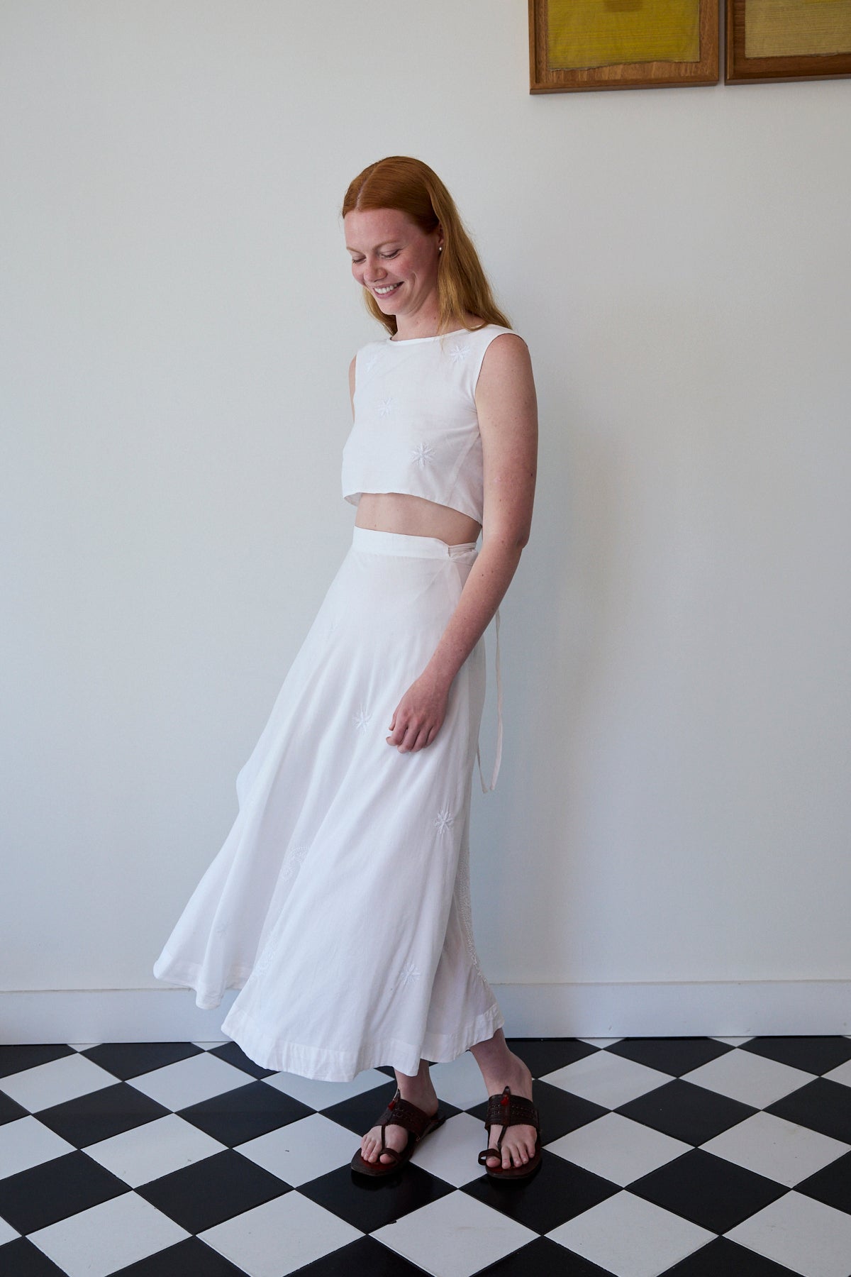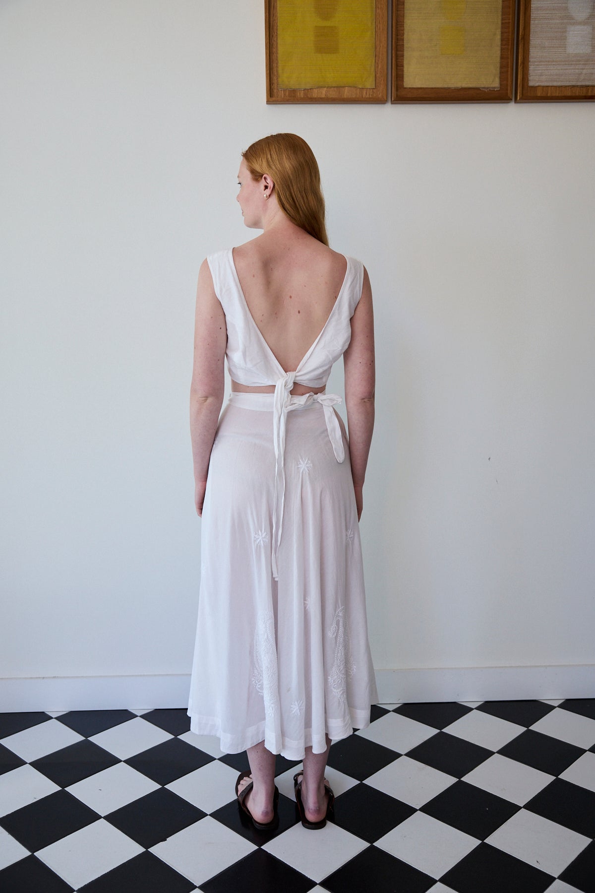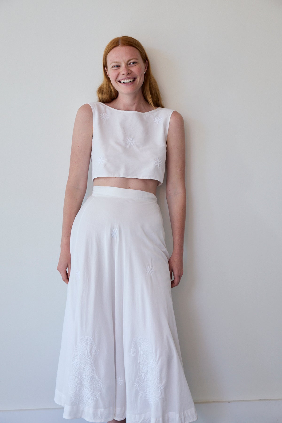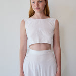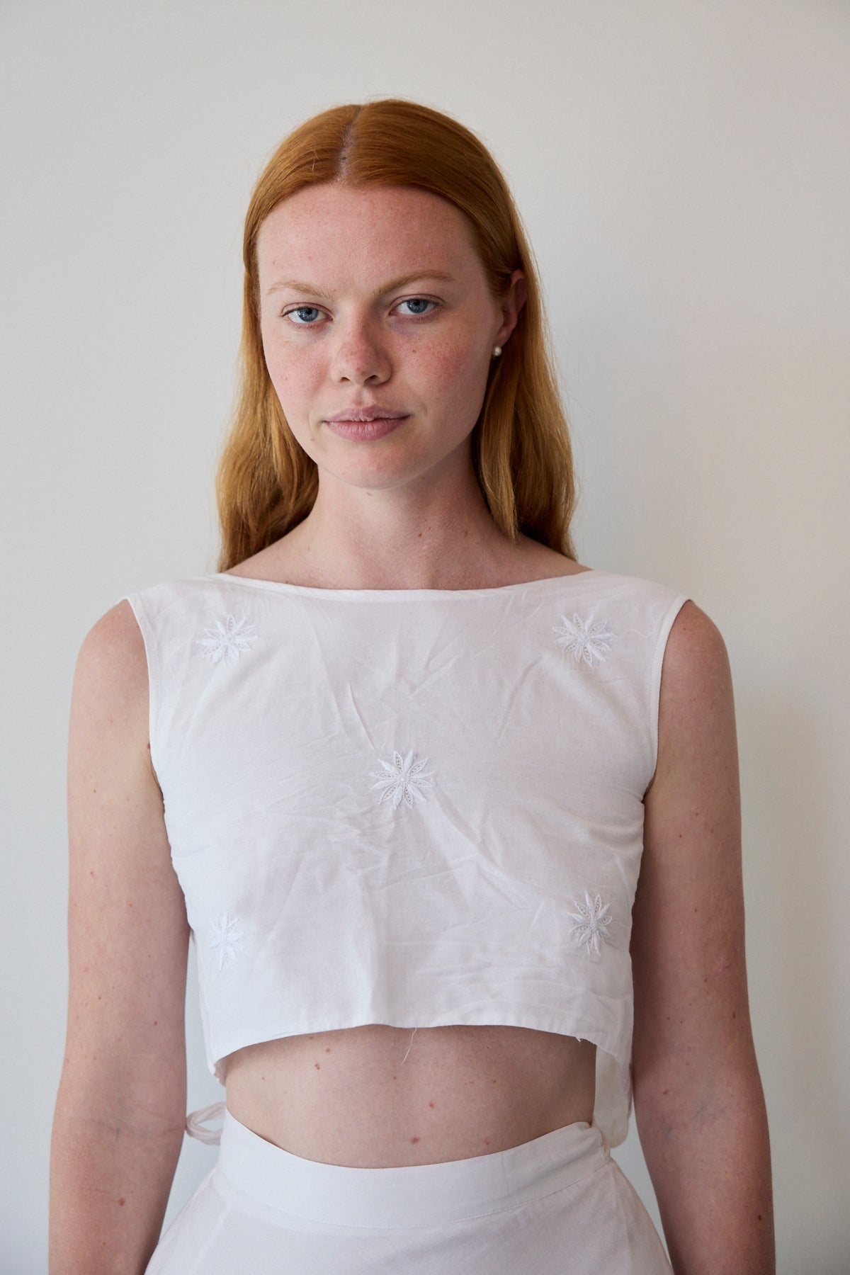 A sleeveless cropped wrap blouse in cotton silk. Features detailed chikan hand embroidery through. Embroidery by artisans in Lucknow. A soft and sheer finish. Ties for fastening.