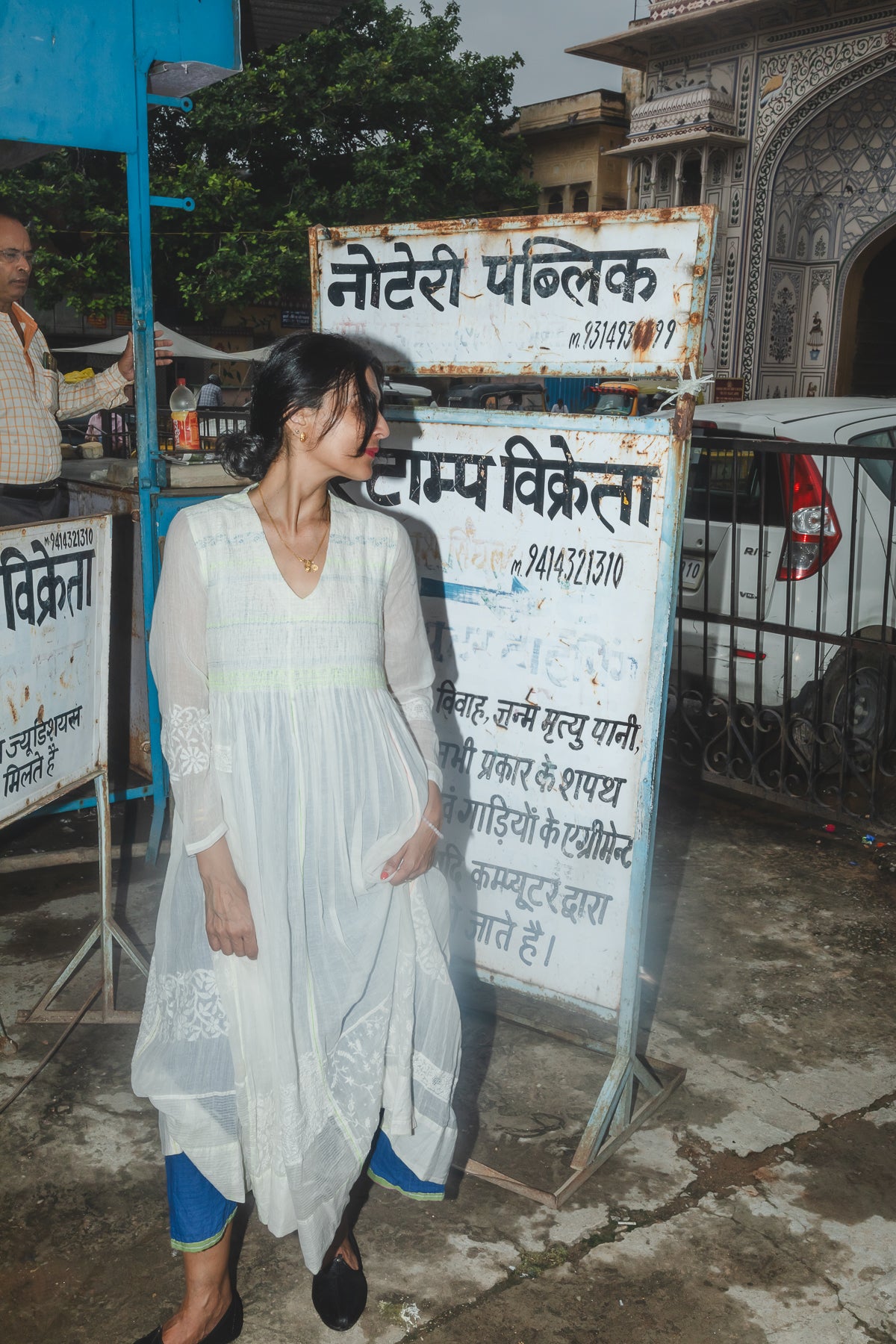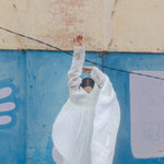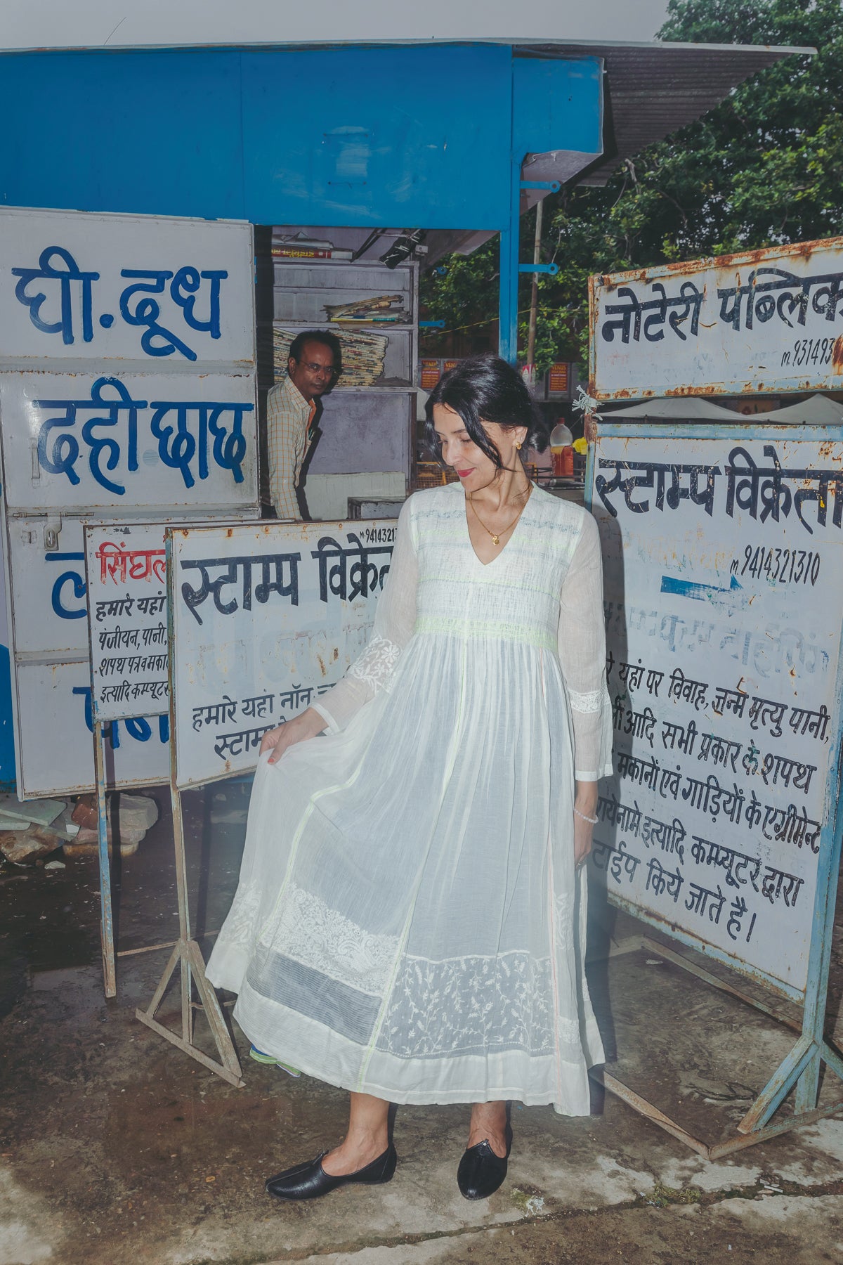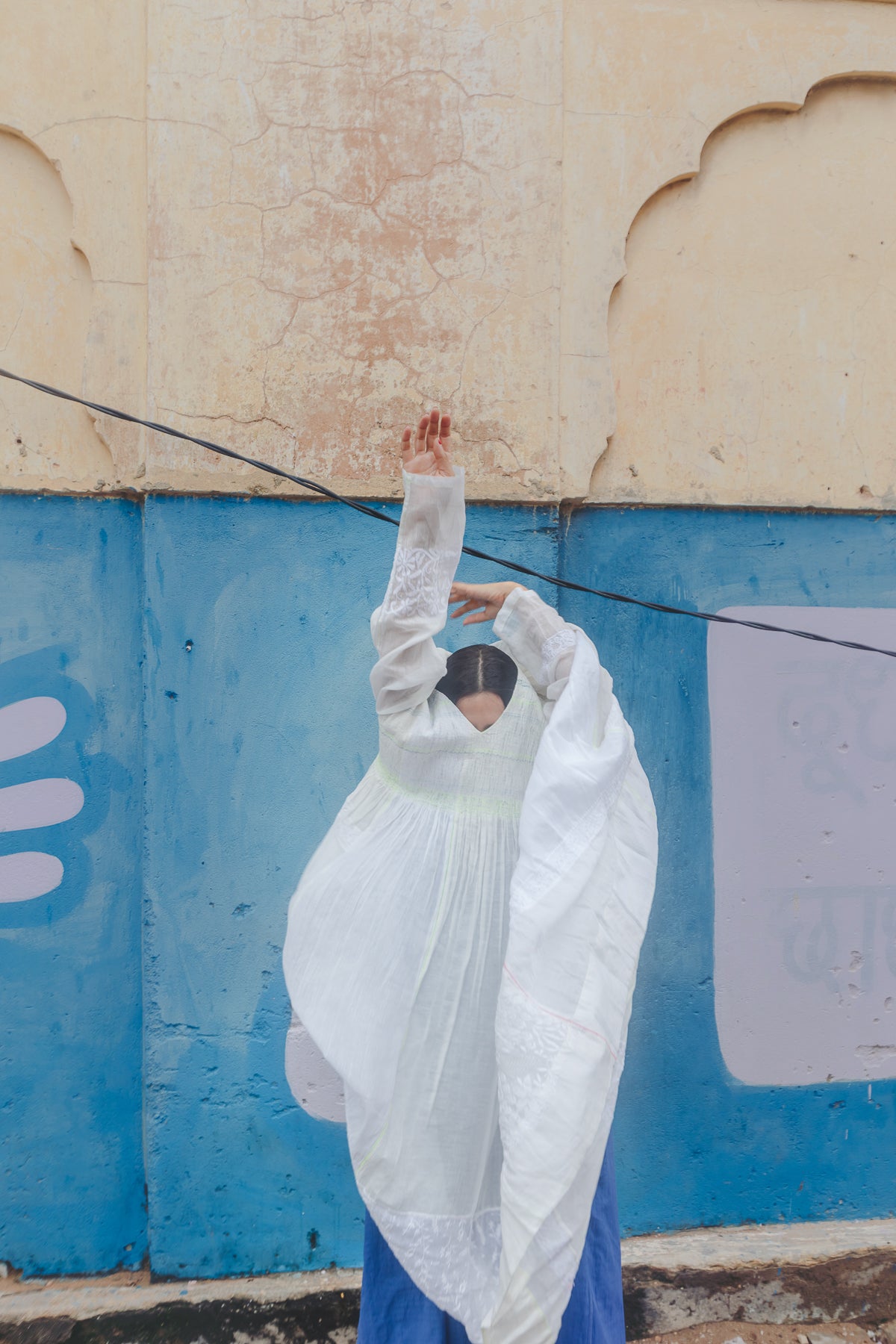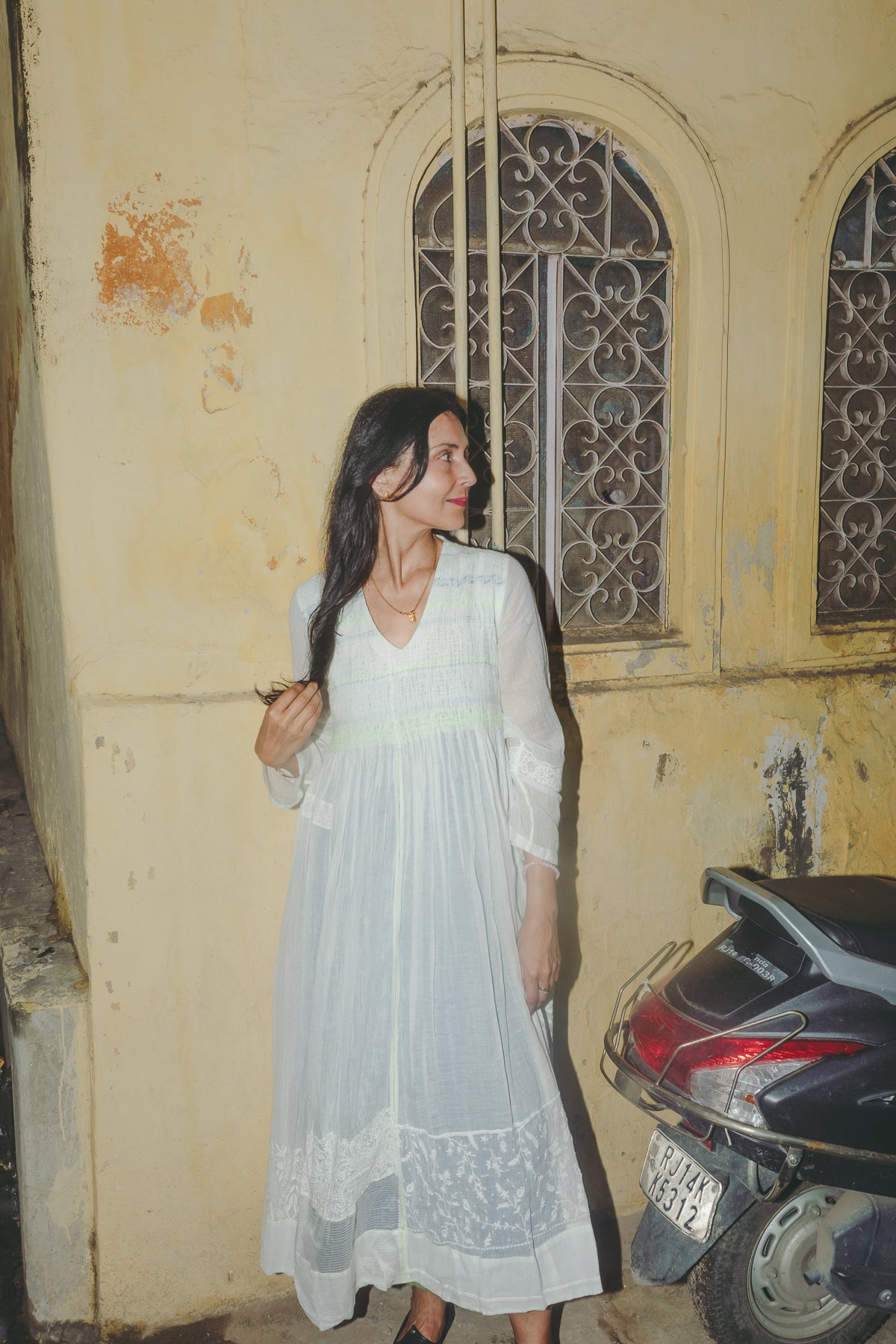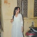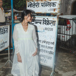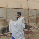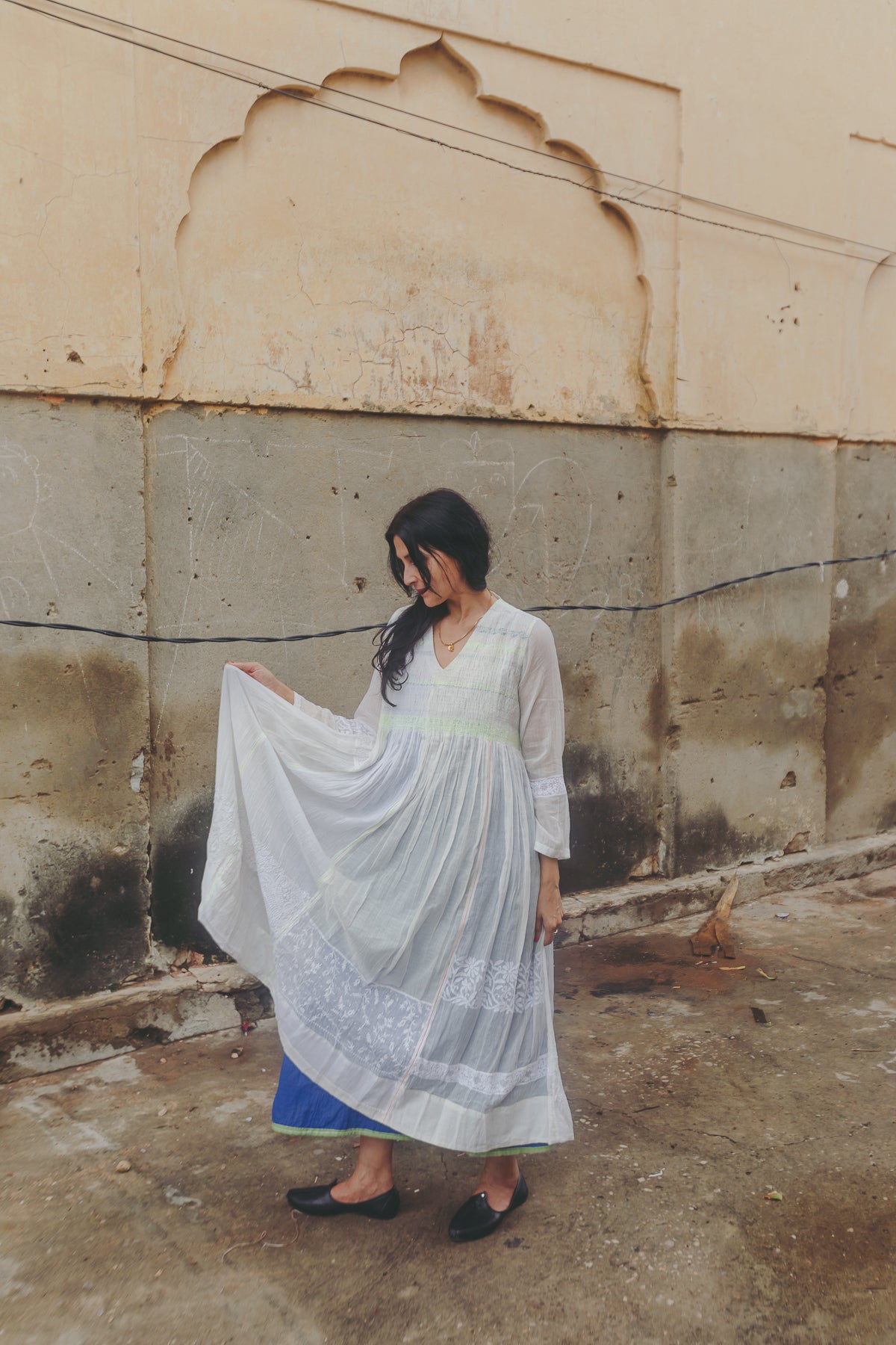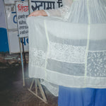 An intricately made handwoven cotton dress. Features a front V-neck with lime green and blue embroidery smocking on bodice. Detailed chikan hand-embroidery panels along front and back, sides and sleeve in white. Interlock embroidery through the dress and sleeves. Side slit pockets. Maxi length. Sheer finish.