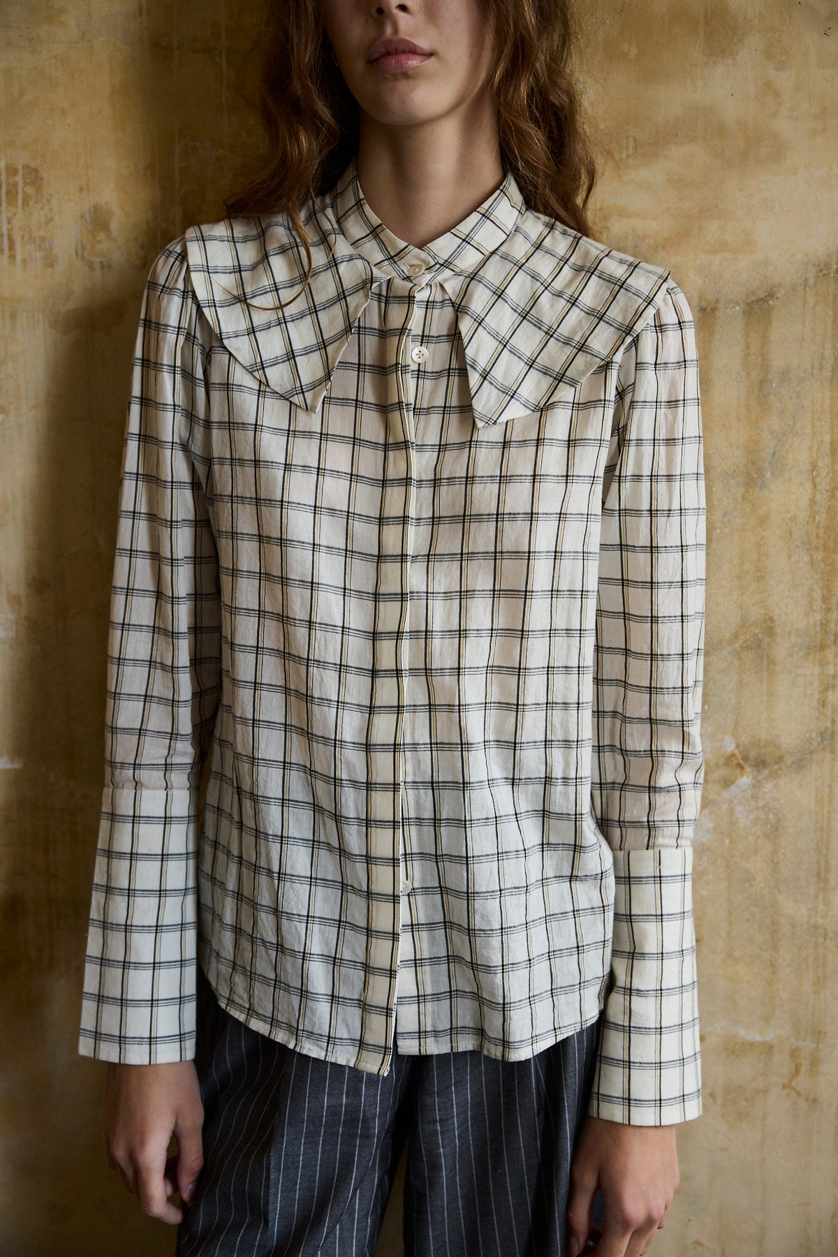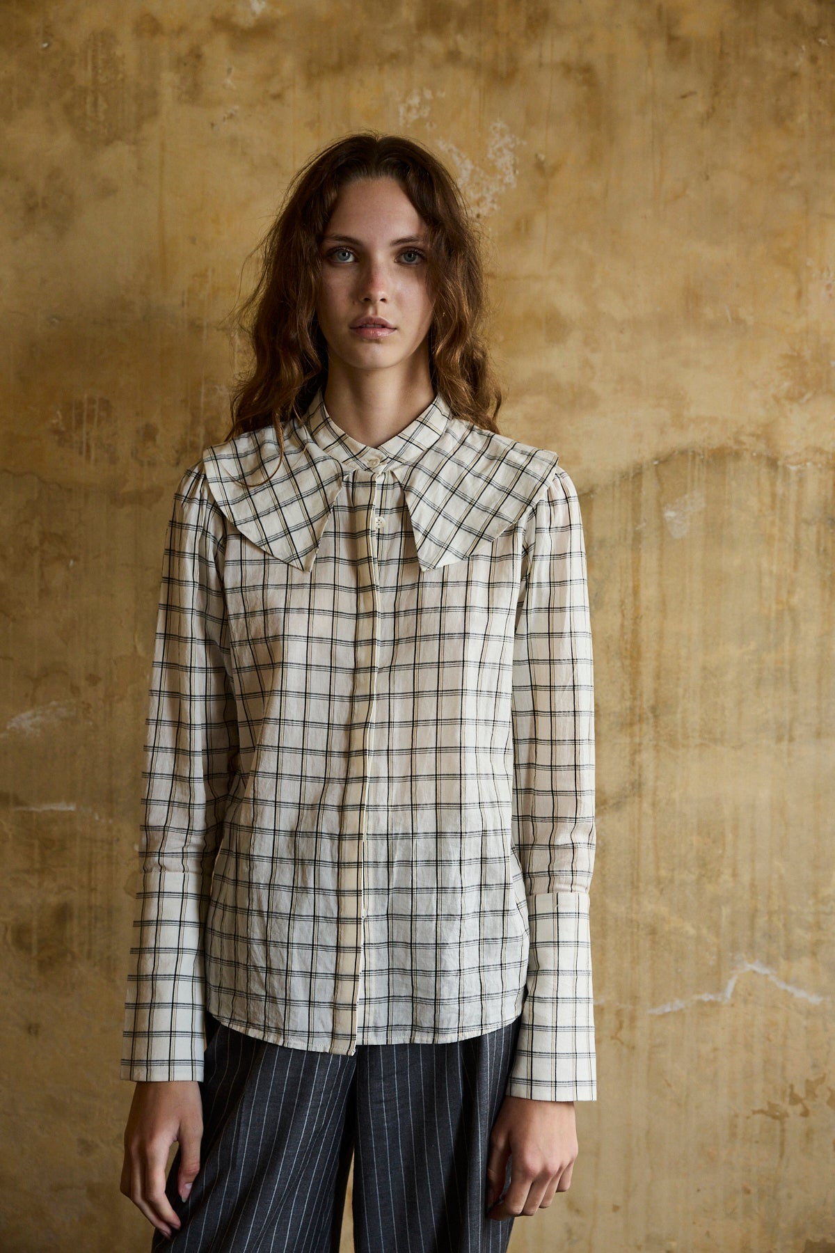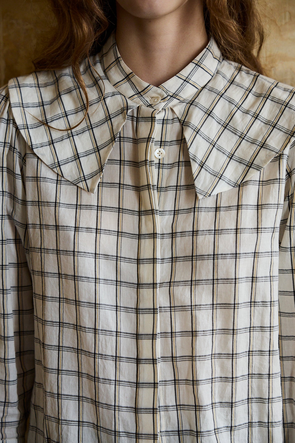 A tailored shirt in handloom light weight cotton, featuring classic woven checks through the fabric. An exaggerated collar with high neck and front hidden placket and pearl button closure. Exaggerated cuffs with triple button closure. Pleats on shoulder.