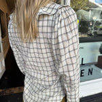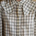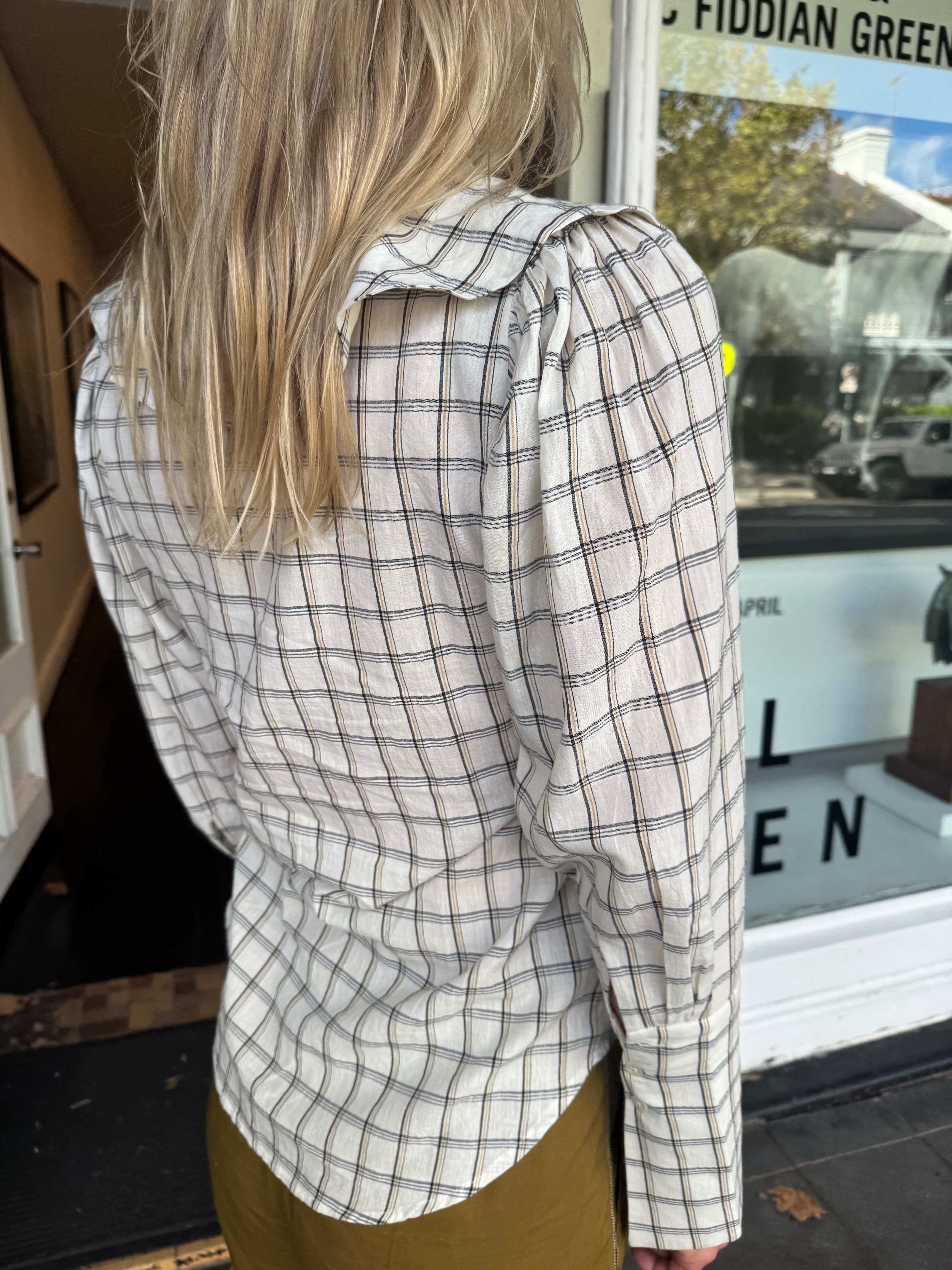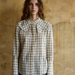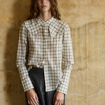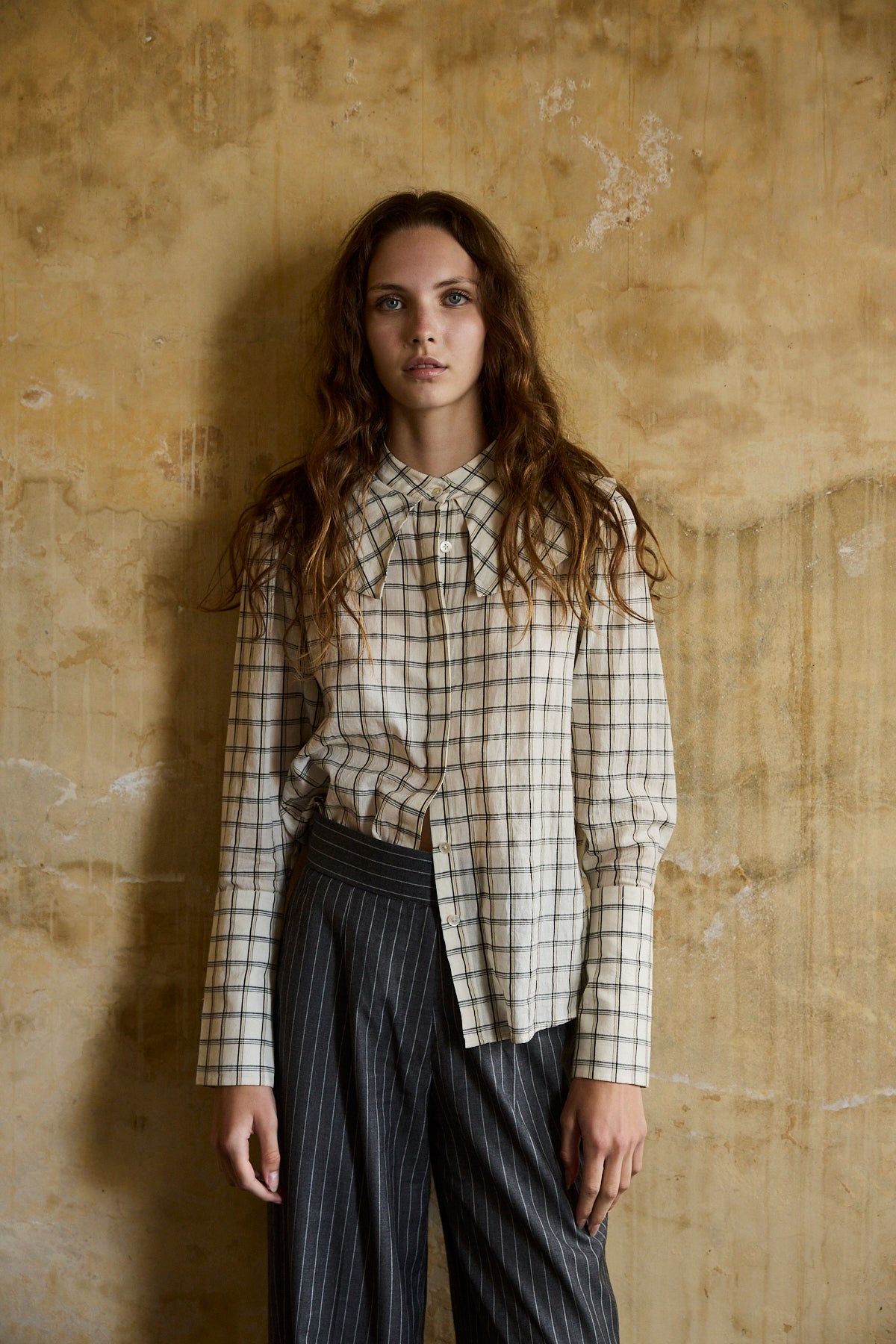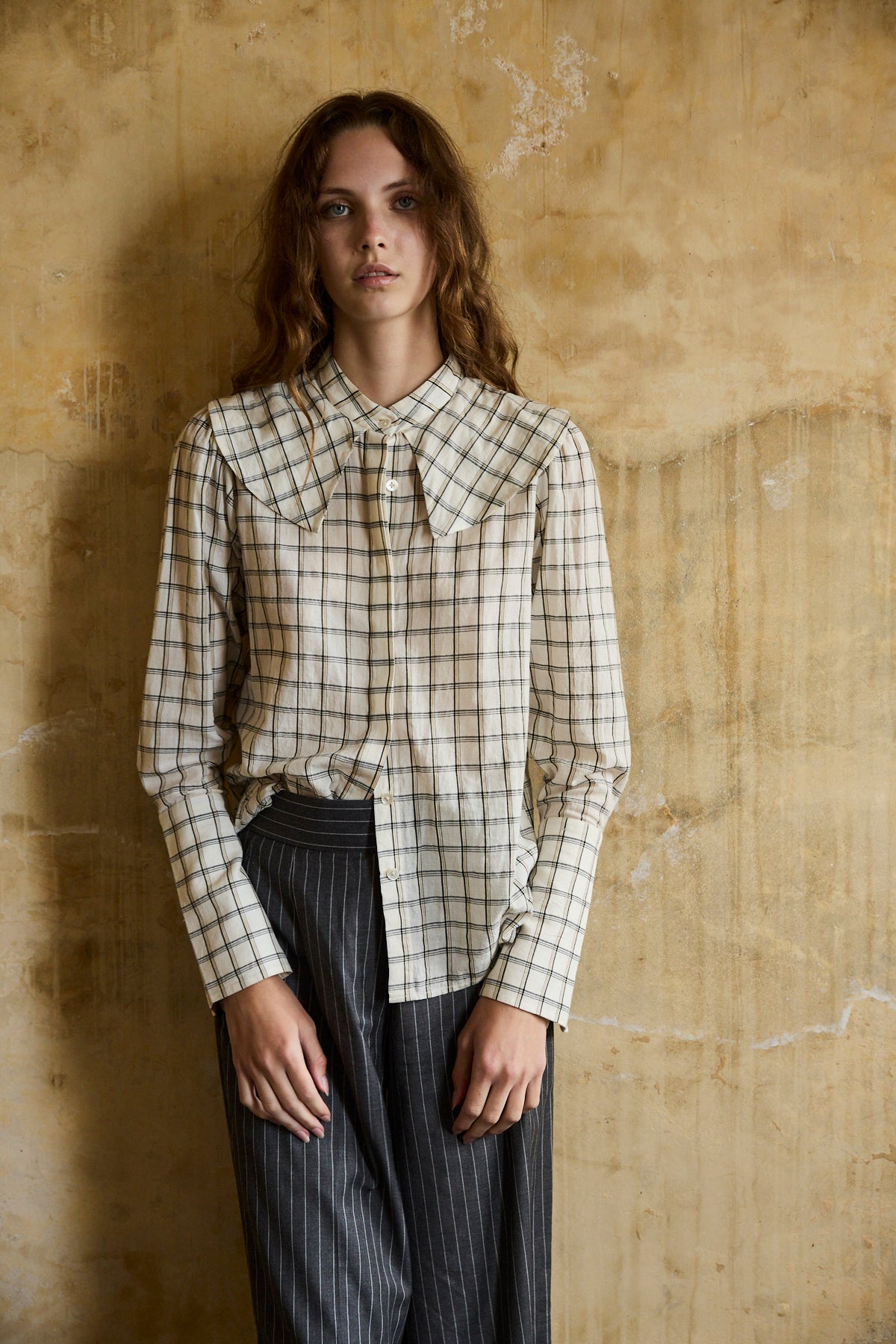 A tailored shirt in handloom light weight cotton, featuring classic woven checks through the fabric. An exaggerated collar with high neck and front hidden placket and pearl button closure. Exaggerated cuffs with triple button closure. Pleats on shoulder.