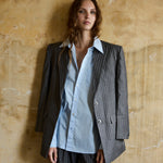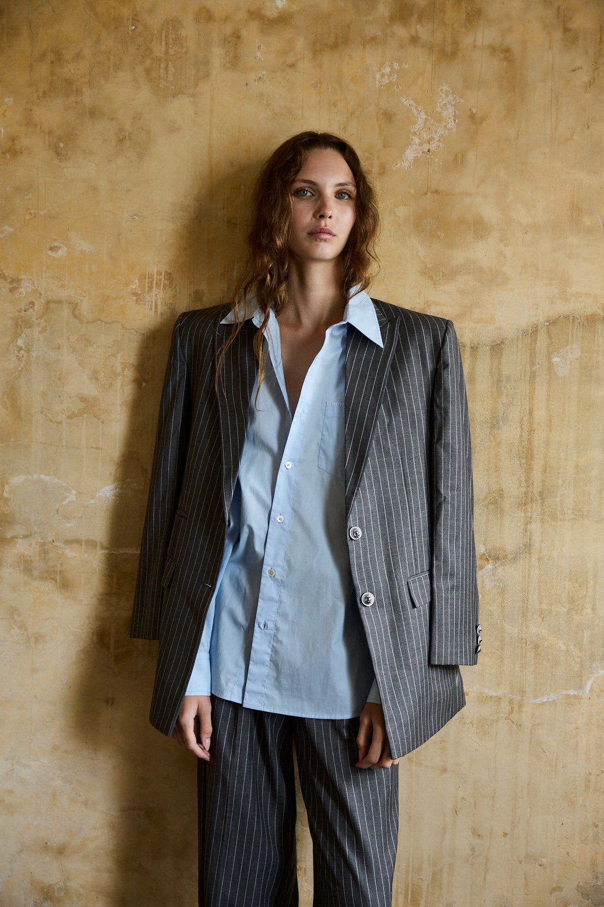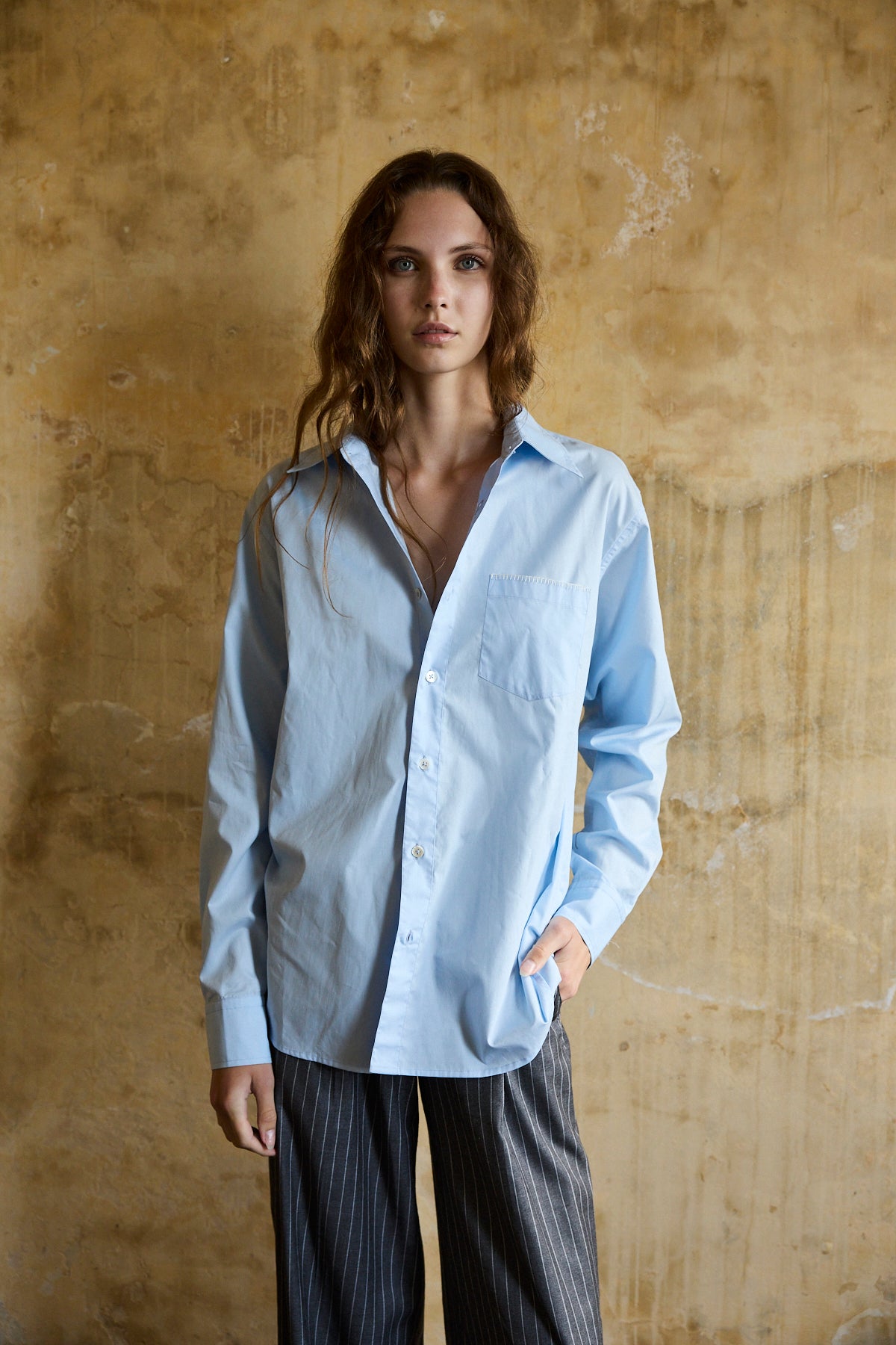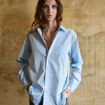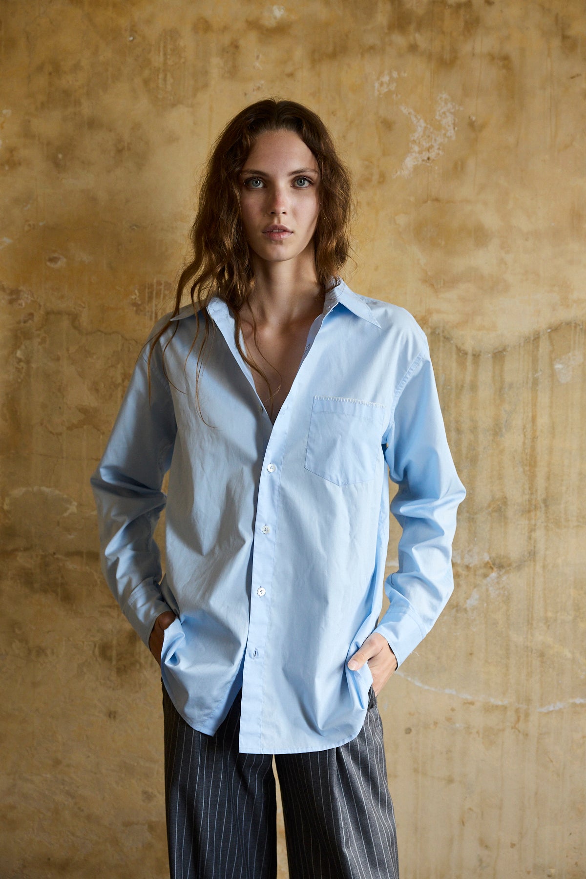 A tailored shirt in cotton poplin. Featuring button up front with collar. Single pocket on front left with ivory blanket stitch detail. Cuff with single button closure. Pearl buttons.