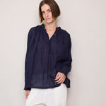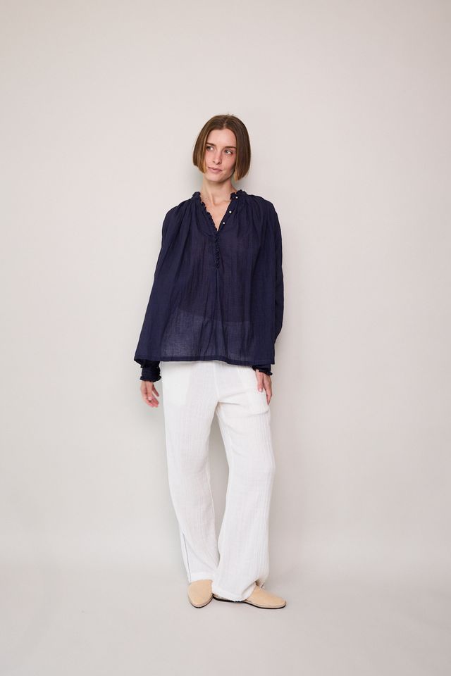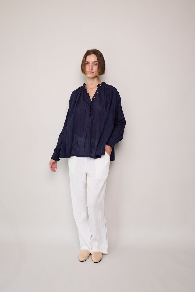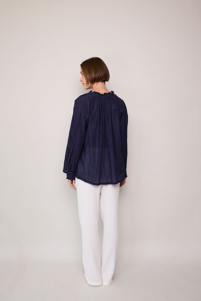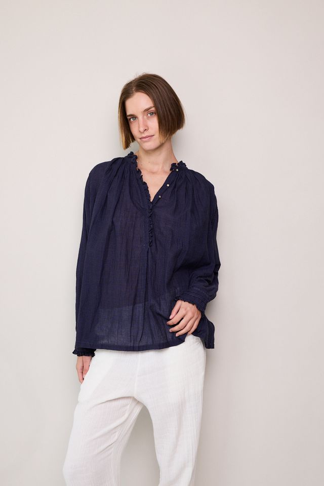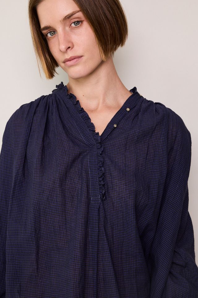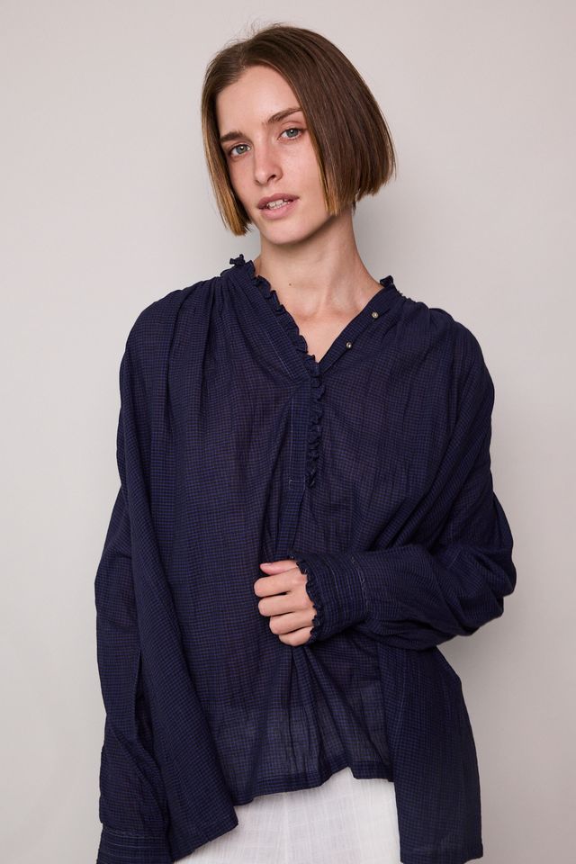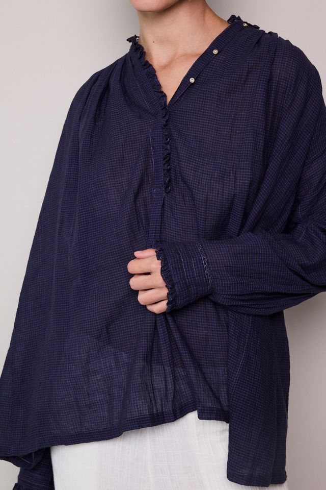 A loose fit, soft handloom cotton shirt. Features a high frill neck and frill button up front with silver hardware. Navy base with electric blue checkered pattern through the shirt. Long sleeves with double cuff frill and pleat detail.  Soft pleats along front and back.