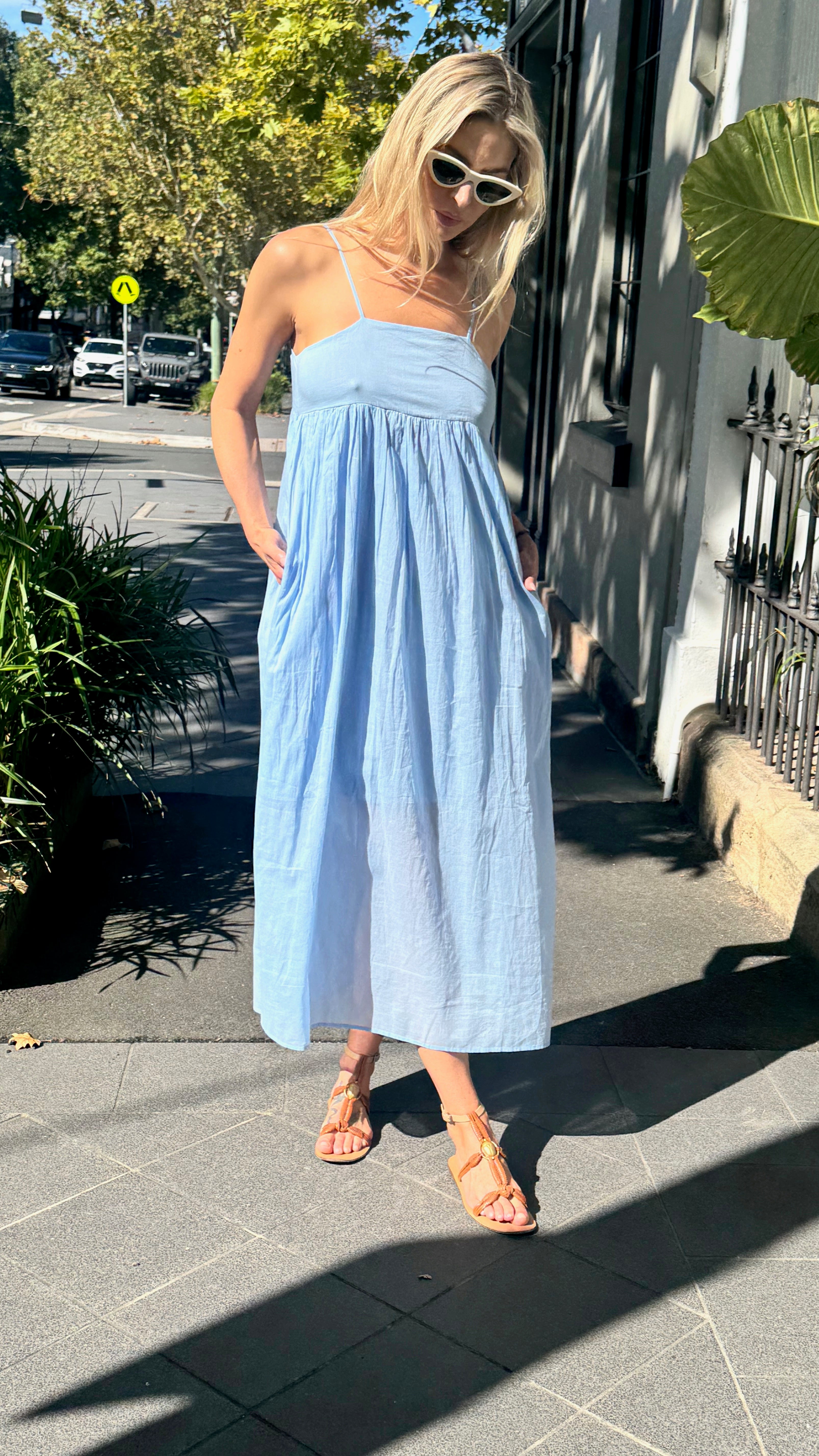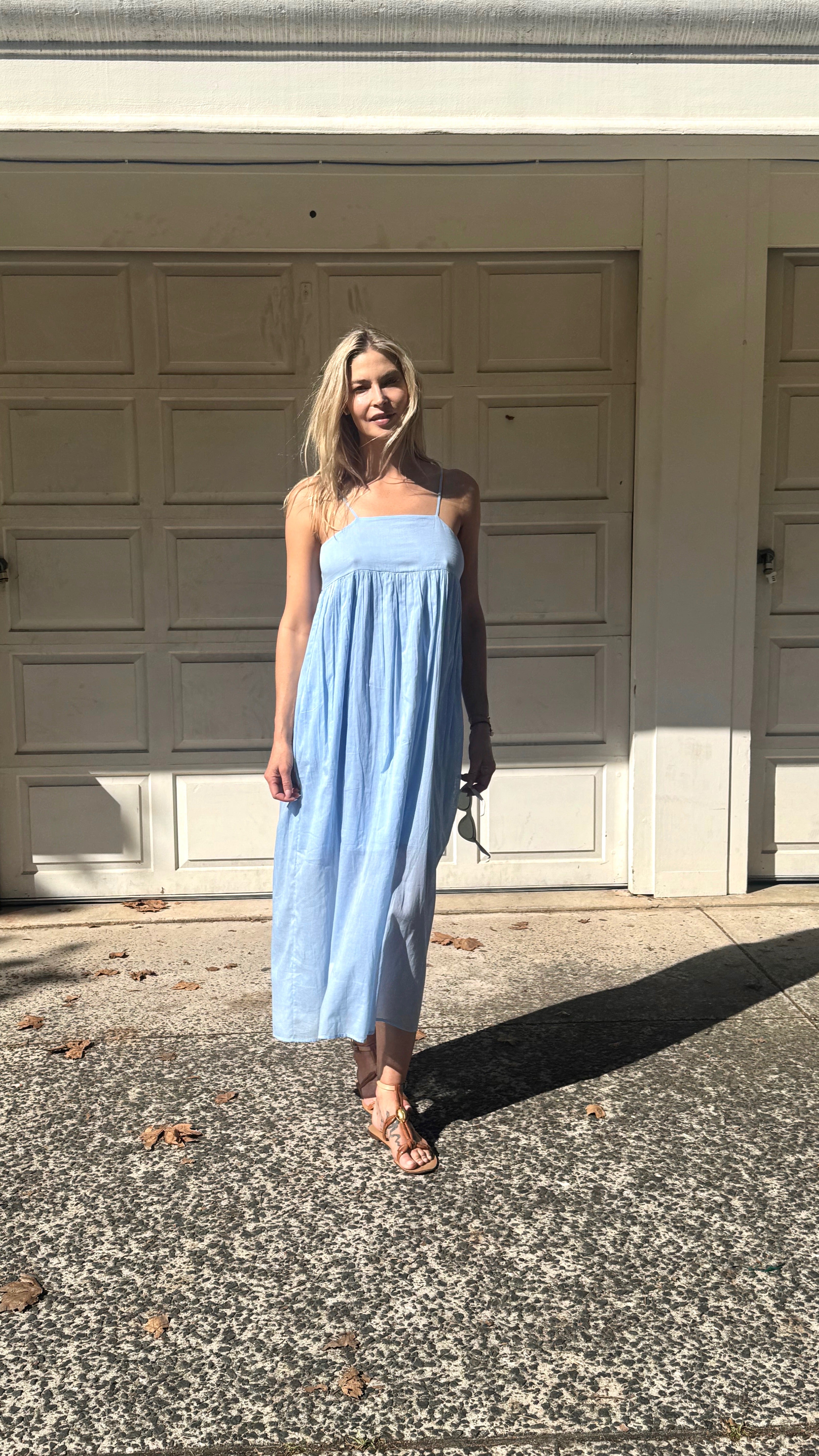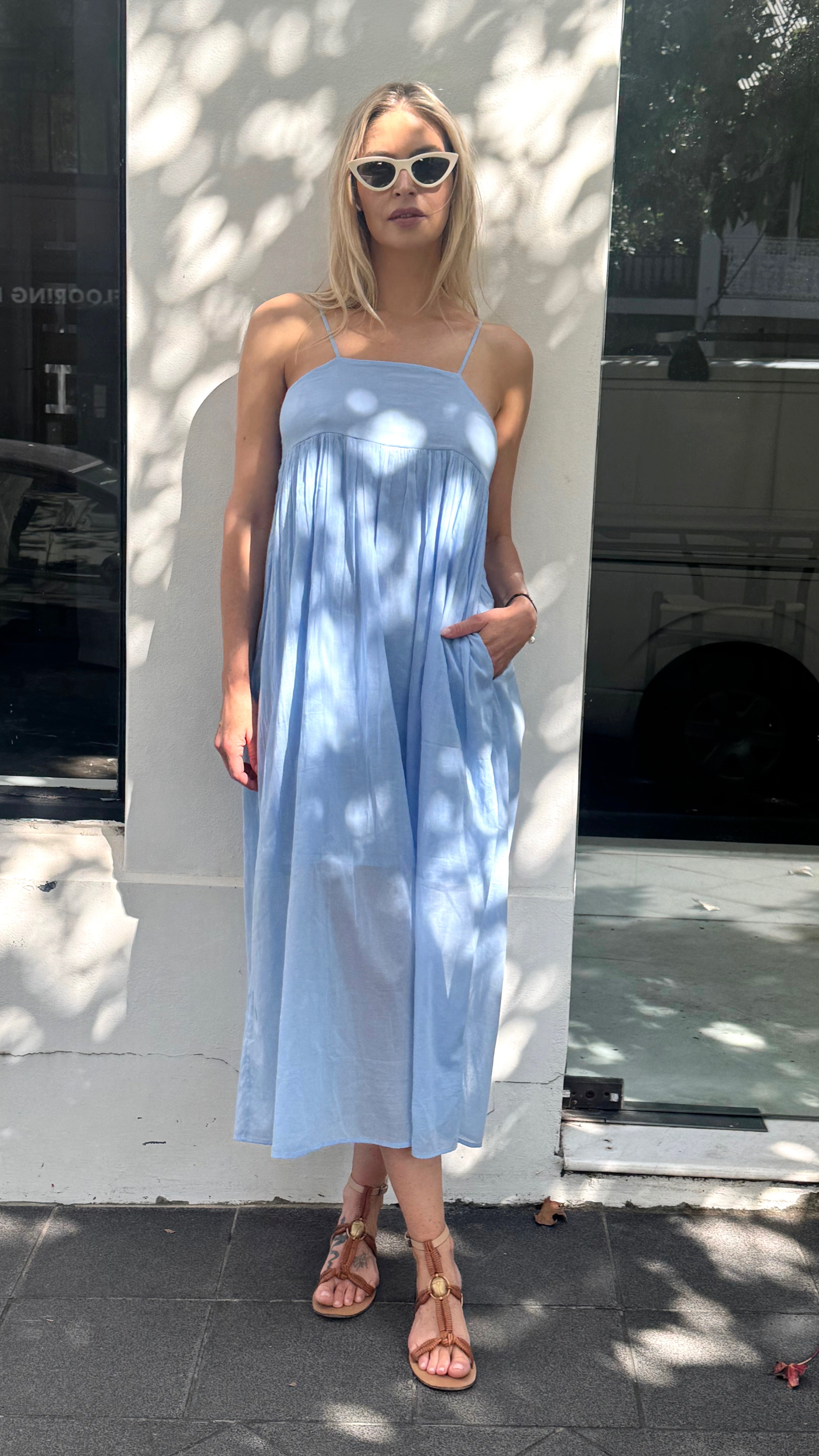 A babydoll style slip dress. Adjustable straps with back tie for fastening. Ruching detail below fitted bodice on the front and back. Fully lined in cotton. A loose, soft fit. Side pockets.