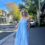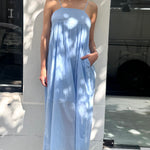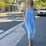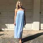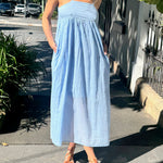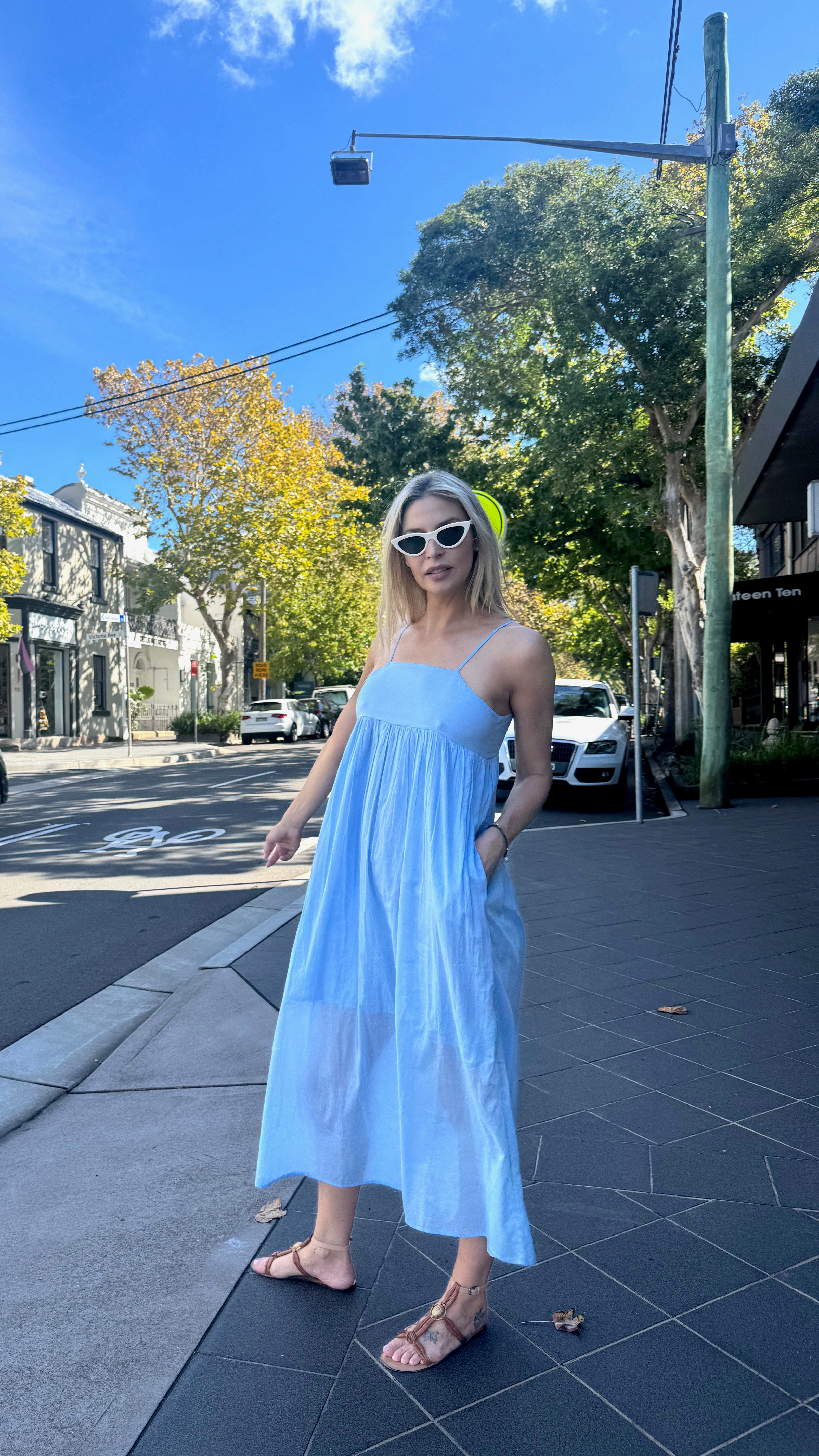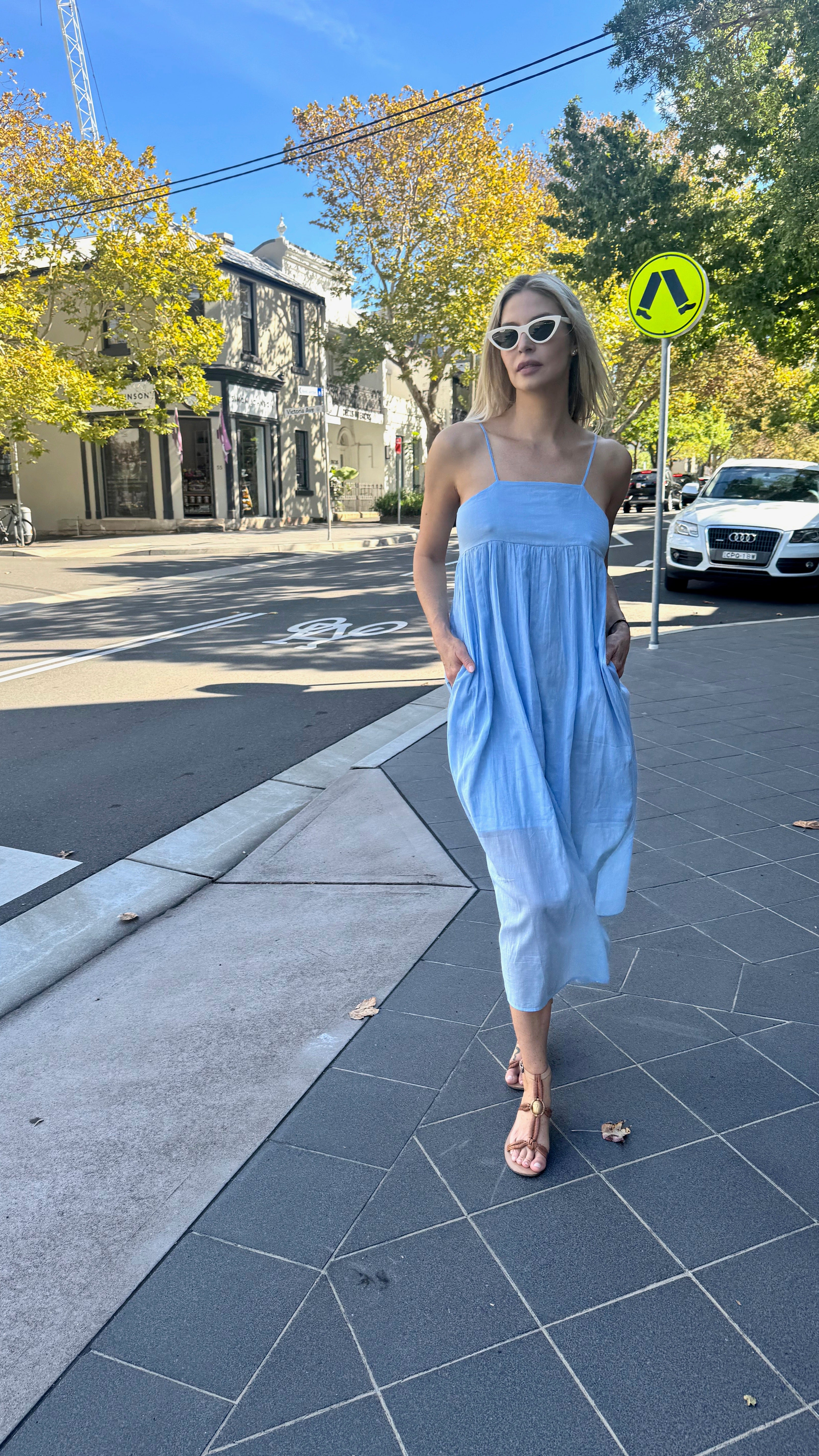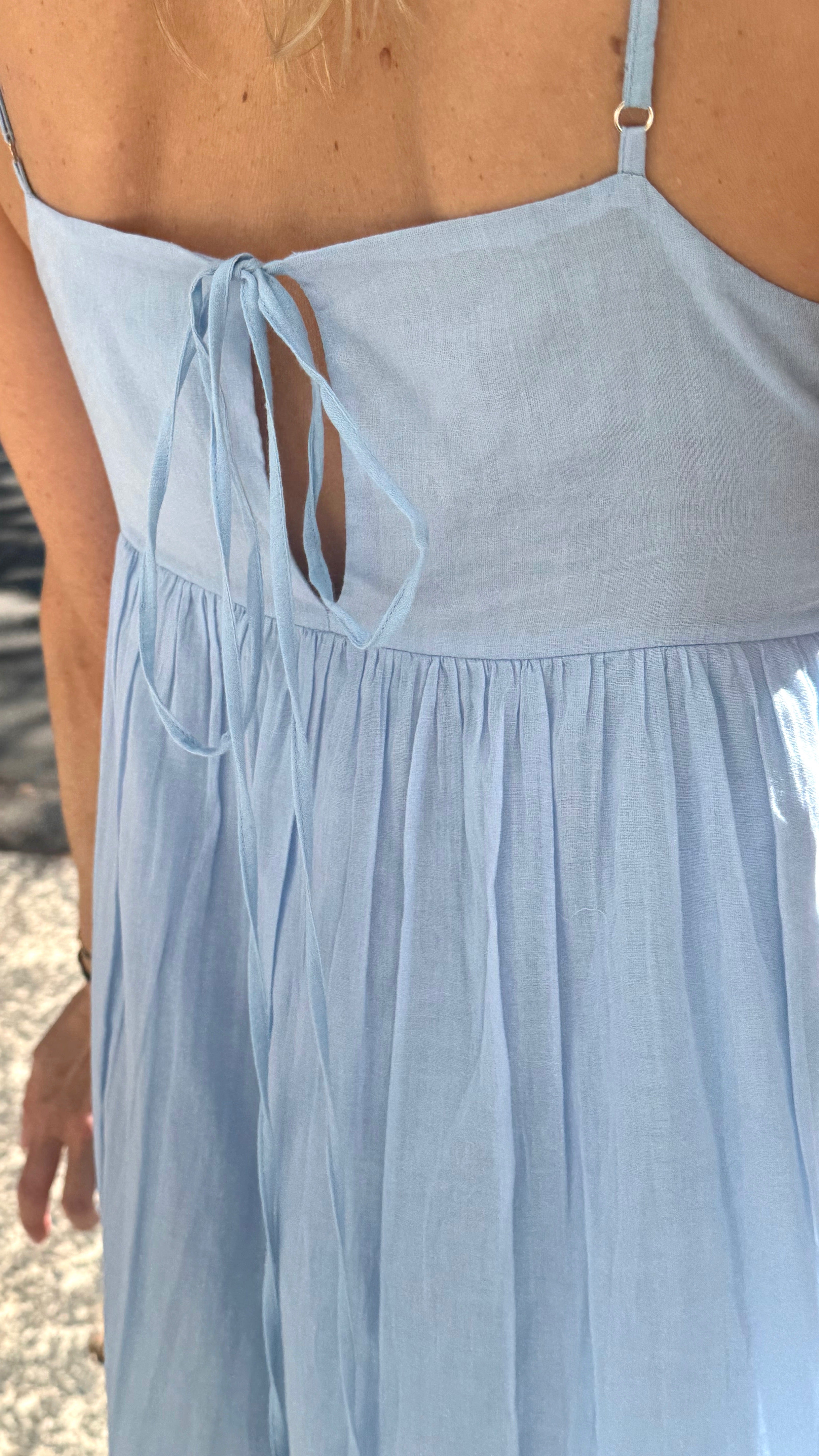 A babydoll style slip dress. Adjustable straps with back tie for fastening. Ruching detail below fitted bodice on the front and back. Fully lined in cotton. A loose, soft fit. Side pockets.