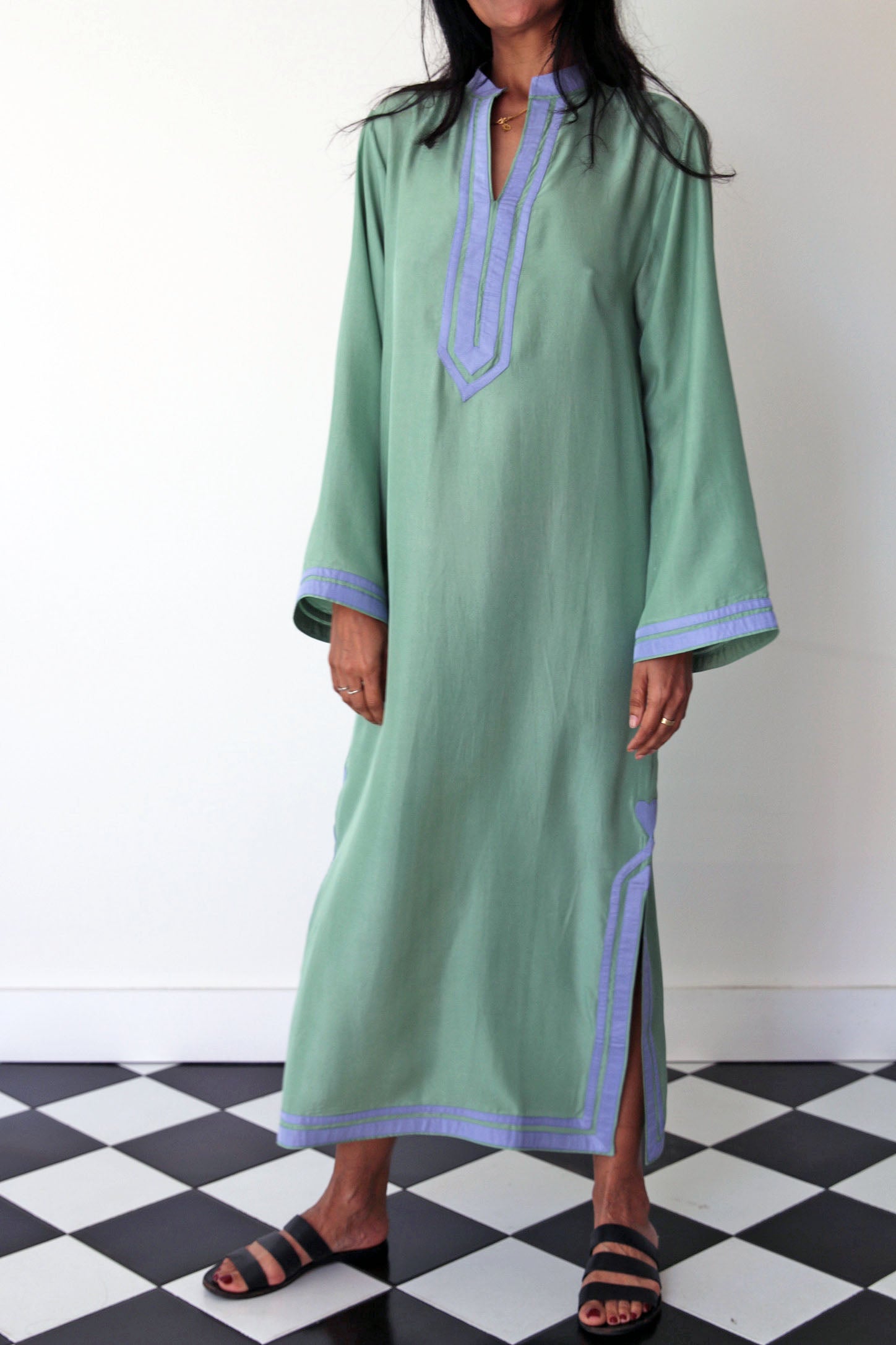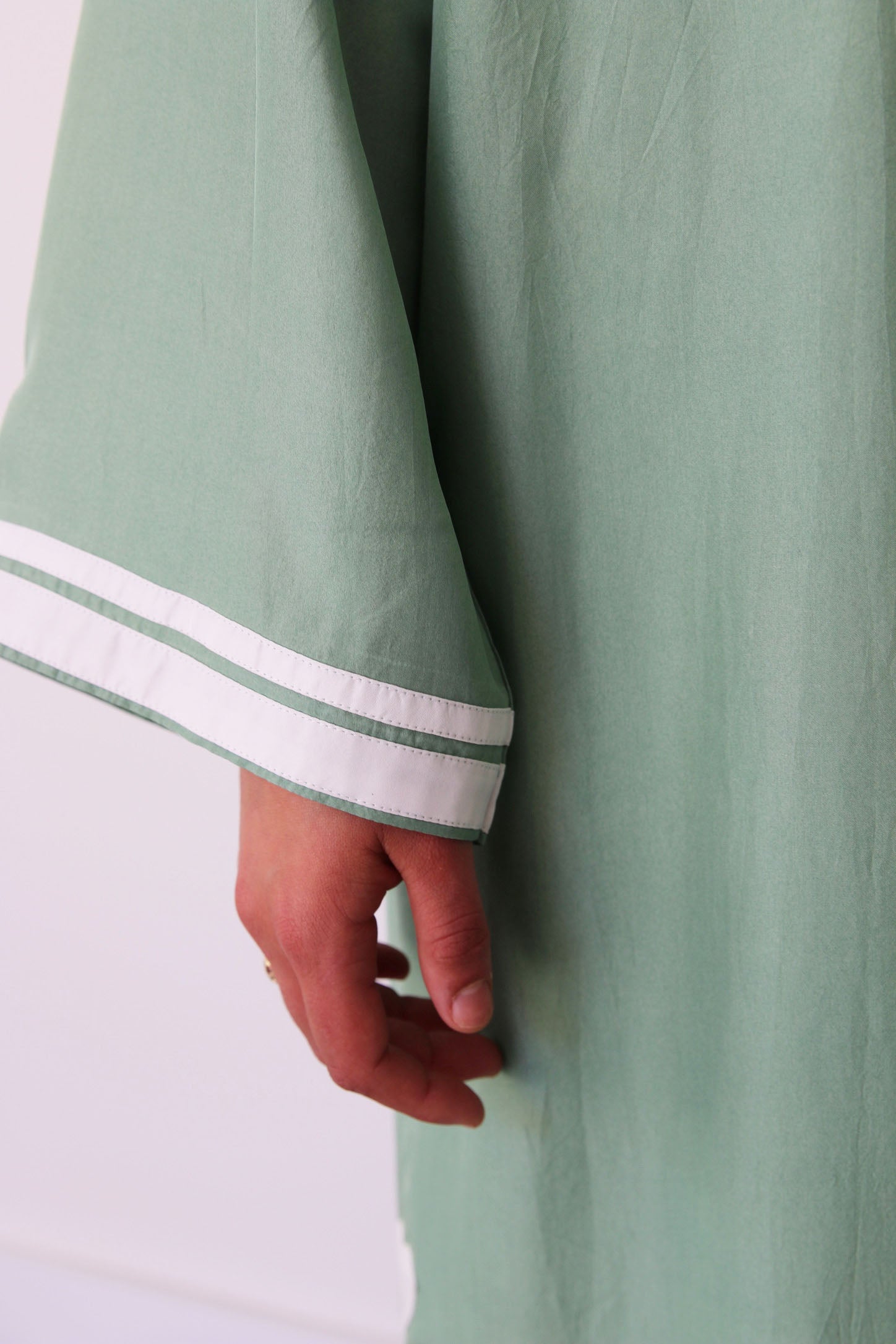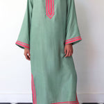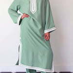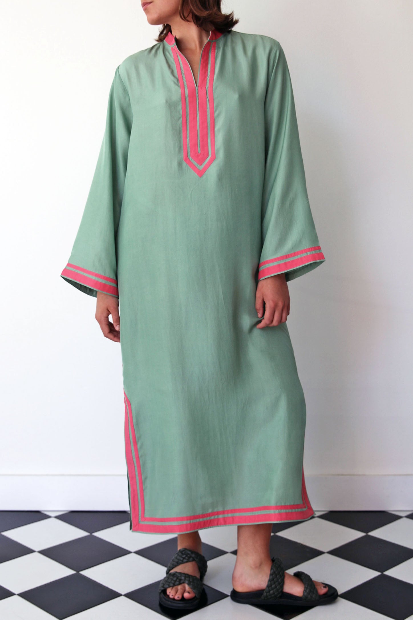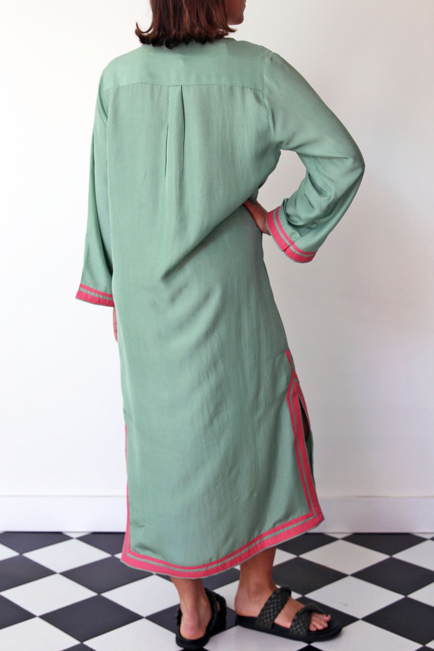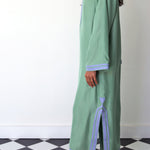 A maxi tunic in 100% silk. Features a straight silhouette with high neck and long bell sleeves. Contrast silk trim detail along neck, sides and hem. White, blue or pink trim options. Hand cut and stitched heart detail on sides. Side slits. Can be paired over pants or worn on it's own.