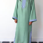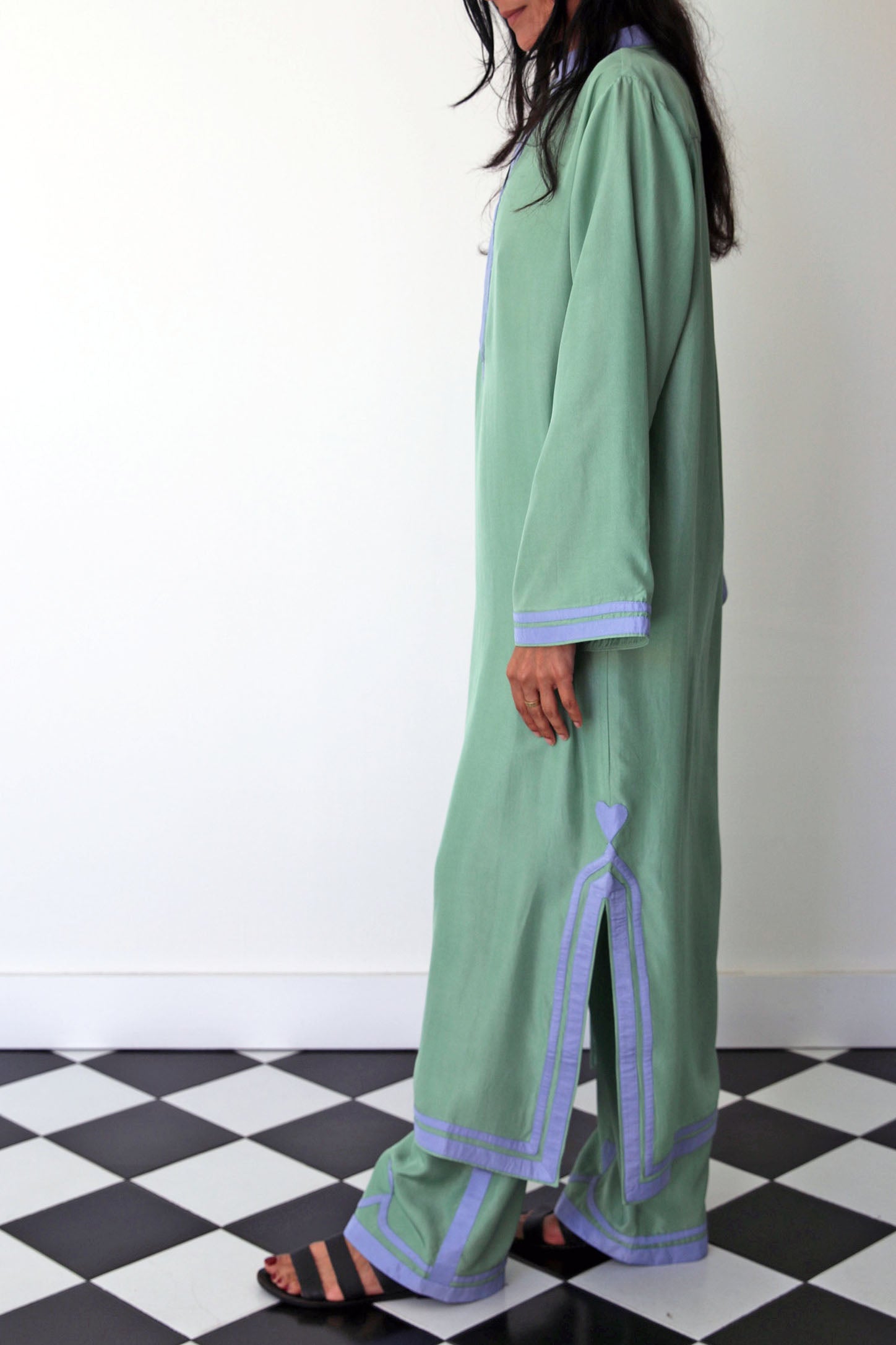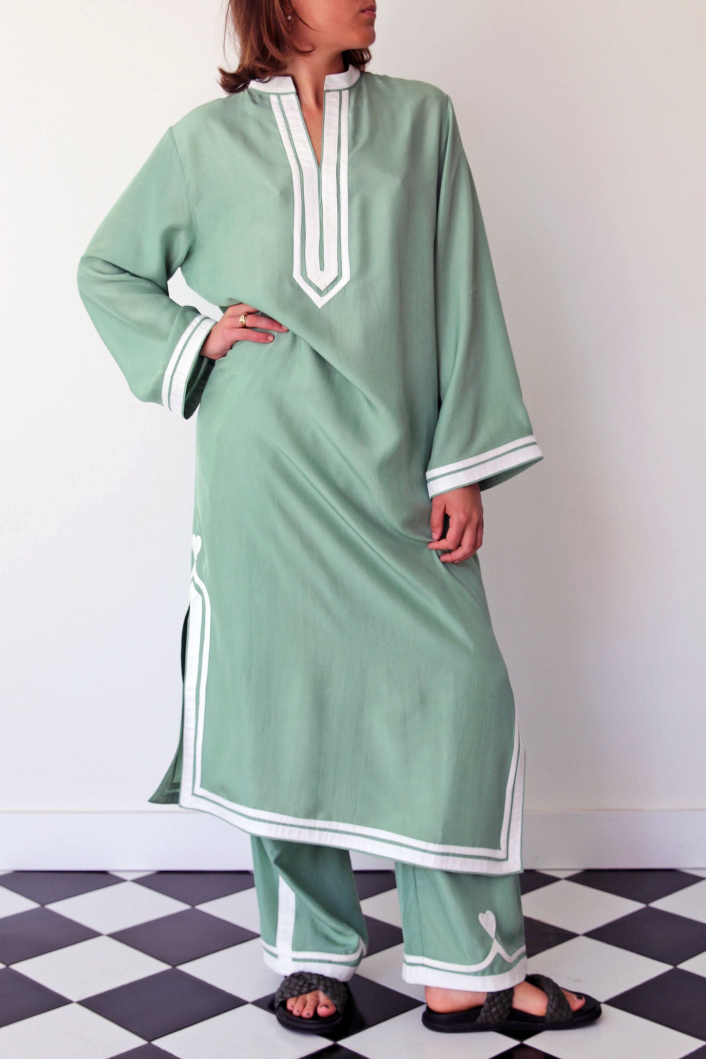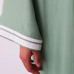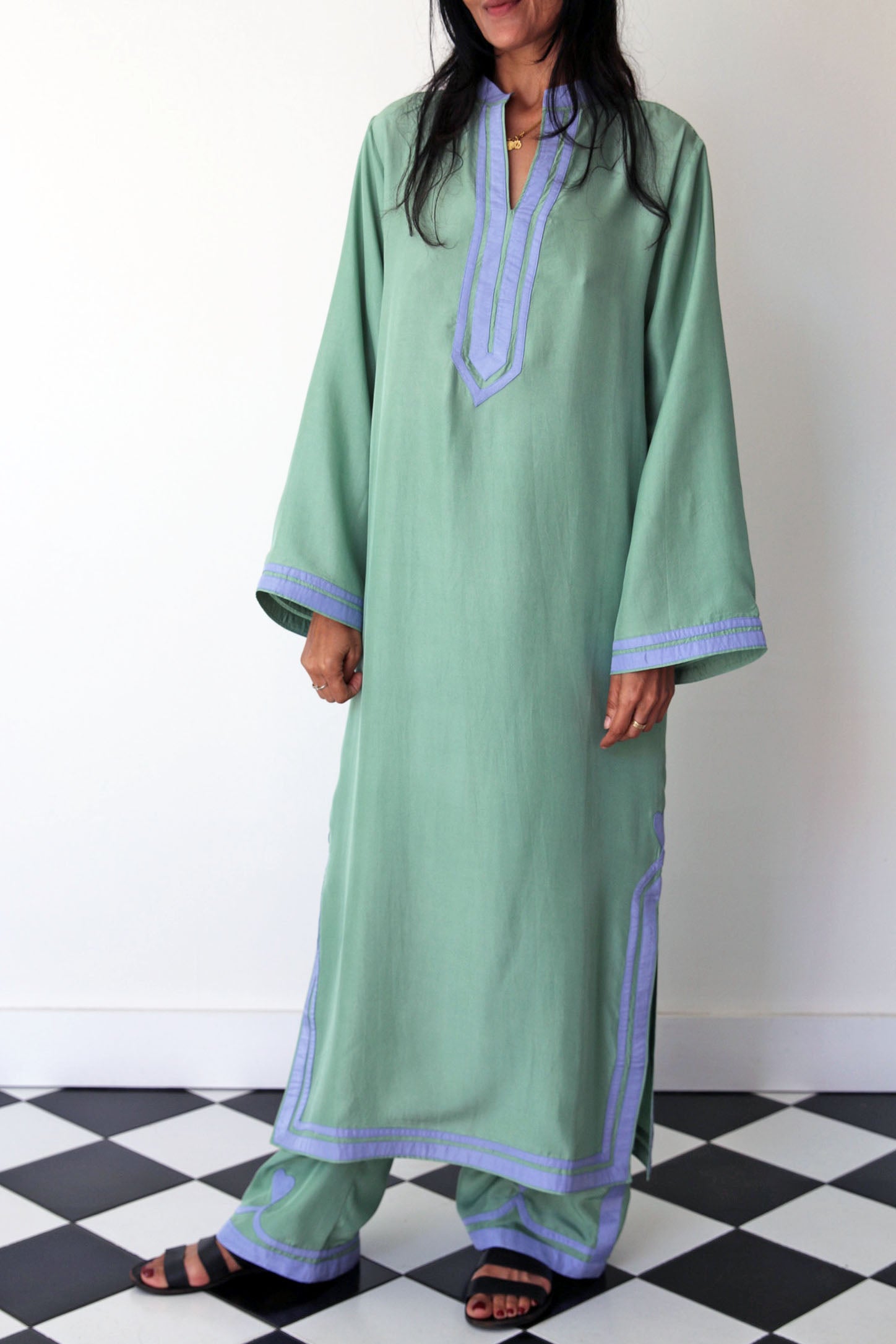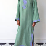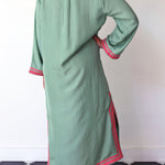 A maxi tunic in 100% silk. Features a straight silhouette with high neck and long bell sleeves. Contrast silk trim detail along neck, sides and hem. White, blue or pink trim options. Hand cut and stitched heart detail on sides. Side slits. Can be paired over pants or worn on it's own.