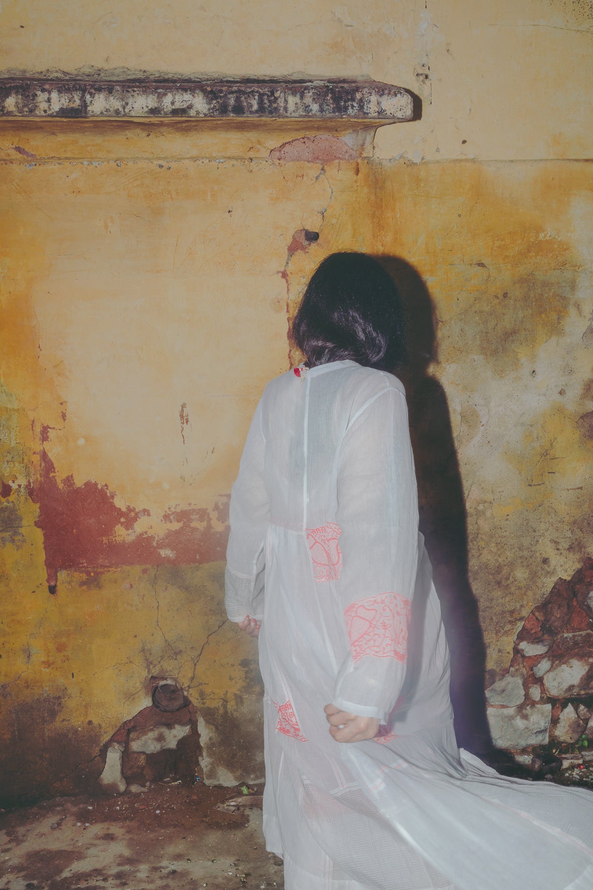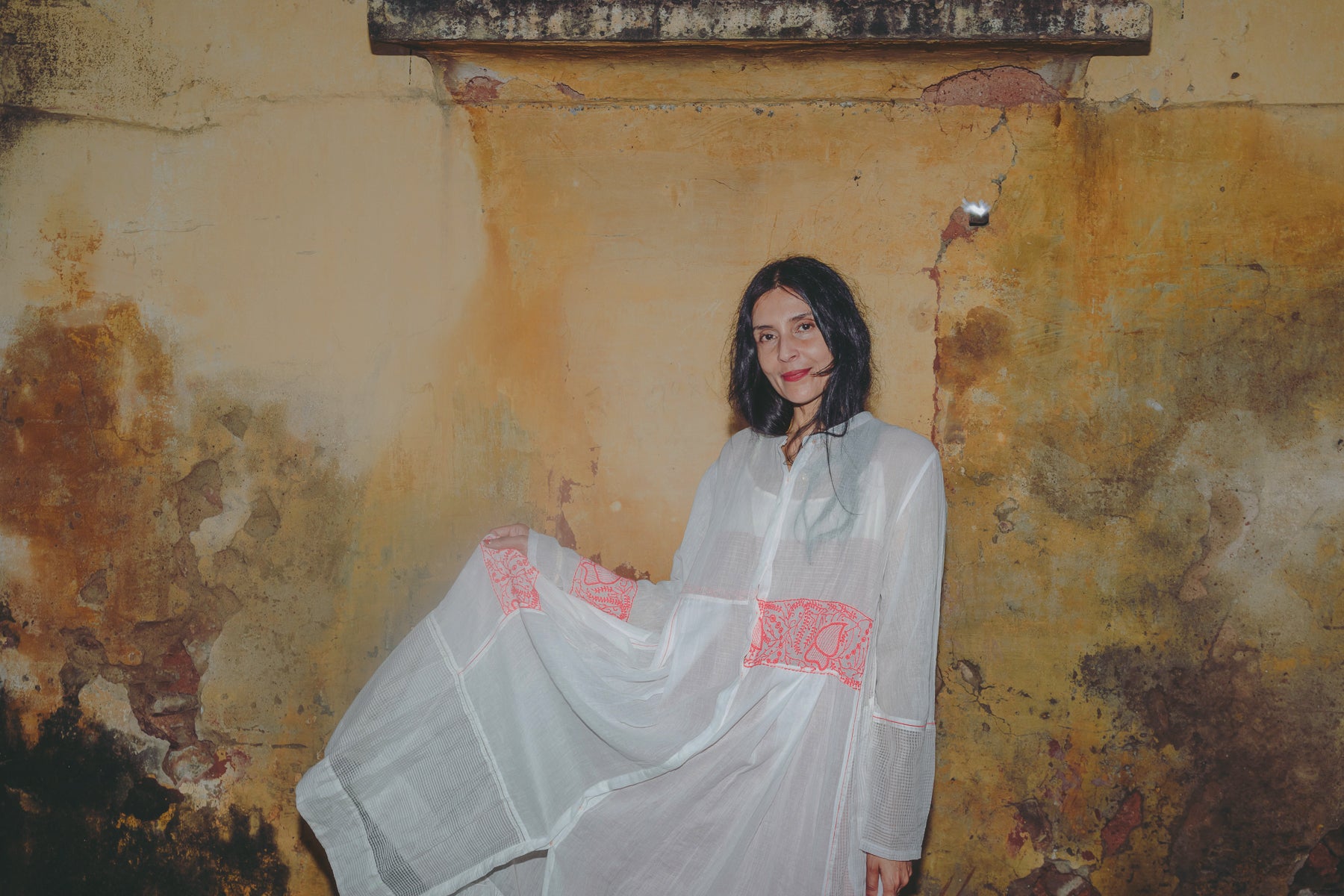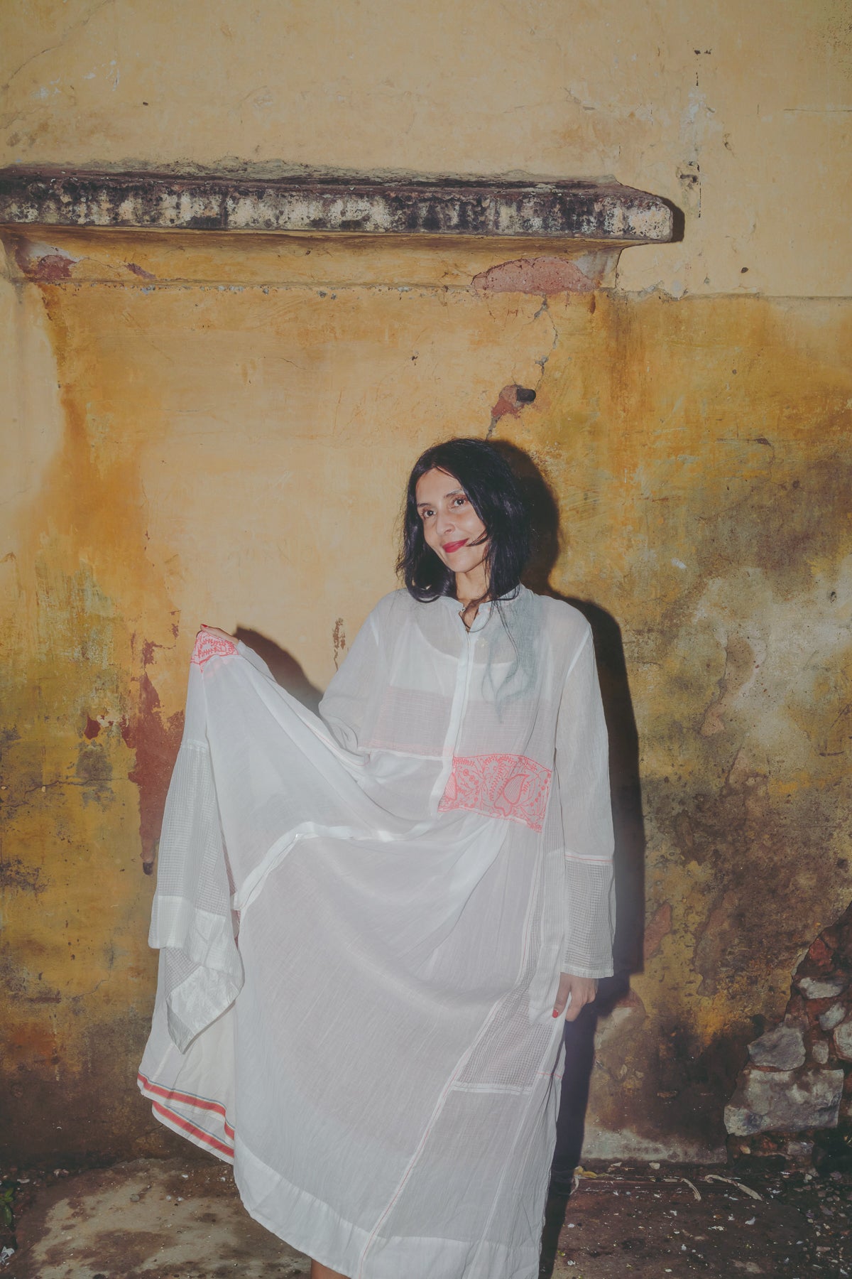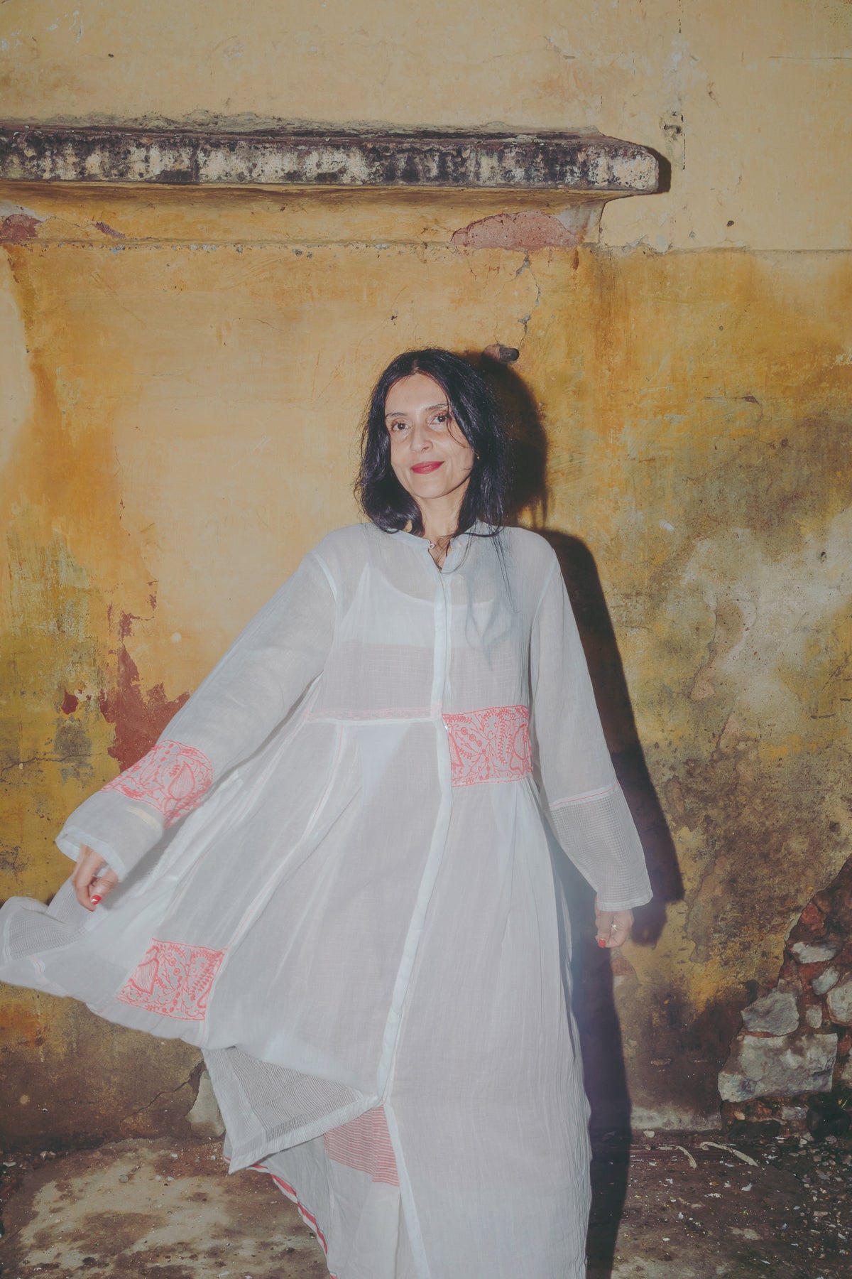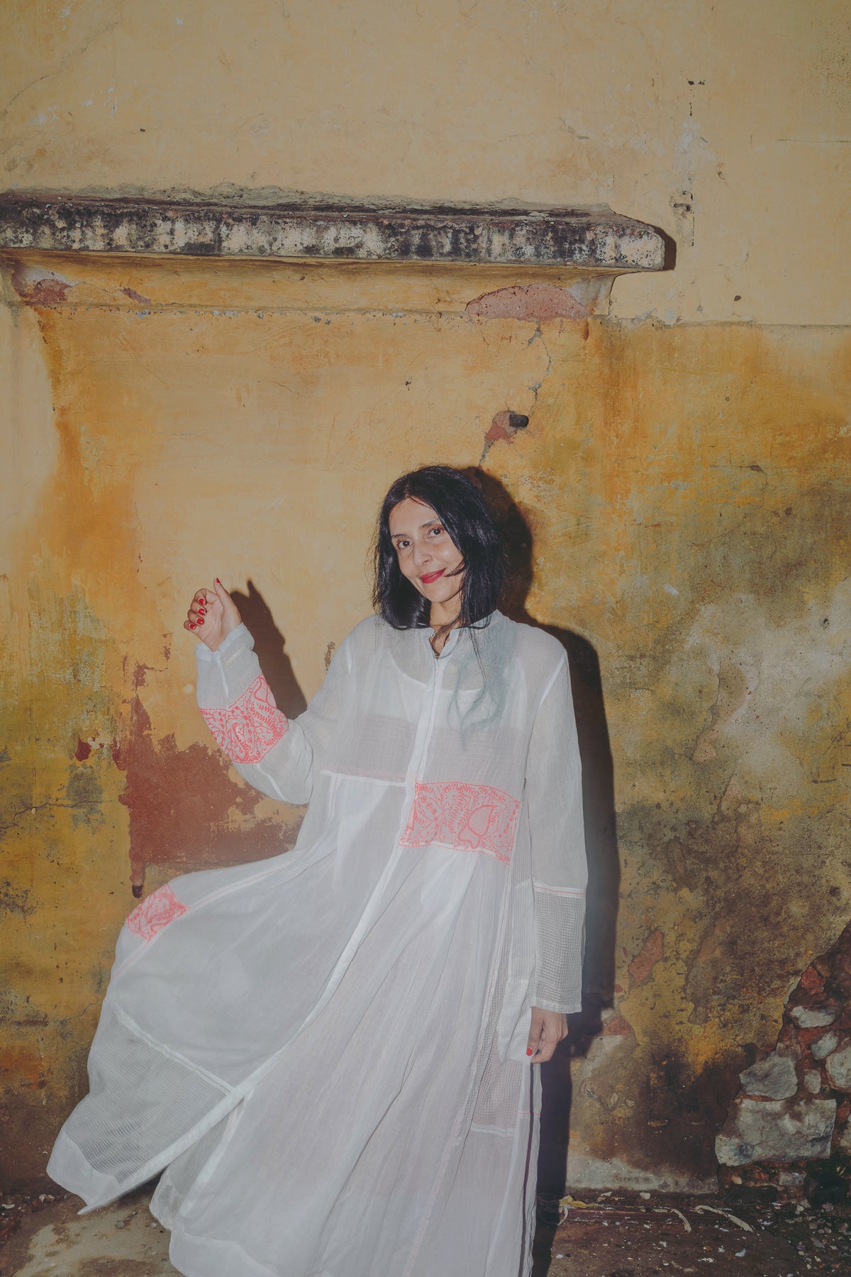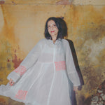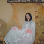 An intricately made handwoven cotton dress. Features a high neck with button down front and concealed placket. Detailed chikan hand-embroidery panels along front and back, sides and sleeve in contrast pink. Interlock embroidery through the dress and sleeves. Side slit pockets. Maxi length. Sheer finish.
