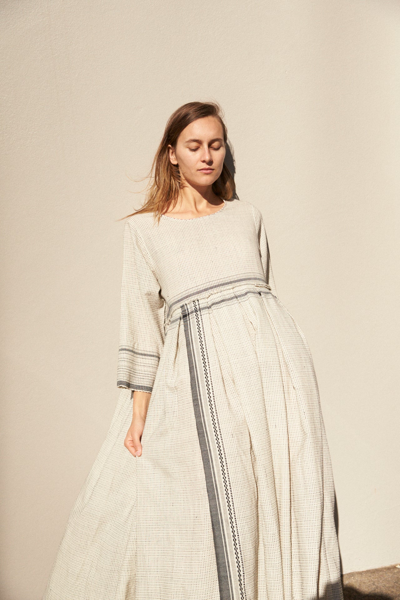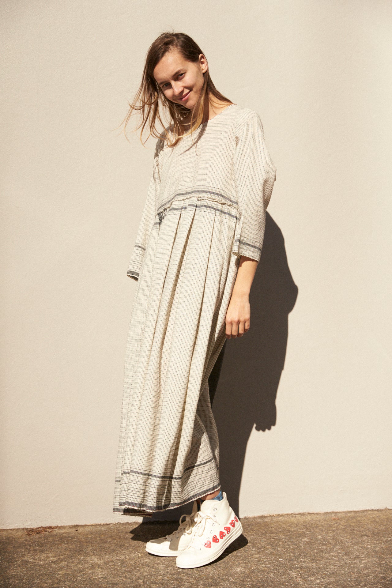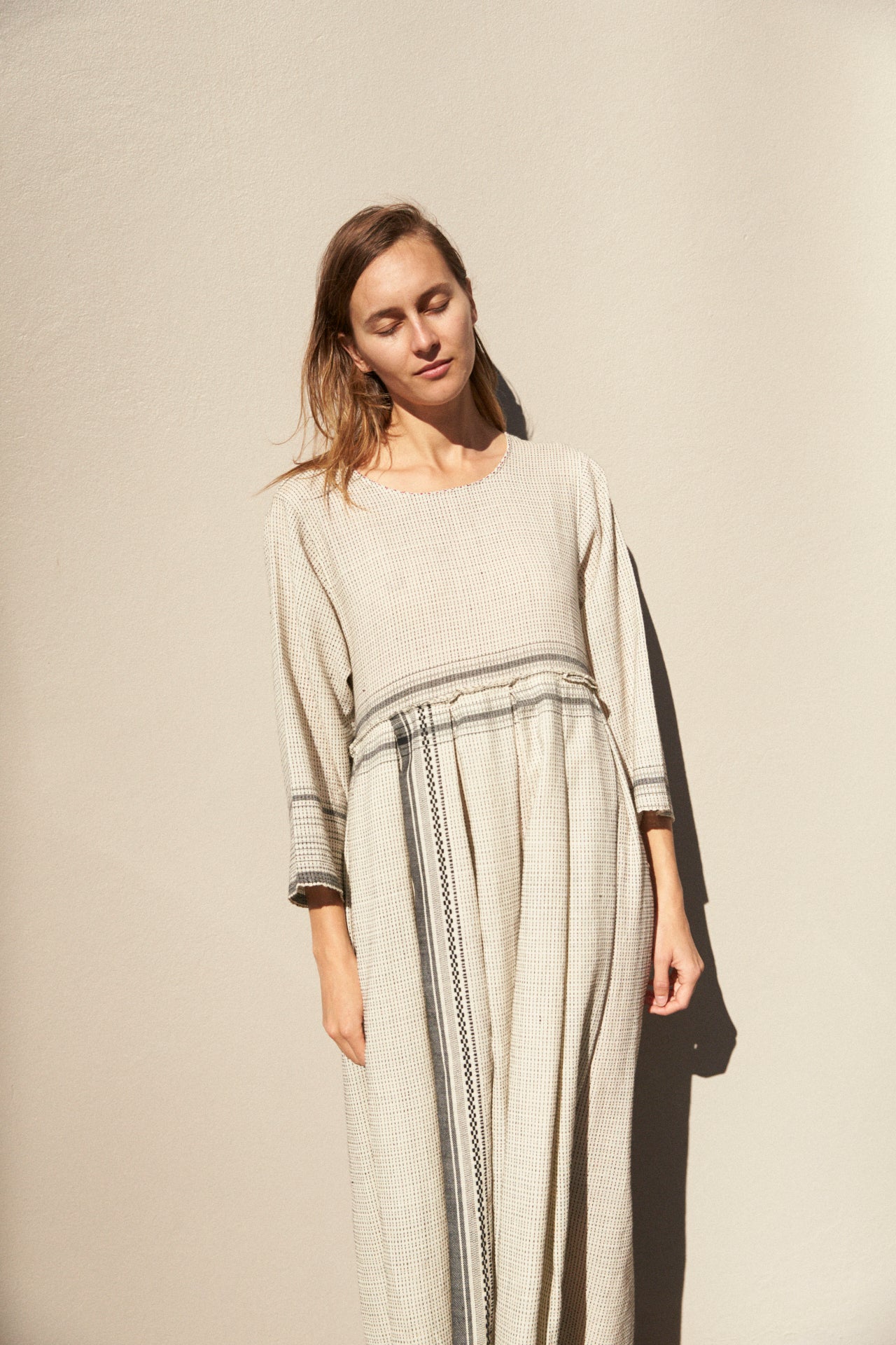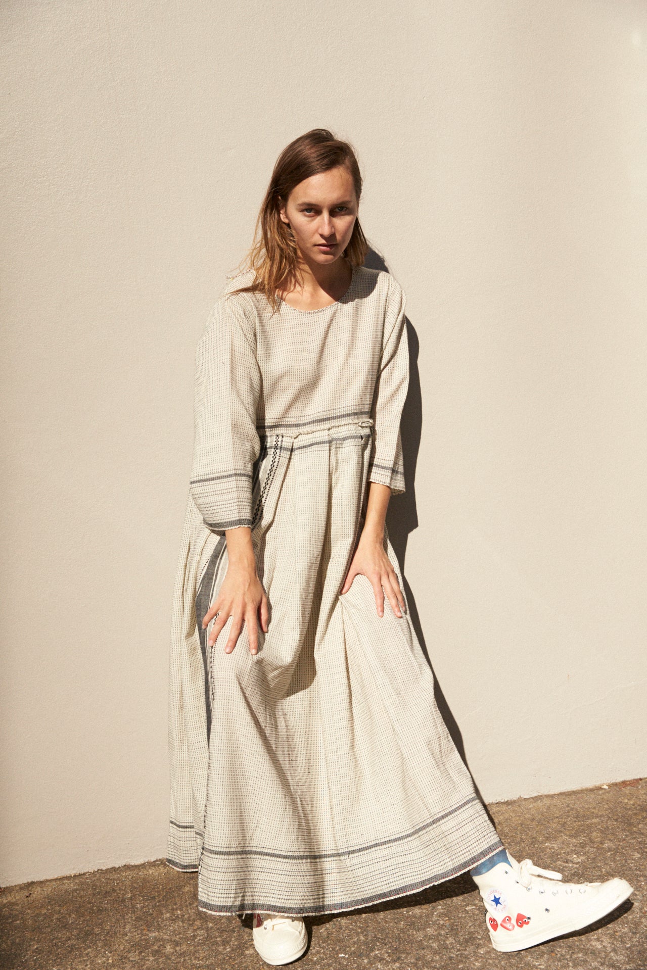 A luxury handloom wool babydoll style dress. Featuring a front round neck and button up back. Contrast pink hand stitch along neckline. Long sleeved with side slit pockets. Slightly oversized with drop shoulders. Horizontal and vertical woven stripes through the dress.